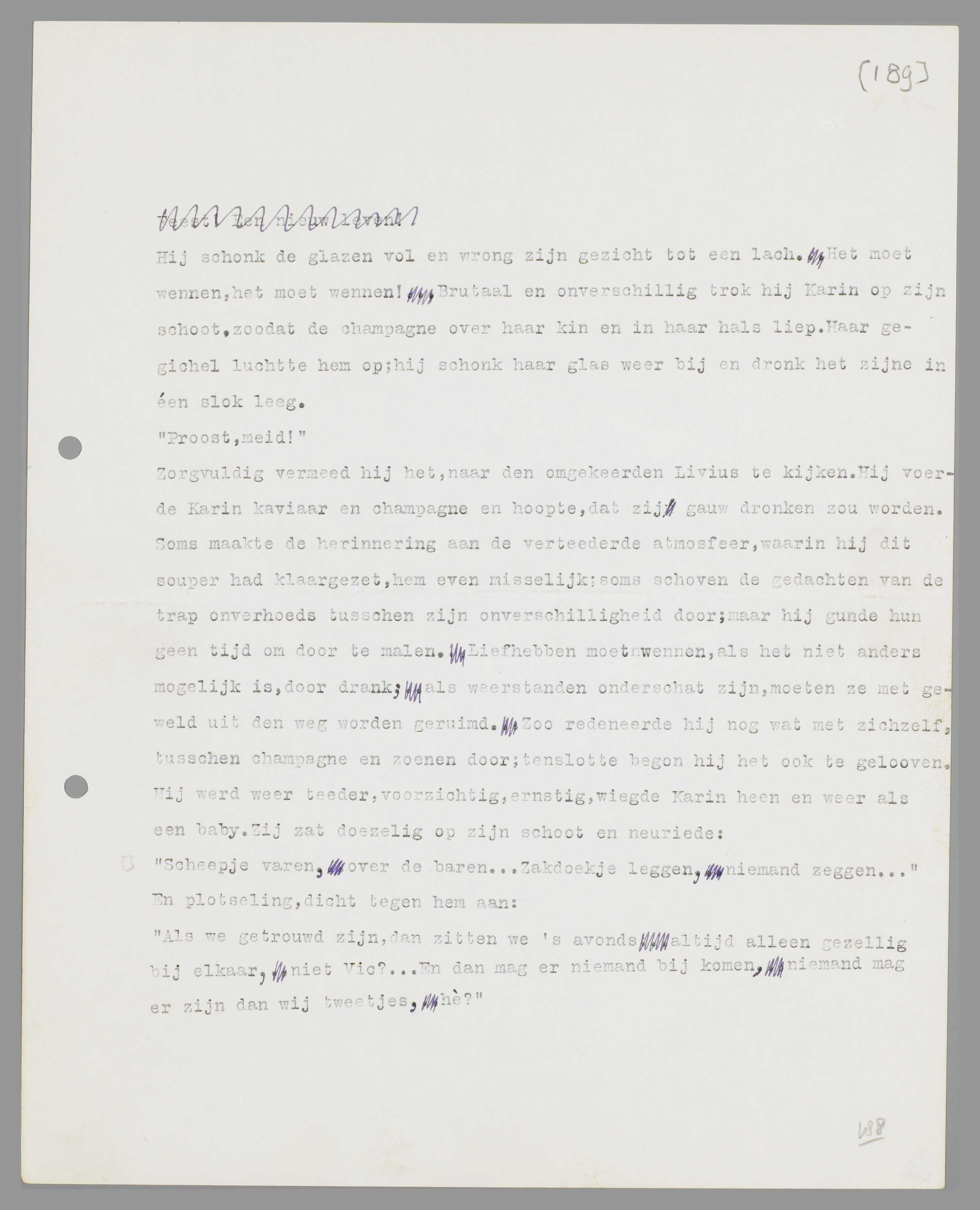 Hij schonk de glazen vol en wrong zijn gezicht tot een lach. Het moet wennen, het moet wennen! Brutaal en onverschillig trok hij Karin op zijn schoot, zoodat de champagne over haar kin en in haar hals liep. Haar gegichel luchtte hem op; hij schonk haar glas weer bij en dronk het zijne in één slok leeg.