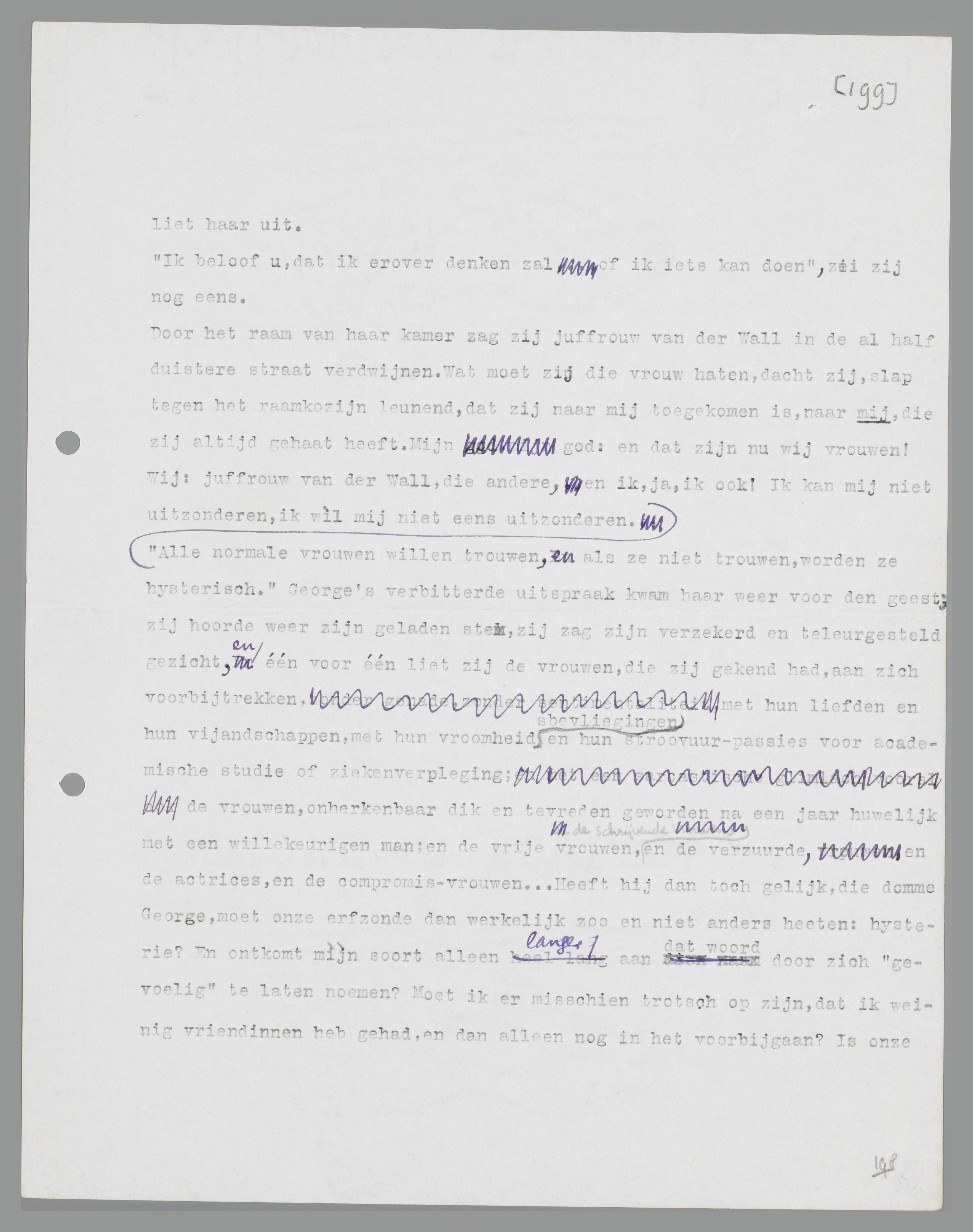 Door het raam van haar kamer zag zij juffrouw van der Wall in de al half duistere straat verdwijnen. Wat moet zij die vrouw haten, dacht zij, slap tegen het raamkozijn leunend, dat zij naar mij toegekomen is, naar mij, die zij altijd gehaat heeft. Mijn God: en dat zijn nu wij vrouwen! Wij: juffrouw van der Wall, die andere, en ik, ja, ik ook! Ik kan mij niet uitzonderen, ik wìl mij niet eens uitzonderen. ‘Alle normale vrouwen willen trouwen, en als ze niet trouwen, worden ze hysterisch.’ George's verbitterde uitspraak kwam haar weer voor den geest; zij hoorde weer zijn geladen stem, zij zag zijn verzekerd en teleurgesteld gezicht, en één voor één liet zij de vrouwen, die zij gekend had, aan zich voorbijtrekken, met hun liefden en hun vijandschappen, met hun vroomheidsbevliegingen en hun stroovuur-passies voor academische studie of ziekenverpleging; de vrouwen, onherkenbaar dik en tevreden geworden na een jaar huwelijk met een willekeurigen man; en de vrije vrouwen, de schrijvende en de verzuurde, en de actrices, en de compromis-vrouwen... Heeft hij dan toch gelijk, die domme George, moet onze erfzonde dan werkelijk zoo en niet anders heeten: hysterie? En ontkomt mìjn soort alleen langer aan dat woord door zich ‘gevoelig’ te laten noemen? Moet ik er misschien trotsch op zijn, dat ik weinig vriendinnen heb gehad, en dan alleen nog in het voorbijgaan? Is onze eenige