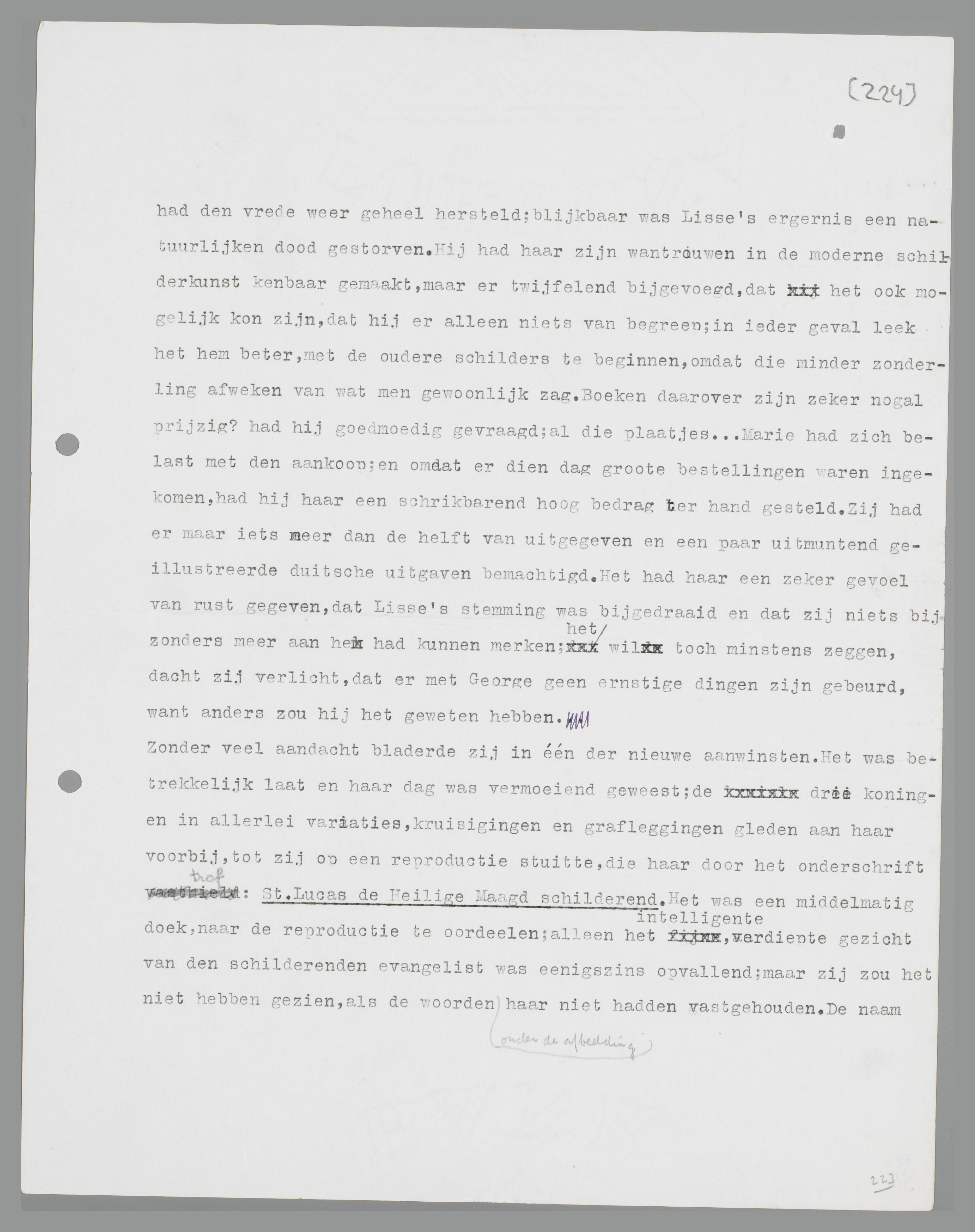 Zonder veel aandacht bladerde zij in één der nieuwe aanwinsten. Het was betrekkelijk laat en haar dag was vermoeiend geweest; de drie koningen in allerlei variaties, kruisigingen en grafleggingen gleden aan haar voorbij, tot zij op een reproductie stuitte, die haar door het onderschrift trof: St. Lucas de Heilige Maagd schilderend. Het was een middelmatig doek, naar de reproductie te oordeelen; alleen het intelligente, verdiepte gezicht van den schilderenden evangelist was eenigszins opvallend; maar zij zou het niet hebben gezien, als de woorden onder de afbeelding haar niet hadden vastgehouden. De naam Lucas voerde haar terug naar den avond, dien zij vergeefs uit haar gedachten trachtte te verbannen; en verder, naar het fanatieke verhaal van juffrouw van der Wall, waaraan zij zich verbood waarde te hechten en dat haar toch niet losliet. Ik bedank ervoor, zei zij telkens koppig tegen zichzelf, om mij te bemoeien met iets, waar ik niet mee te maken heb en dat mij is opgedrongen door de praatjes van een hysterica... Maar terwijl zij nog rede-