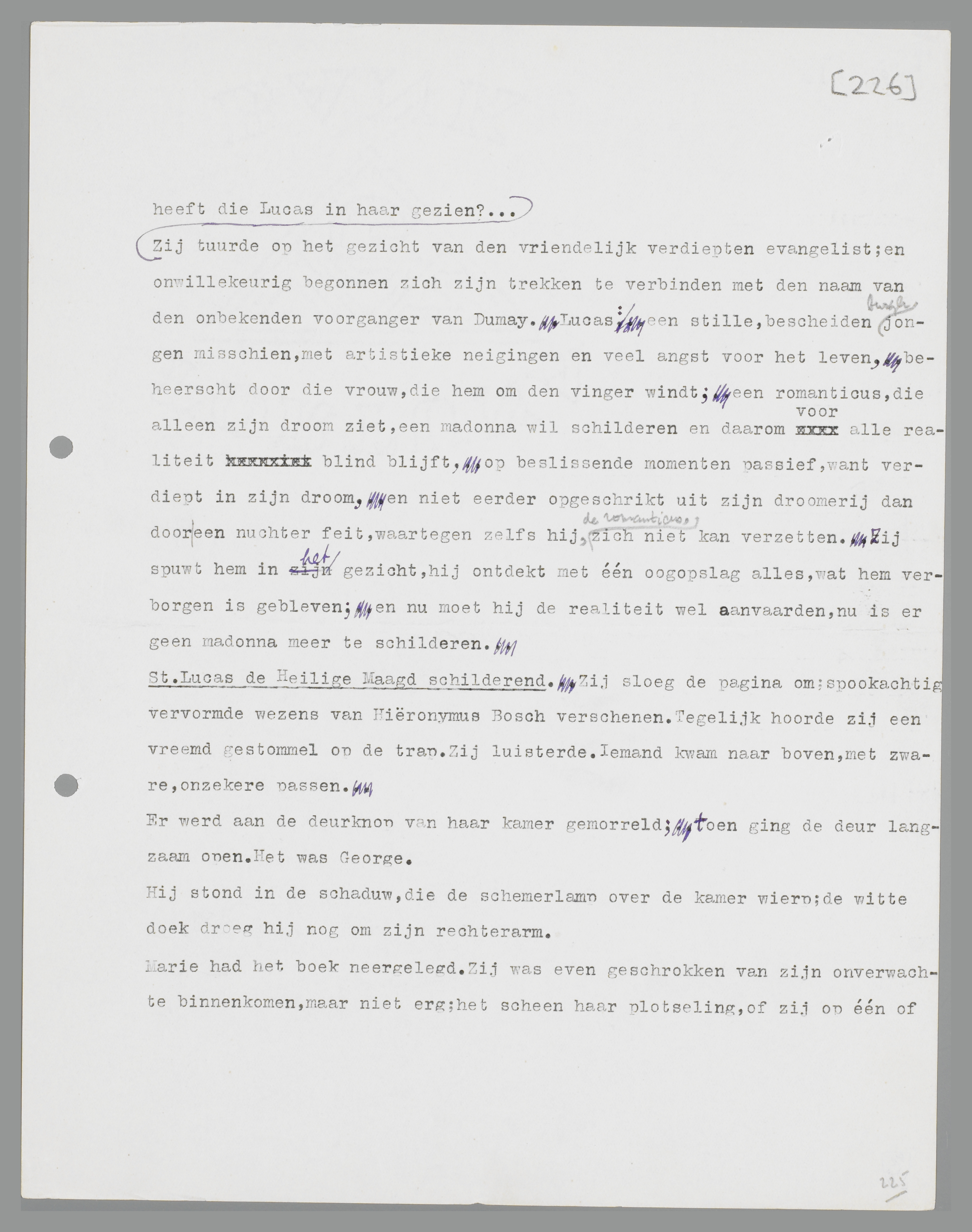 Over Lucas had juffrouw van der Wall het gehad, de slang had Lucas in het gezicht gespuwd, en op die vrouw was Victor verliefd, daar wilde hij mee trouwen. Wat zou hij in haar zien, wat heeft die Lucas in haar gezien?... Zij tuurde op het gezicht van den vriendelijk verdiepten evangelist; en onwillekeurig begonnen zich zijn trekken te verbinden met den naam van den onbekenden voorganger van Dumay. Lucas: een stille, bescheiden burgerjongen misschien, met artistieke neigingen en veel angst voor het leven, beheerscht door die vrouw, die hem om den vinger windt; een romanticus, die alleen zijn droom ziet, een madonna wil schilderen en daarom voor alle realiteit blind blijft; op beslissende momenten passief, want verdiept in zijn droom, en niet eerder opgeschrikt uit zijn droomerij dan door een nuchter feit, waartegen zelfs hij, de romanticus, zich niet kan verzetten. Zij spuwt hem in het gezicht, hij ontdekt met één oogopslag alles, wat hem verborgen is gebleven; en nu moet hij de realiteit wel aanvaarden, nu is er geen madonna meer te schilderen.