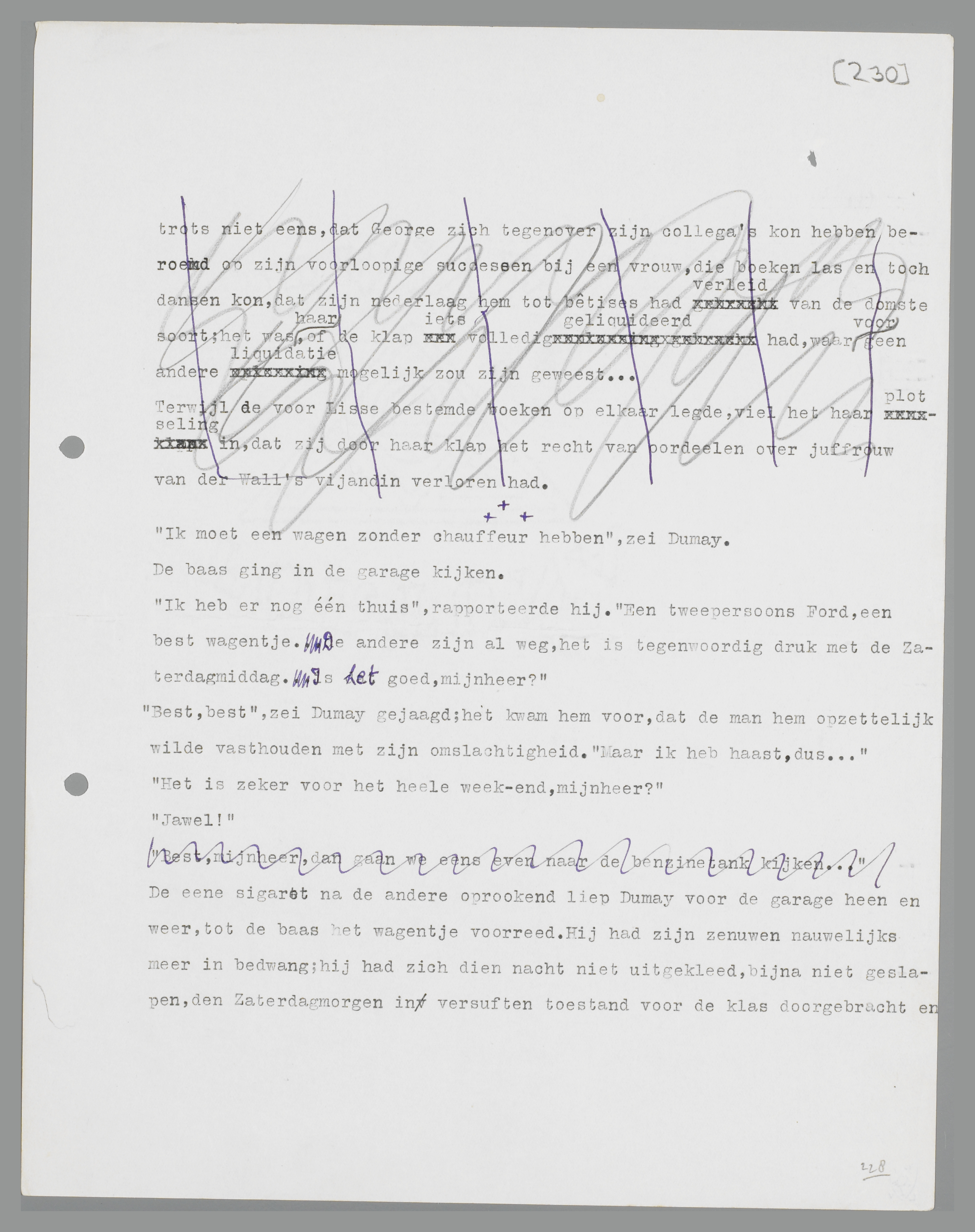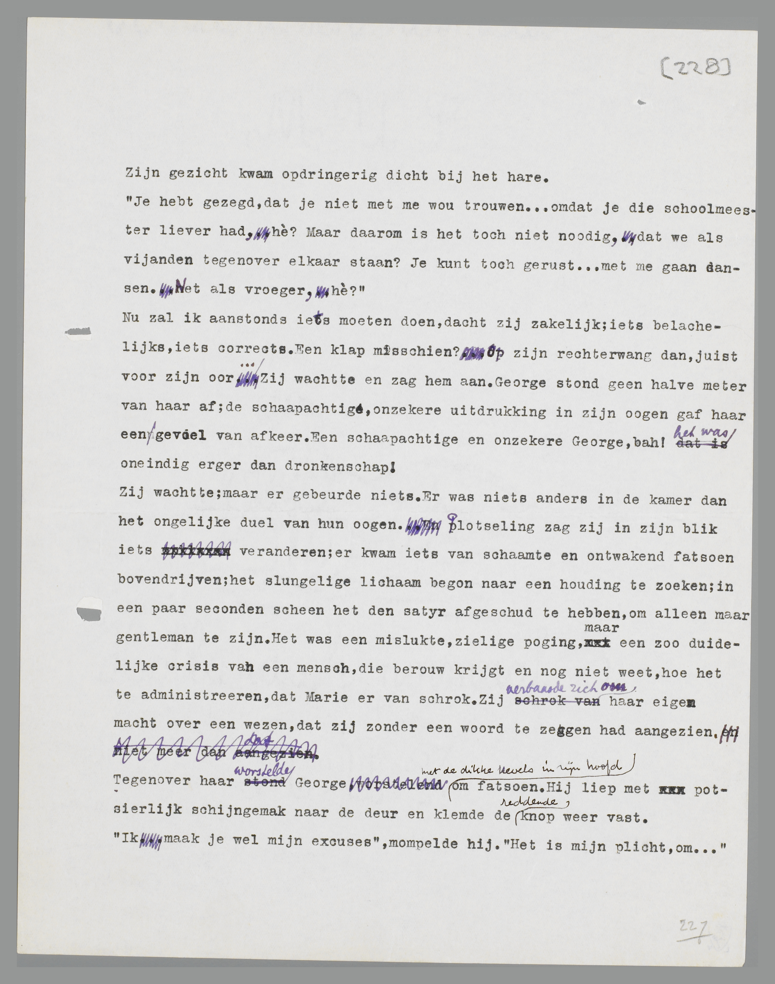 Nu zal ik aanstonds iets moeten doen, dacht zij zakelijk; iets belachelijks, iets corrects. Een klap misschien? Op zijn rechterwang dan, juist voor zijn oor... Zij wachtte en zag hem aan. George stond geen halven meter van haar af; de schaapachtige, onzekere uitdrukking in zijn oogen gaf haar een gevoel van afkeer. Een schaapachtige en onzekere George, bah! het was oneindig erger dan dronkenschap!