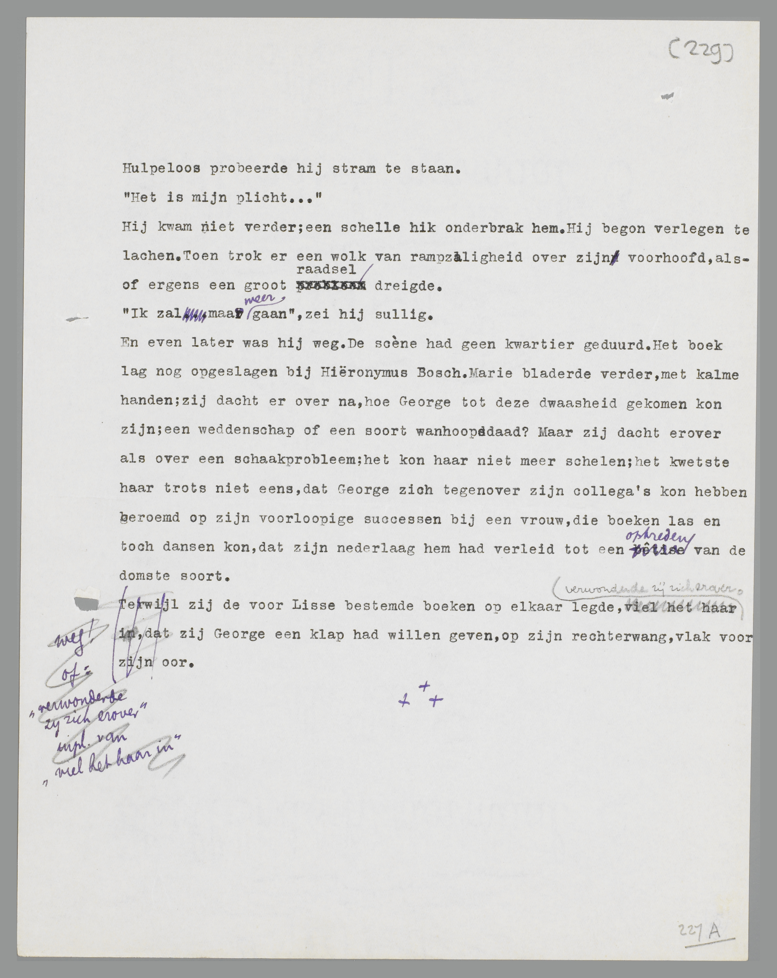 En even later was hij weg. De scène had geen kwartier geduurd. Het boek lag nog opengeslagen bij Hiëronymus Bosch. Marie bladerde verder, met kalme handen; zij dacht erover na, hoe George tot deze dwaasheid gekomen kon zijn; een weddenschap of een soort wanhoopsdaad? maar zij dacht erover als over een schaakprobleem; het kon haar niet meer schelen; het kwetste haar trots niet eens, dat George zich tegenover zijn collega's kon hebben beroemd op zijn voorloopige successen bij een vrouw, die boeken las en toch dansen kon, dat zijn nederlaag hem had verleid tot een optreden van de domste soort.