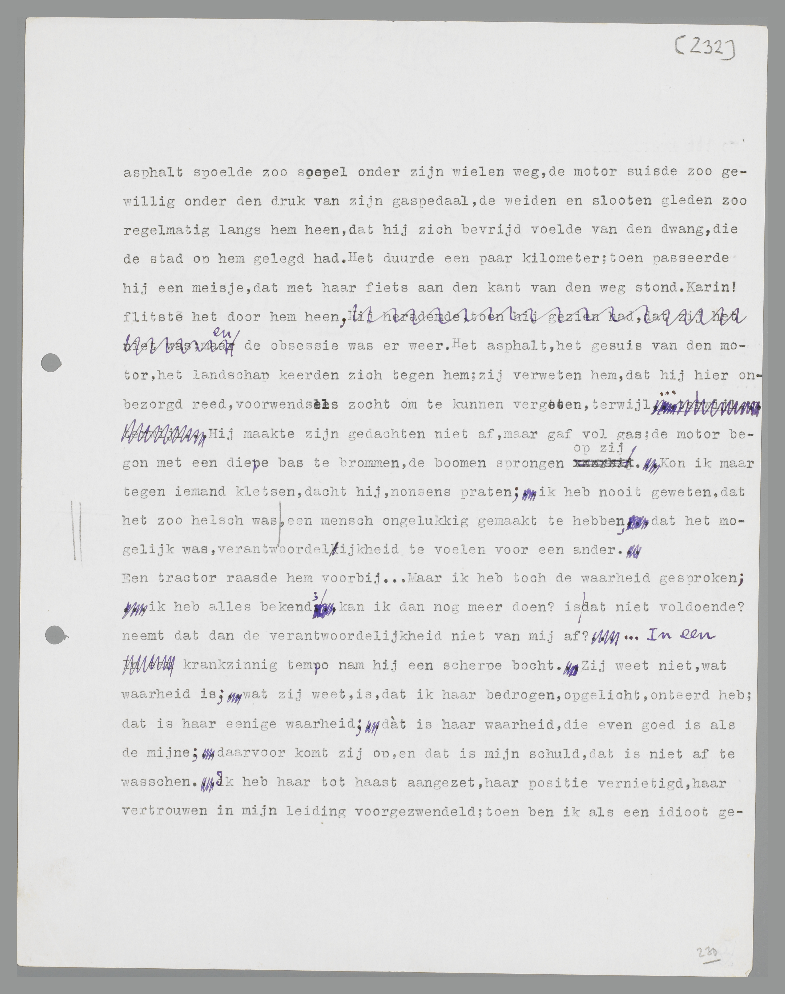 Buiten de stad kalmeerde hem even de gezonde stilte van het landschap. Het asphalt spoelde zoo soepel onder zijn wielen weg, de motor suisde zoo gewillig onder den druk van zijn gaspedaal, de weiden en slooten gleden zoo regelmatig langs hem heen, dat hij zich bevrijd voelde van den dwang, die de stad op hem gelegd had. Het duurde een paar kilometer; toen passeerde hij een meisje, dat met haar fiets aan den kant van den weg stond. Karin! flitste het door hem heen, en de obsessie was er weer. Het asphalt, het gesuis van den motor, het landschap keerden zich tegen hem; zij verweten hem, dat hij hier onbezorgd reed, voorwendsels zocht om te kunnen vergeten, terwijl... Hij maakte zijn gedachten niet af, maar gaf vol gas; de motor begon met een diepe bas te brommen, de boomen sprongen op zij. Kon ik maar tegen iemand kletsen, dacht hij, nonsens praten; ik heb nooit geweten, dat het zoo helsch was, een mensch ongelukkig gemaakt te hebben, dat het mogelijk was, verantwoordelijkheid te voelen voor een ander.
