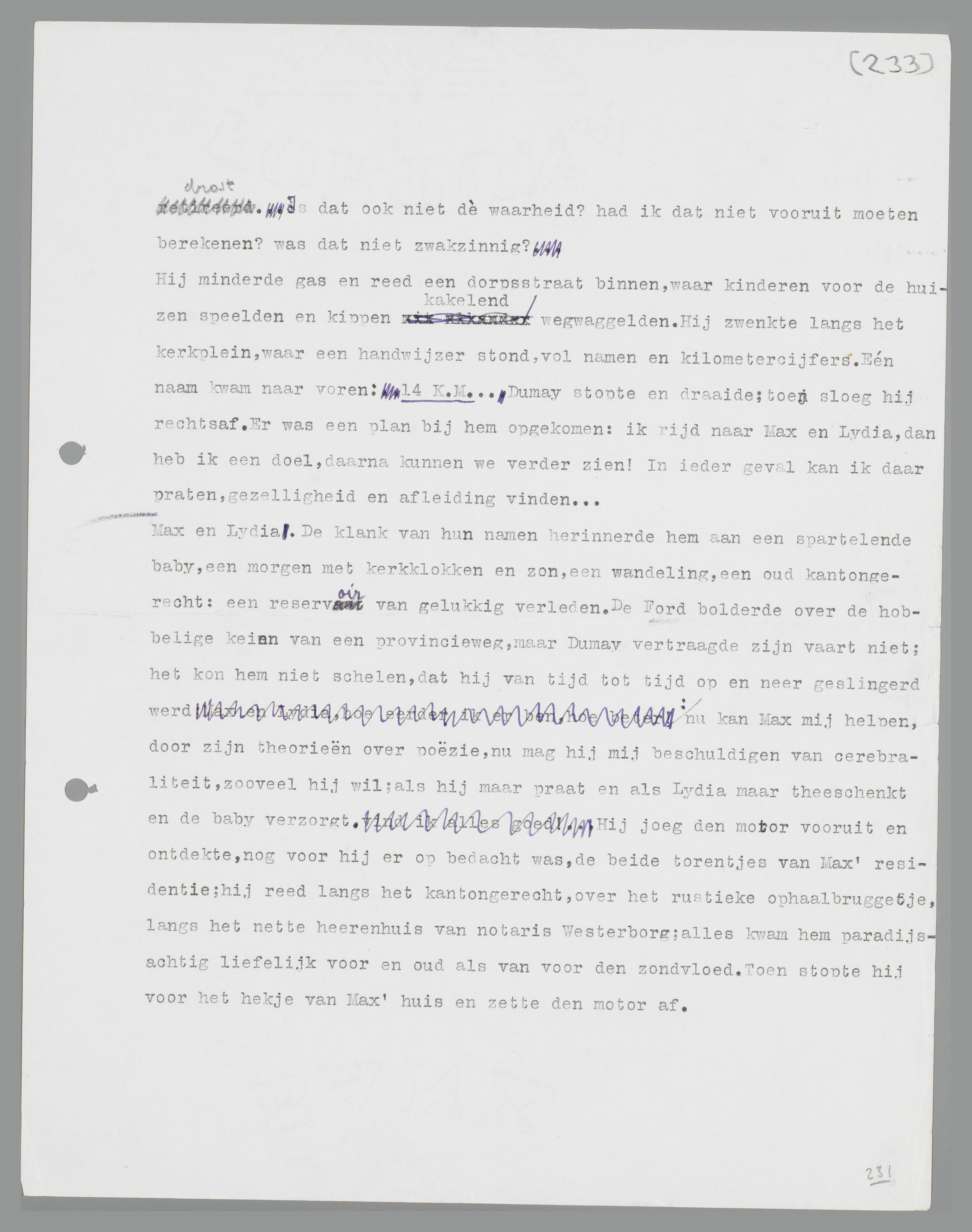 Max en Lydia. De klank van hun namen herinnerde hem aan een spartelende baby, een morgen met kerkklokken en zon, een wandeling, een oud kantongerecht: een reservoir van gelukkig verleden. De Ford bolderde over de hobbelige keien van een provincieweg, maar Dumay vertraagde zijn vaart niet; het kon hem niet schelen, dat hij van tijd tot tijd op en neer geslingerd werd; nu kan Max mij helpen, door zijn theorieën over poëzie, nu mag hij mij beschuldigen van cerebraliteit, zooveel als hij wil; als hij maar praat en als Lydia maar theeschenkt en de baby verzorgt! Hij joeg den motor vooruit en ontdekte, nog voor hij er op bedacht was, de beide torentjes van Max' residen-