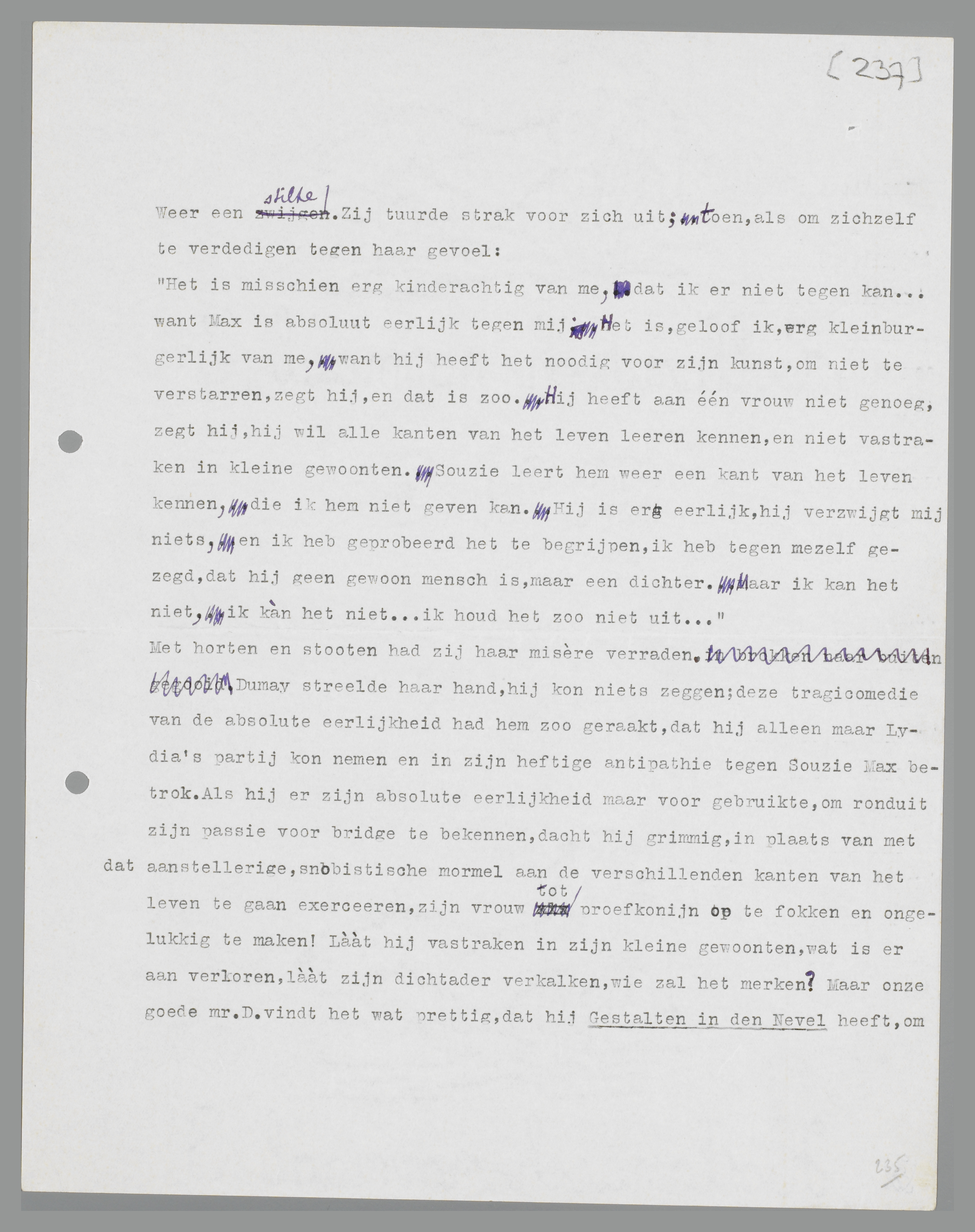 Met horten en stooten had zij haar misère verraden. Dumay streelde haar hand, hij kon niets zeggen; deze tragi-comedie van de absolute eerlijkheid had hem zoo geraakt, dat hij alleen maar Lydia's partij kon nemen en in zijn heftige antipathie tegen Souzie Max betrok. Als hij er zijn absolute eerlijkheid maar voor gebruikte, om ronduit zijn passie voor bridge te bekennen, dacht hij grimmig, in plaats van met dat aanstellerige, snobistische mormel aan de verschillende kanten van het leven te gaan exerceeren, zijn vrouw tot proefkonijn op te fokken en ongelukkig te maken! Láát hij vastraken in zijn kleine gewoonten, wat is er aan verloren, láát zijn dichtader verkalken, wie zal het merken? Maar onze goede mr. D. vindt het wat prettig, dat hij Gestalten in den Nevel heeft, om zijn escapades een mooien naam te geven! Daarvoor moeten dus de woorden ‘kleinburgerlijk’ en ‘verstarring’ den weg vrijmaken!