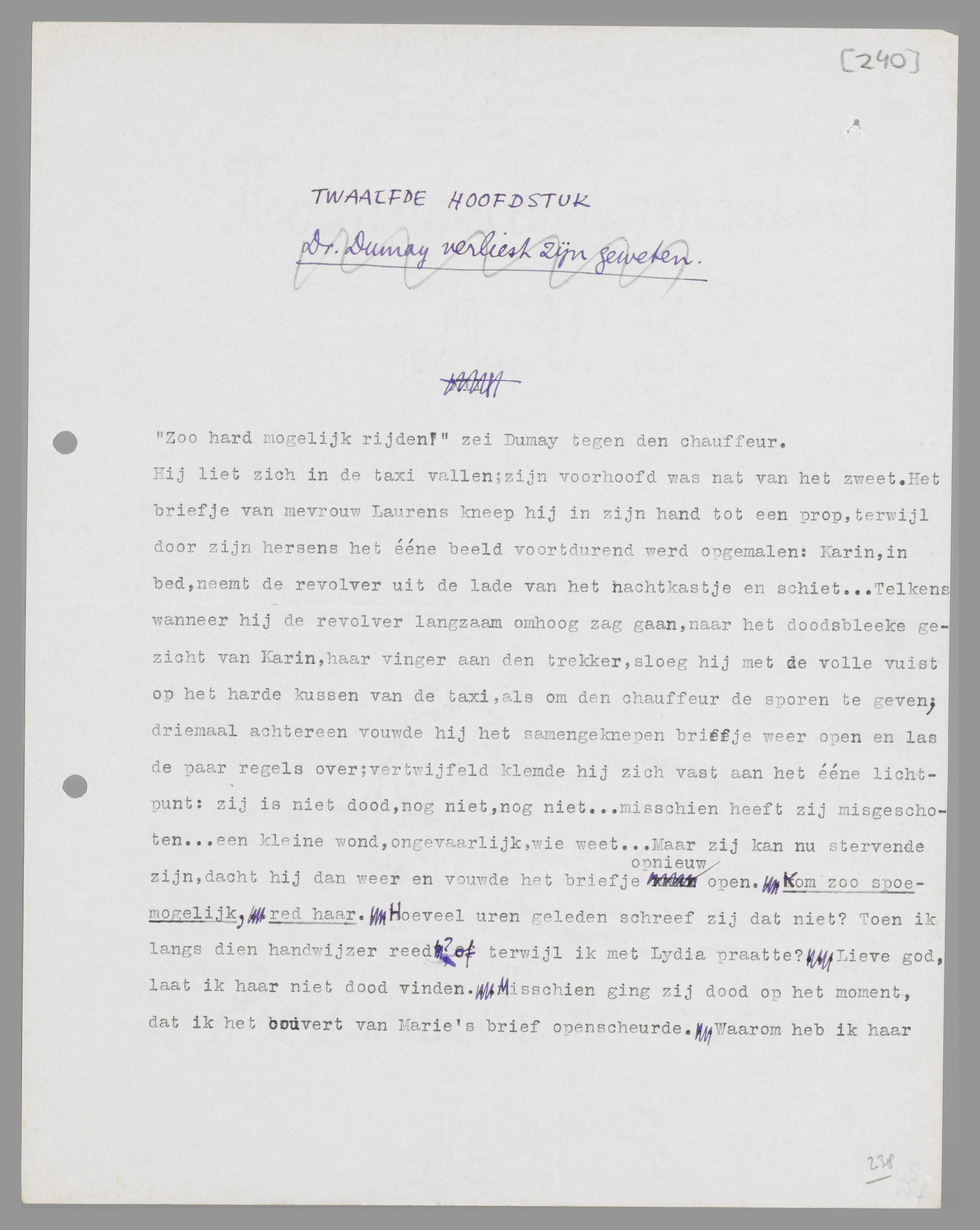 Hij liet zich in de taxi vallen; zijn voorhoofd was nat van het zweet. Het briefje van mevrouw Laurens kneep hij in zijn hand tot een prop, terwijl door zijn hersens het ééne beeld voortdurend werd opgemalen: Karin, in bed, neemt de revolver uit de lade van het nachtkastje en schiet... Telkens wanneer hij de revolver langzaam omhoog zag gaan, naar het doodsbleeke gezicht van Karin, haar vinger aan den trekker, sloeg hij met de volle vuist op het harde kussen van de taxi, als om den chauffeur de sporen te geven; driemaal achtereen vouwde hij het samengeknepen briefje weer open en las de paar regels over; vertwijfeld klemde hij zich vast aan het ééne lichtpunt: zij is niet dood, nog niet, nog niet... misschien heeft zij misgeschoten... een kleine wond, ongevaarlijk, wie weet... Maar zij kan nu stervende zijn, dacht hij dan weer en vouwde het briefje opnieuw open. Kom zoo spoedig mogelijk, red haar. Hoeveel uren geleden schreef zij dat niet? Toen ik langs dien handwijzer reed? of terwijl ik met Lydia praatte? Lieve God, laat ik haar niet dood vinden. Misschien ging zij dood op het moment, dat ik het couvert van Marie's brief openscheurde. Waarom heb ik haar bedreiging met zelfmoord geen seconde ernstig opgenomen, waarom heb ik aan alles eerder geloofd dan aan dat? Hiermee slaat zij mij ieder wapen uit de hand... als zij maar niet dood is, is alles goed... ik zal haar, dat zweer ik, niet meer met mijn waarheid vervolgen. Ik zal... ik weet het