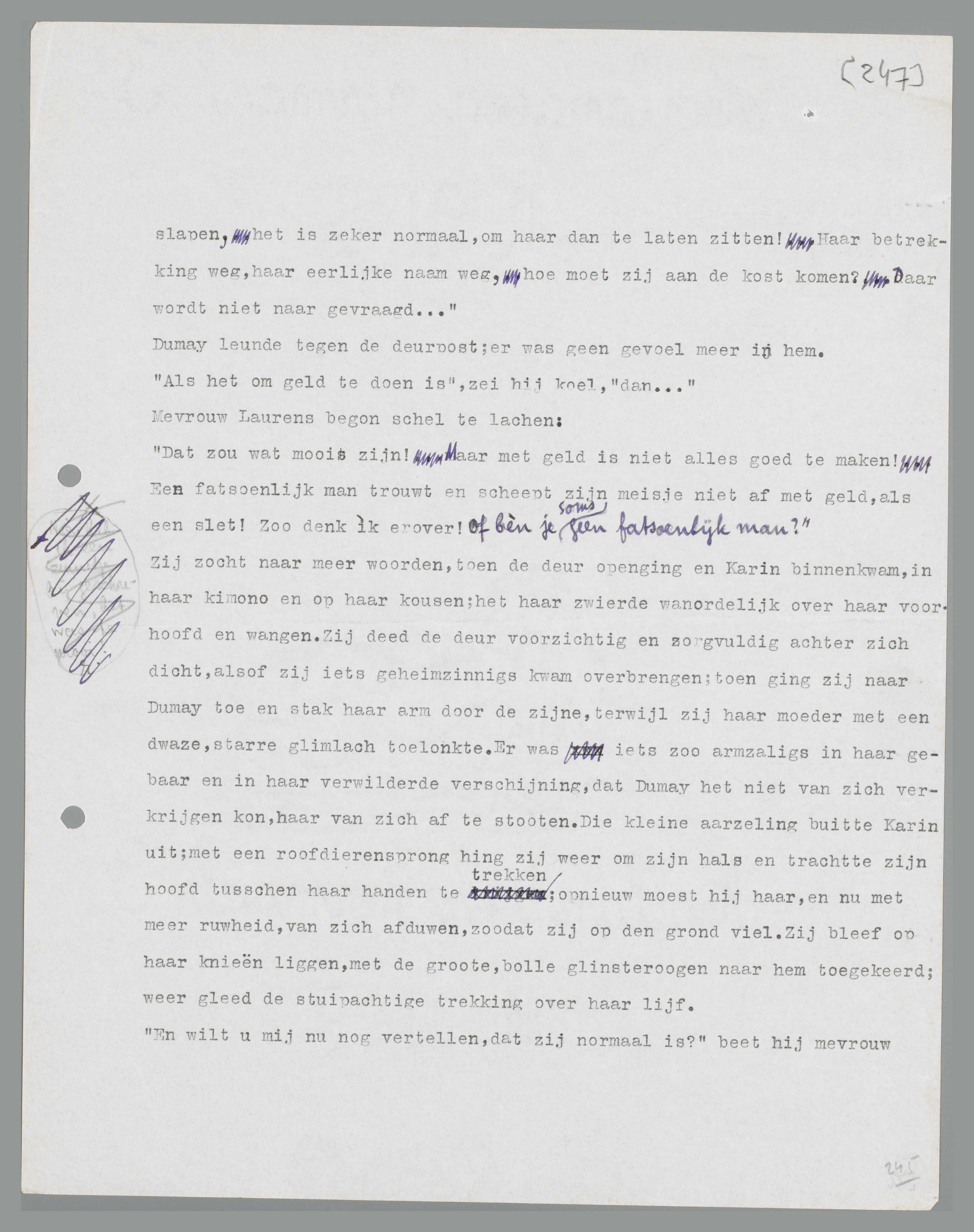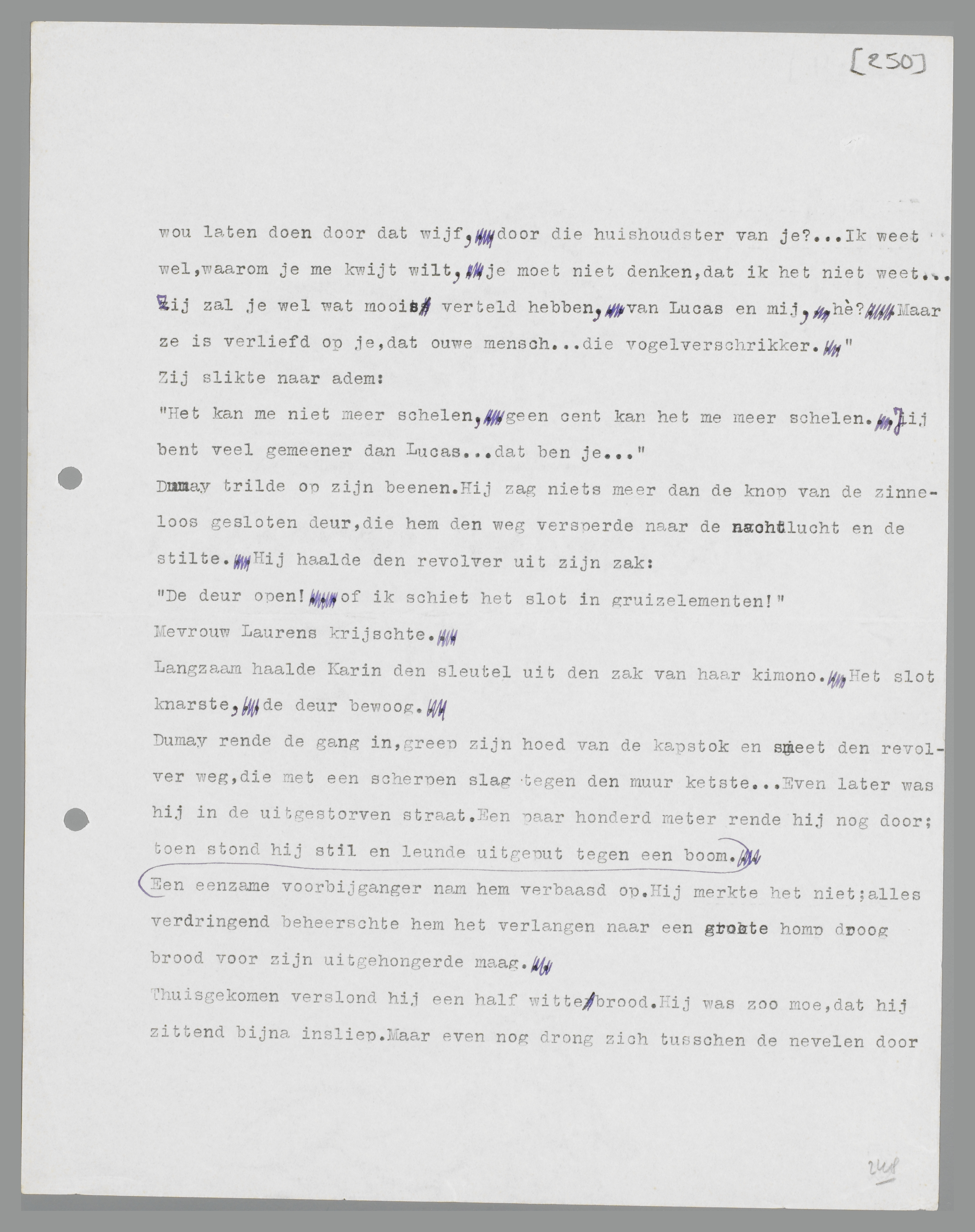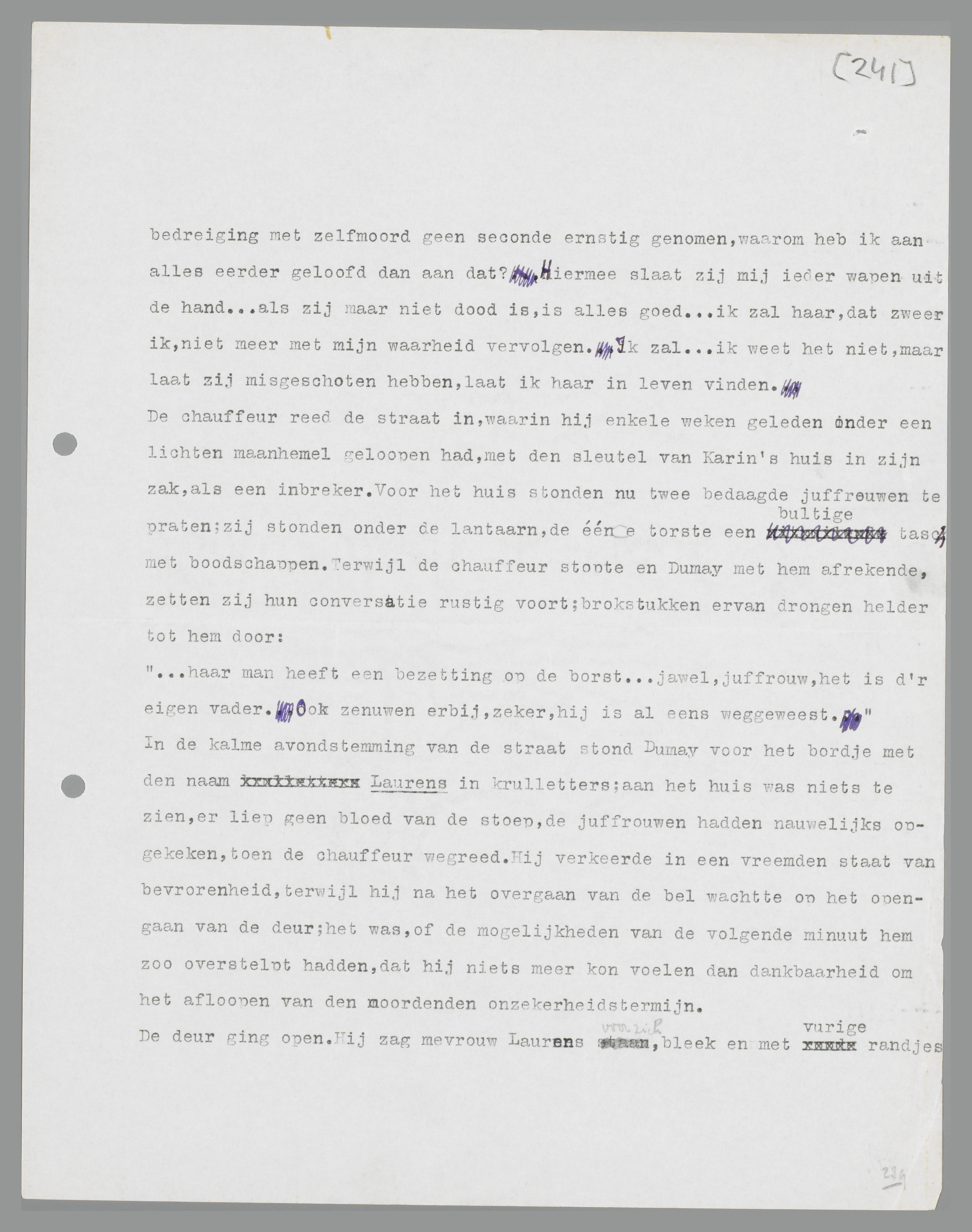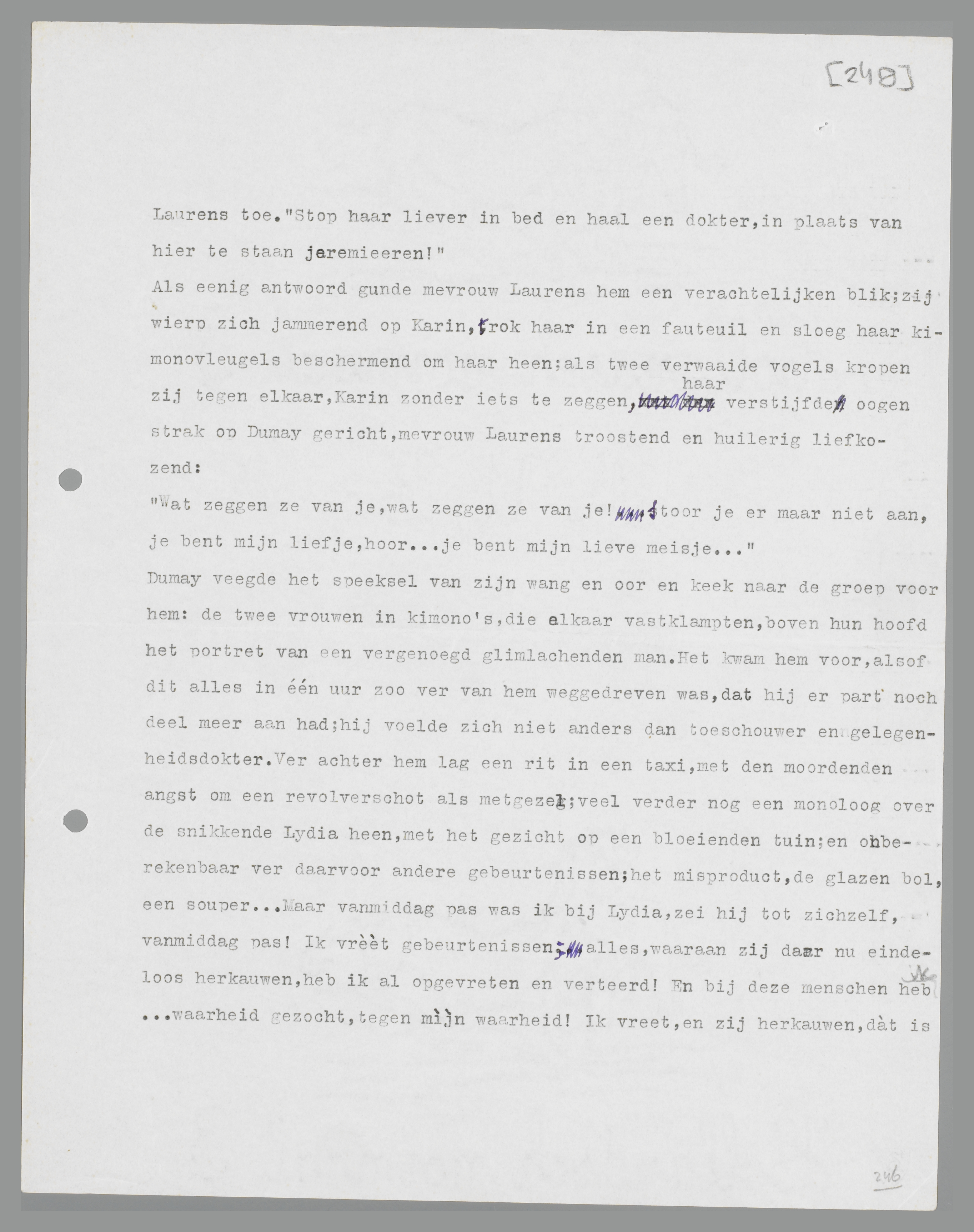 Met een ruk trok hij zijn arm los, drukte haar op het bed terug en liep de kamer uit; de revolver nam hij in het voorbijgaan mee. De walging was hem te machtig geworden; zijn boord was bij het wegloopen ingescheurd, hij had het gevoel, of zijn zenuwen op springen stonden. In de huiskamer vond hij mevrouw Laurens, die wezenloos voor zich uit zat te turen.