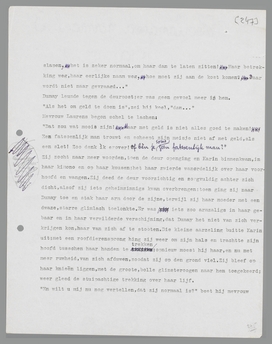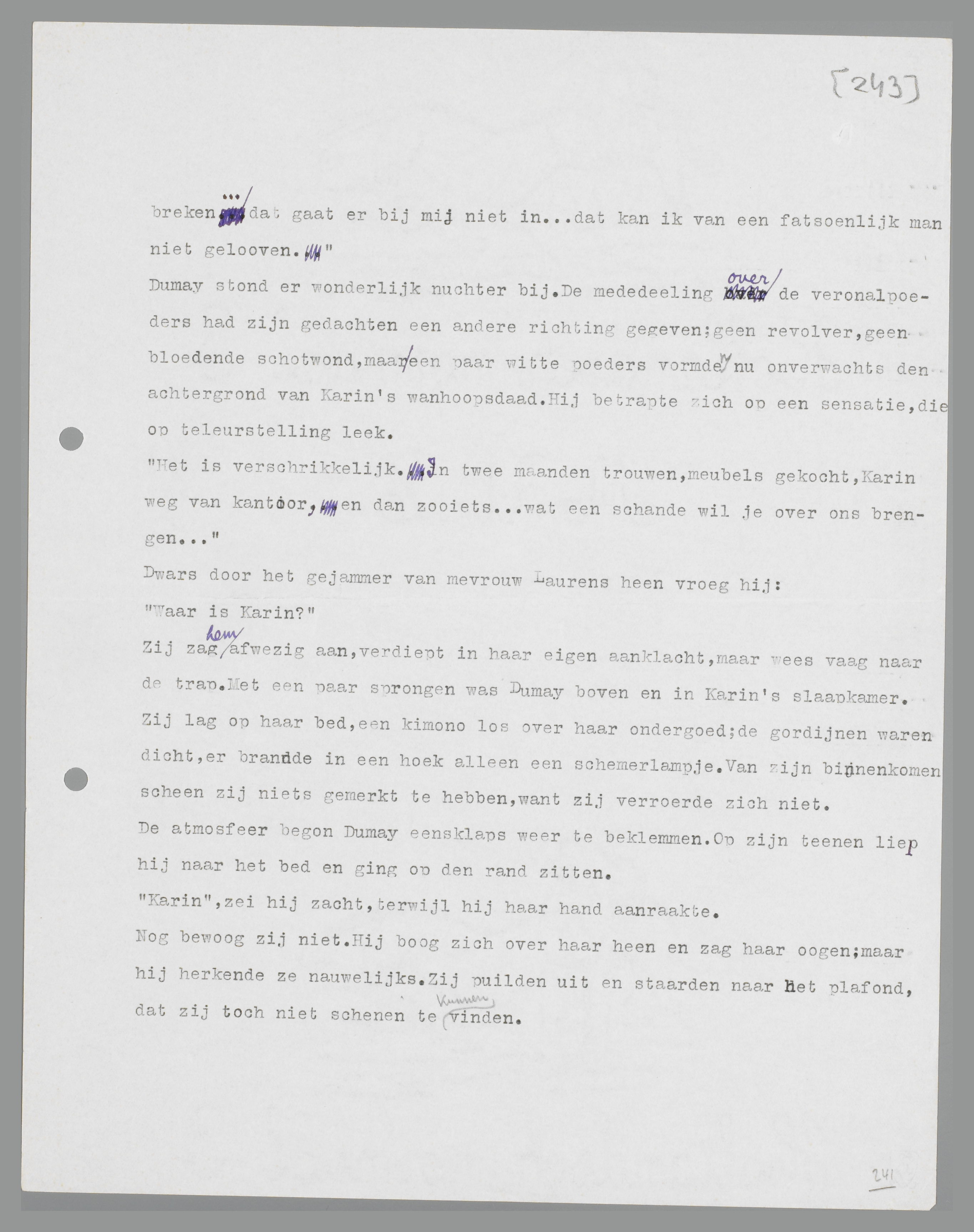 Zij zag hem afwezig aan, verdiept in haar eigen aanklacht, maar wees vaag naar de trap. Met een paar sprongen was Dumay boven en in Karin's slaapkamer. Zij lag op haar bed, een kimono los over haar ondergoed; de gordijnen waren dicht, er brandde in een hoek alleen een schemerlampje. Van zijn binnenkomen scheen zij niets gemerkt te hebben, want zij verroerde zich niet.