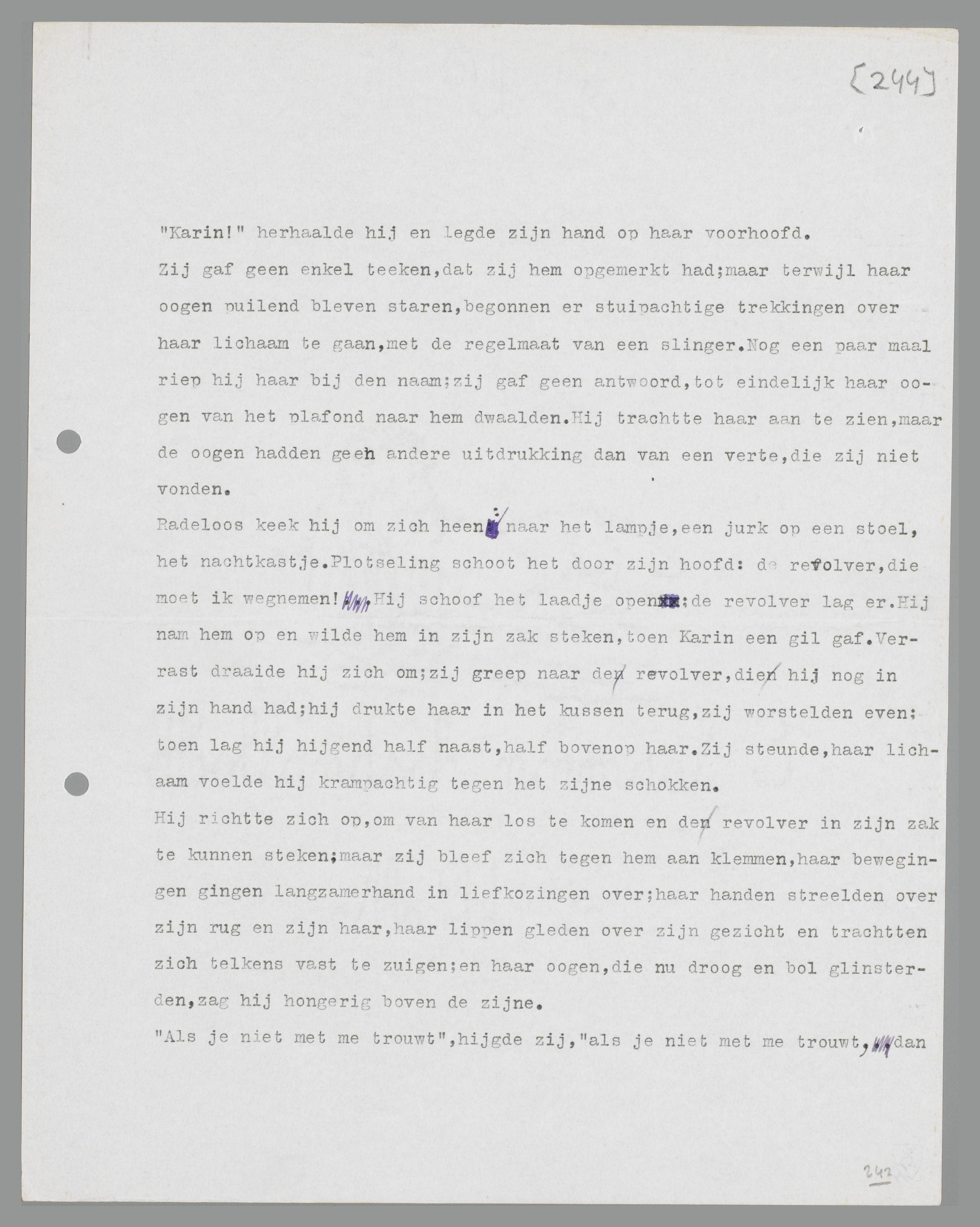 jurk op een stoel, het nachtkastje. Plotseling schoot het door zijn hoofd: de revolver, die moet ik wegnemen! Hij schoof het laadje open: de revolver lag er. Hij nam hem op en wilde hem in zijn zak steken, toen Karin een gil gaf. Verrast draaide hij zich om; zij greep naar de revolver, die hij nog in zijn hand had; hij drukte haar in het kussen terug, zij worstelden even: toen lag hij hijgend half naast, half bovenop haar. Zij steunde, haar lichaam voelde hij krampachtig tegen het zijne schokken.