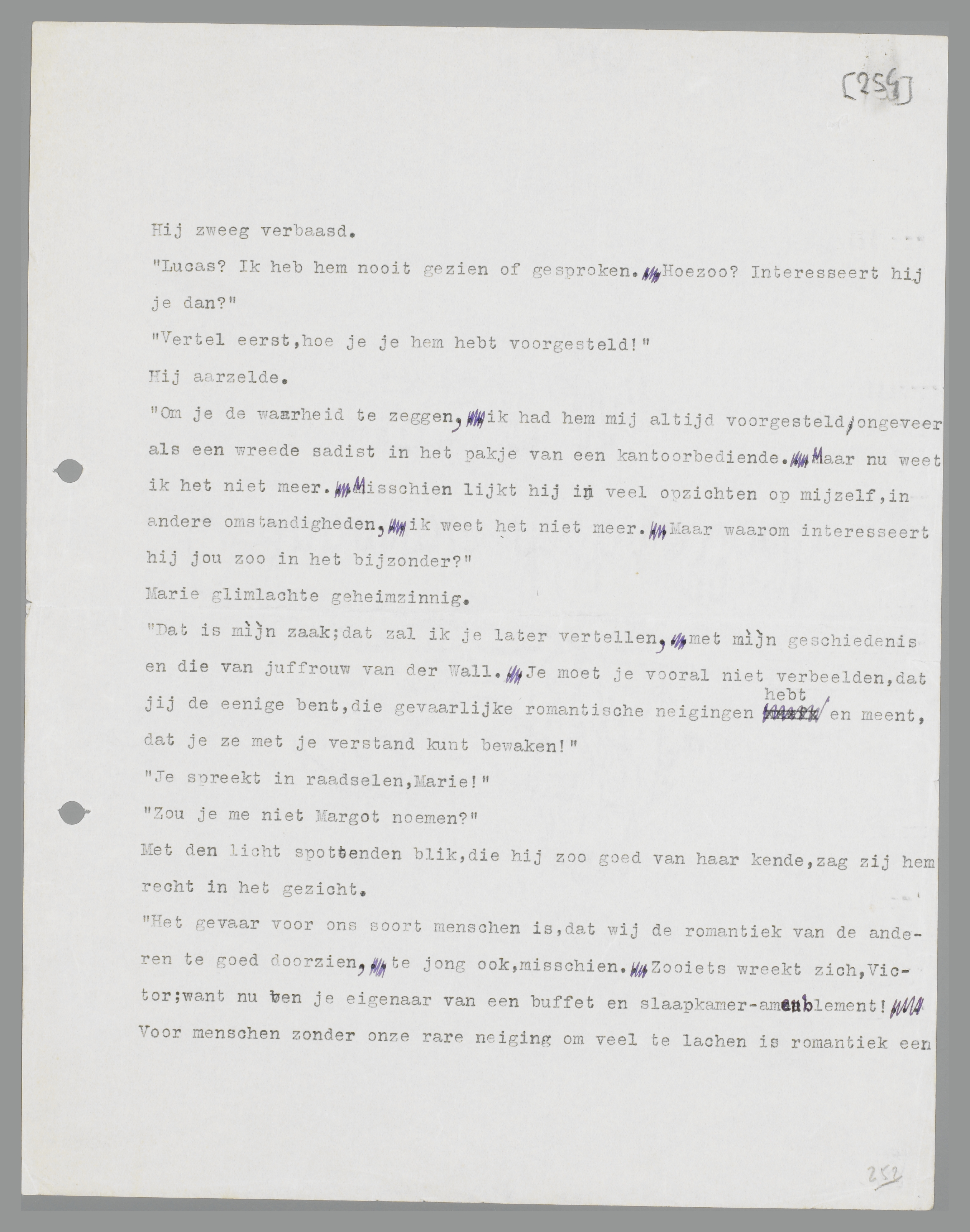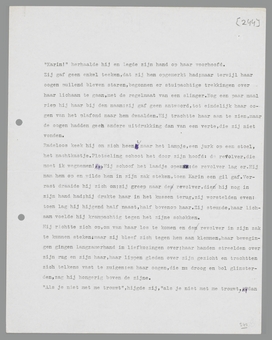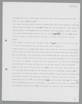 ‘Er is iets, dat mij aan dit geval nog boeit,’ zei zij peinzend. ‘Wij meenden natuurlijk, superieur te zijn aan Lucas en Karin, wij zouden om hen gelachen hebben, als wij niet met hen te maken hadden gehad. En daarom denk ik: hebben wij eigenlijk wel iets anders gedaan, dan hen... inhalen? dan een soort gemakkelijke ironie verliezen, die juist op kleine, burgerlijke dingen stuk gaat? je moet niet vergeten, dat menschen als wij later ernstig worden dan anderen, omdat wij al jong, misschien wel tè jong, de romantiek van die anderen doorzien en er niet meer aan mee kunnen doen. Dat wreekt zich eens... Ieder komt aan de beurt voor zijn huiskamerroman...’