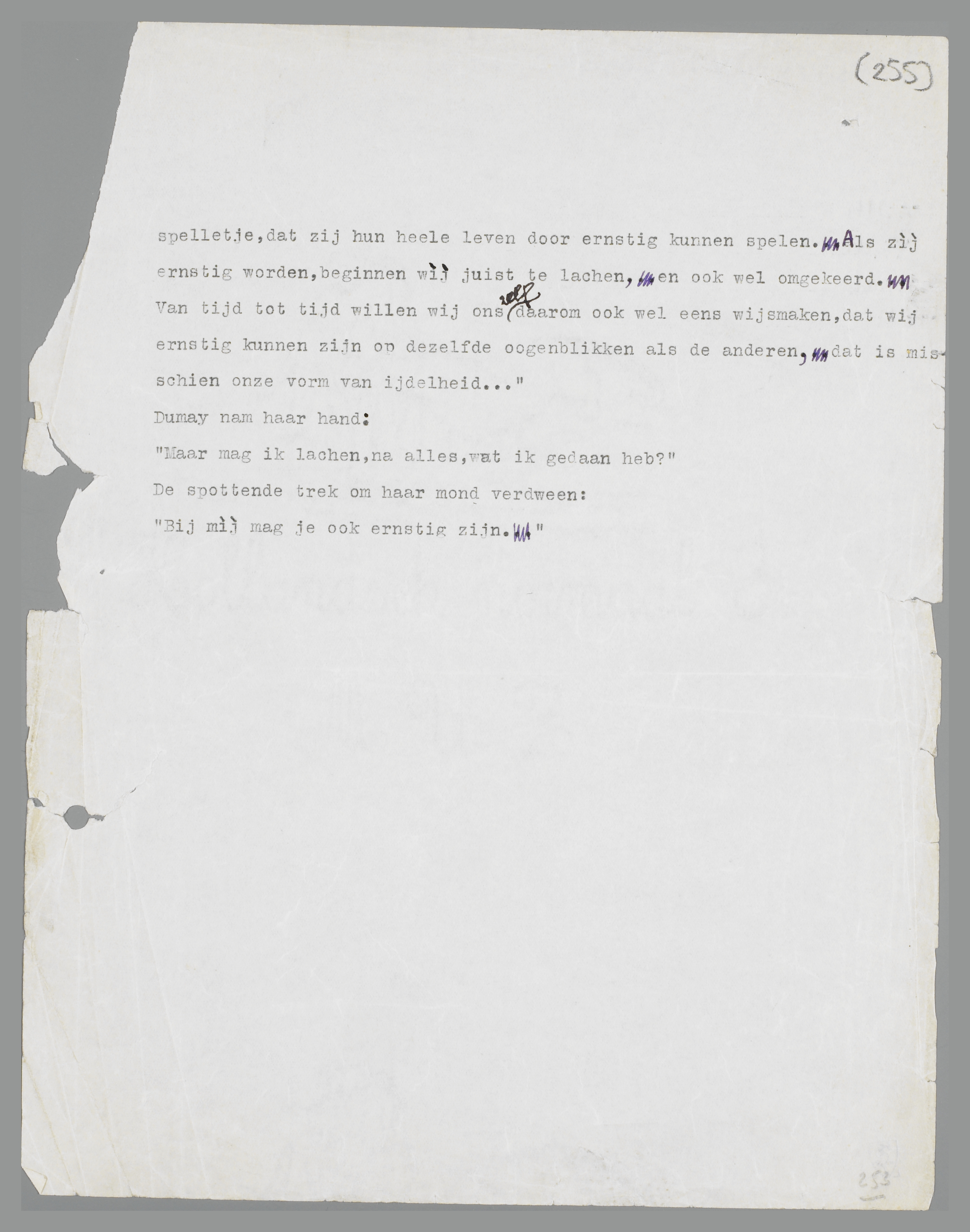 Zij zagen elkaar aan en onwillekeurig begonnen zij beiden te lachen. Zij wisten geen van beiden precies, waarom zij lachten; het was, of de tijd een sprong terug deed, en zij lachten. Zij hielden ook gelijktijdig op met lachen. Marie dacht: het is onzinnig, dat ik ben gaan lachen, voor ik nog een ernstig woord aan zijn huwelijk gewijd heb; Dumay dacht: het komt niet te pas, dat ik, in mìjn situatie, begin te lachen, voordat ik haar uiteengezet heb, wat er met mij is gebeurd. Maar zij ondergingen beiden de aangename sensatie, dat dit lachen het zonderlinge afscheid,