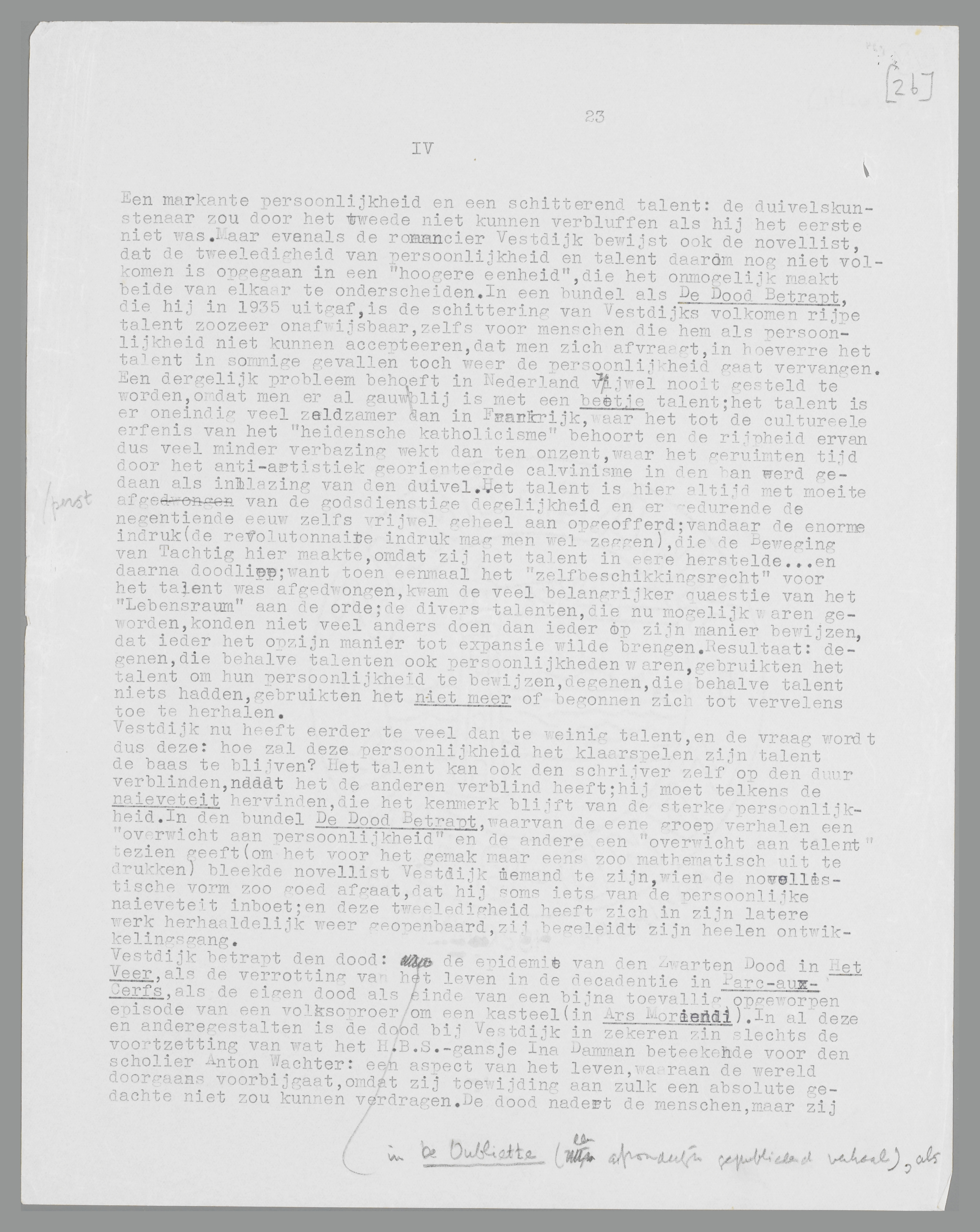 Een markante persoonlijkheid en een schitterend talent: de duivelskunstenaar zou door het tweede niet kunnen verbluffen als hij het eerste niet was. Maar evenals de romancier Vestdijk bewijst ook de novellist, dat de tweeledigheid van persoonlijkheid en talent daarom nog niet volkomen is opgegaan in een ‘hoogere eenheid’, die het onmogelijk maakt beide van elkaar te onderscheiden. In een bundel als De Dood Betrapt, die hij in 1935 uitgaf, is de schittering van Vestdijks volkomen rijpe talent zoozeer onafwijsbaar, zelfs voor menschen die hem als persoonlijkheid niet kunnen accepteeren, dat men zich afvraagt, in hoeverre het talent in sommige gevallen toch weer de persoonlijkheid gaat vervangen. Een dergelijk probleem behoeft in Nederland vrijwel nooit gesteld te worden, omdat men er al
