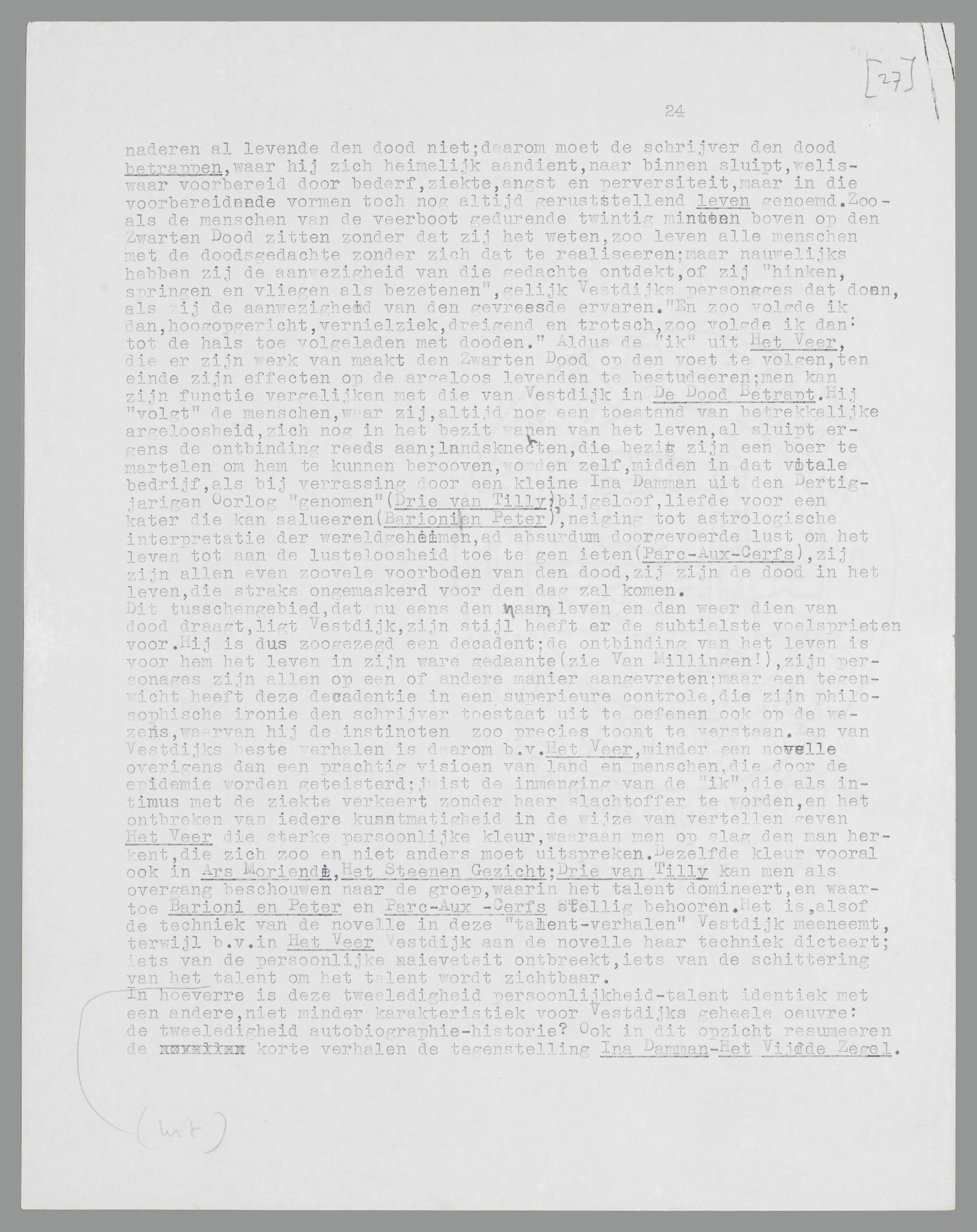 Vestdijk betrapt den dood: in De Oubliette (een afzonderlijk gepubliceerd verhaal), als de epidemie van den Zwarten Dood in Het Veer, als de verrotting van het leven en de decadentie in Parcaux-Cerfs, als de eigen dood als einde van een bijna toevallig opgeworpen episode van een volksoproer om een kasteel (in Ars Moriendi). In al deze en andere gestalten is de dood bij Vestdijk in zekeren zin slechts de voortzetting van wat het H.B.S.-gansje Ina Damman beteekende voor den scholier Anton Wachter: een aspect van het leven, waaraan de wereld doorgaans voorbijgaat, omdat zij toewijding aan zulk een absolute gedachte niet zou kunnen verdragen. De dood nadert de menschen, maar zij naderen al levende den dood niet; daarom moet de schrijver den dood betrappen, waar hij zich heimelijk aandient, naar binnen sluipt, weliswaar voorbereid door bederf, ziekte, angst en perversiteit, maar in die voorbereidende vormen toch nog altijd geruststellend leven genoemd. Zooals de menschen van de veerboot gedurende twintig minuten boven op den Zwarten