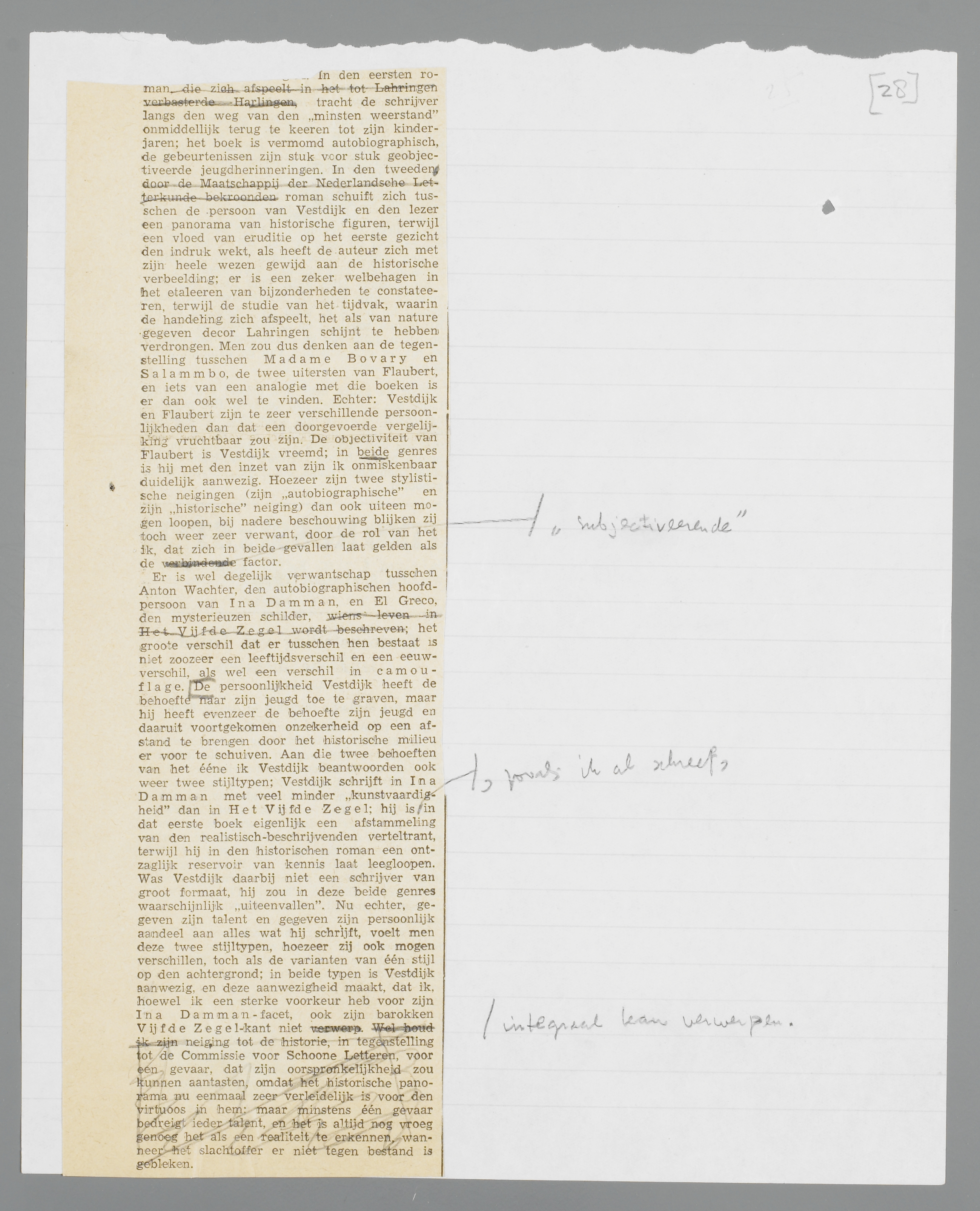 Flaubert, en iets van een analogie met die boeken is er dan ook wel te vinden. Echter: Vestdijk en Flaubert zijn te zeer verschillende persoonlijkheden dan dat een doorgevoerde vergelijking vruchtbaar zou zijn. De objectiviteit van Flaubert is Vestdijk vreemd; in beide genres is hij met den inzet van zijn ik onmiskenbaar duidelijk aanwezig. Hoezeer zijn twee stylistische neigingen (zijn ‘autobiographische’ en zijn ‘historische’ neiging) dan ook uiteen mogen loopen, bij nadere beschouwing blijken zij toch weer zeer verwant, door de rol van het ik, dat zich in beide gevallen laat gelden als ‘subjectiveerende’ factor.
