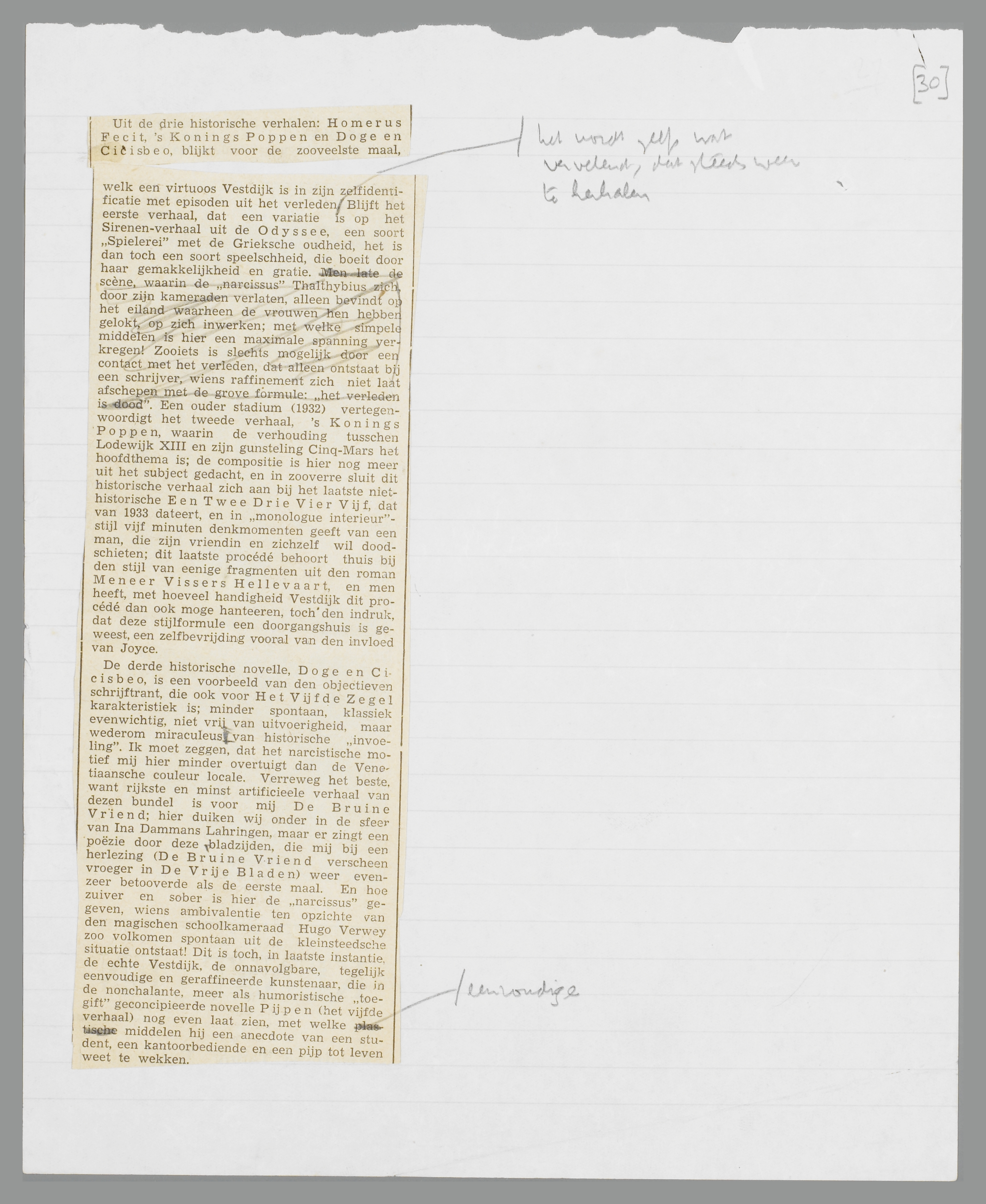 Uit de drie historische verhalen: Homerus Fecit, 's Konings Poppen en Doge en Cicisbeo, blijkt voor de zooveelste maal, welk een virtuoos Vestdijk is in zijn zelf identificatie met episoden uit het verleden, het wordt zelfs wat vervelend dat steeds weer te herhalen. Blijft het eerste verhaal, dat een variatie is op het Sirenen-verhaal uit de Odyssee, een soort ‘Spielerei’ met de Grieksche oudheid, het is dan toch een soort speelschheid, die boeit door haar gemakkelijkheid en gratie. Een ouder stadium (1932) vertegenwoordigt het tweede verhaal, 's Konings Poppen, waarin de ver-