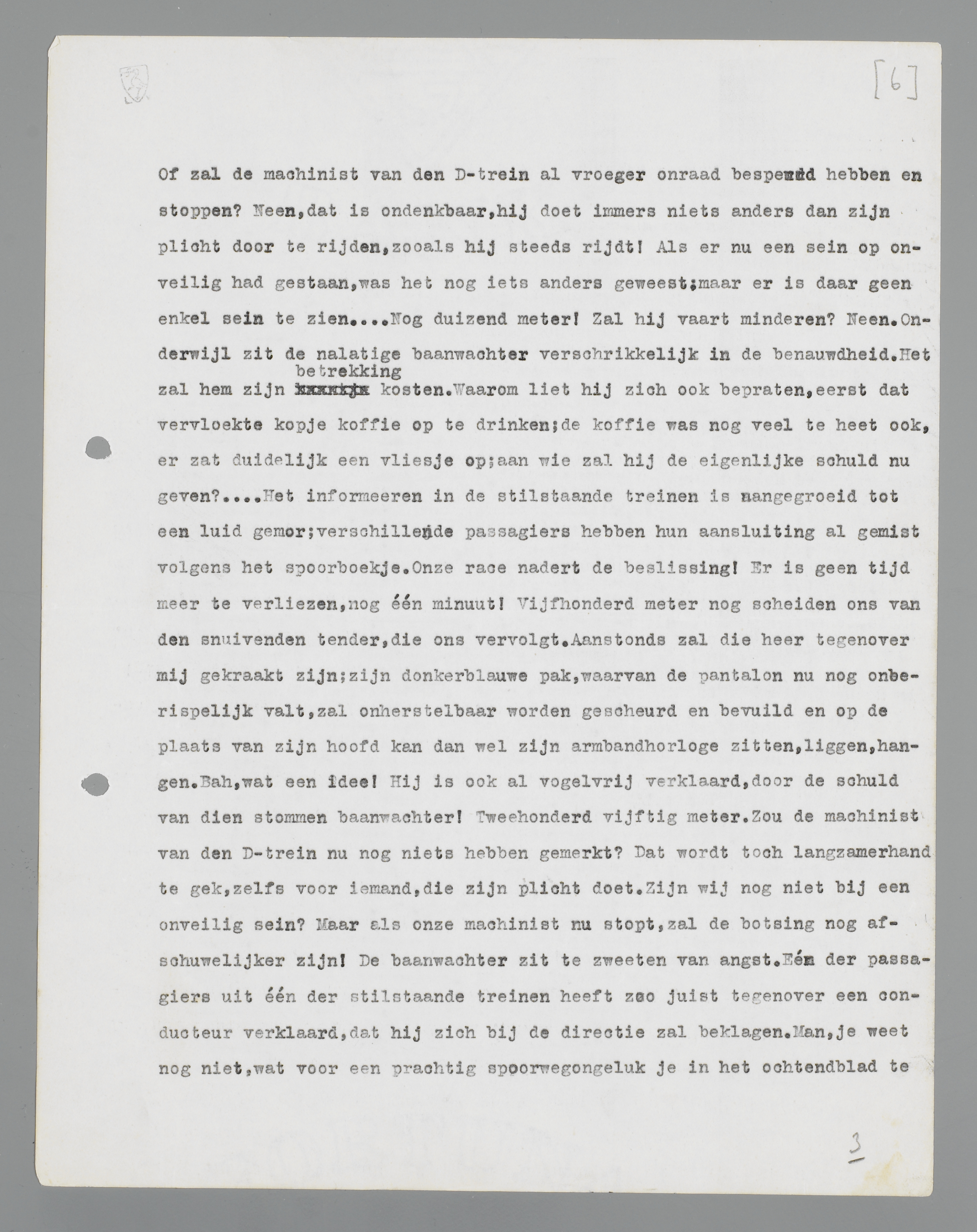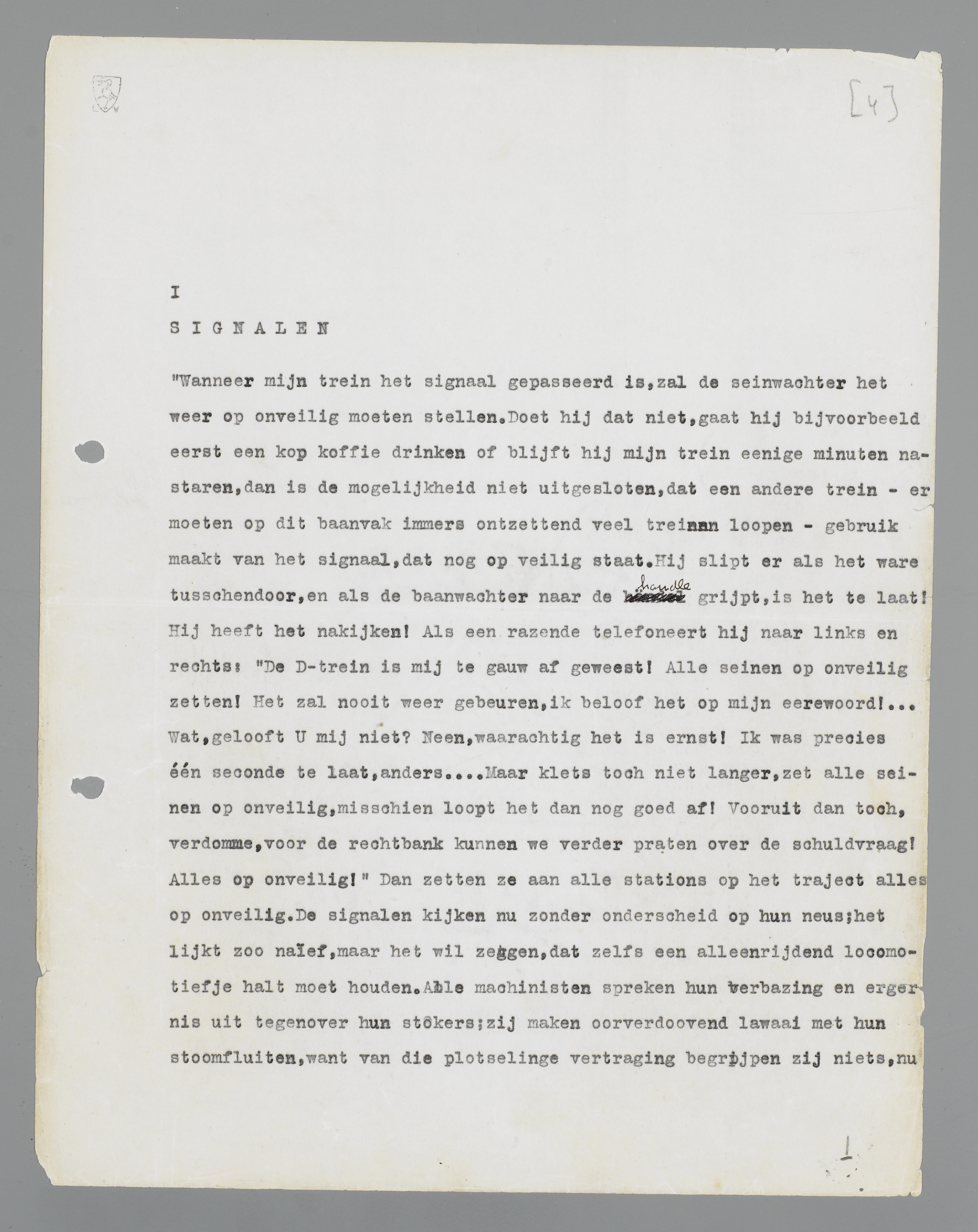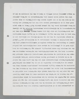 ‘Wanneer mijn trein het signaal gepasseerd is, zal de seinwachter het weer op onveilig moeten stellen. Doet hij dat niet, gaat hij bijvoorbeeld eerst een kop koffie drinken of blijft hij mijn trein eenige minuten nastaren, dan is de mogelijkheid niet uitgesloten, dat een andere trein - er moeten op dit baanvak immers ontzettend veel treinen loopen - gebruik maakt van het signaal, dat nog op veilig staat. Hij slipt er als het ware tusschendoor, en als de baanwachter naar de handle grijpt, is het te laat! Hij heeft het nakijken! Als een razende telefoneert hij naar links en rechts: “De D-trein is mij te gauw af geweest! Alle seinen op onveilig zetten! Het zal nooit weer gebeuren, ik beloof het op mijn eerewoord!.... Wat, gelooft U mij niet? Neen, waarachtig het is ernst! Ik was precies één seconde te laat, anders.... Maar klets toch niet langer, zet alle seinen op onveilig, misschien loopt het dan nog goed af! Vooruit dan toch, verdomme, voor de rechtbank kunnen we verder praten over de schuldvraag! Alles op onveilig!” Dan zetten ze aan alle stations op het traject alles op onveilig. De signalen kijken nu zonder onderscheid op hun neus; het