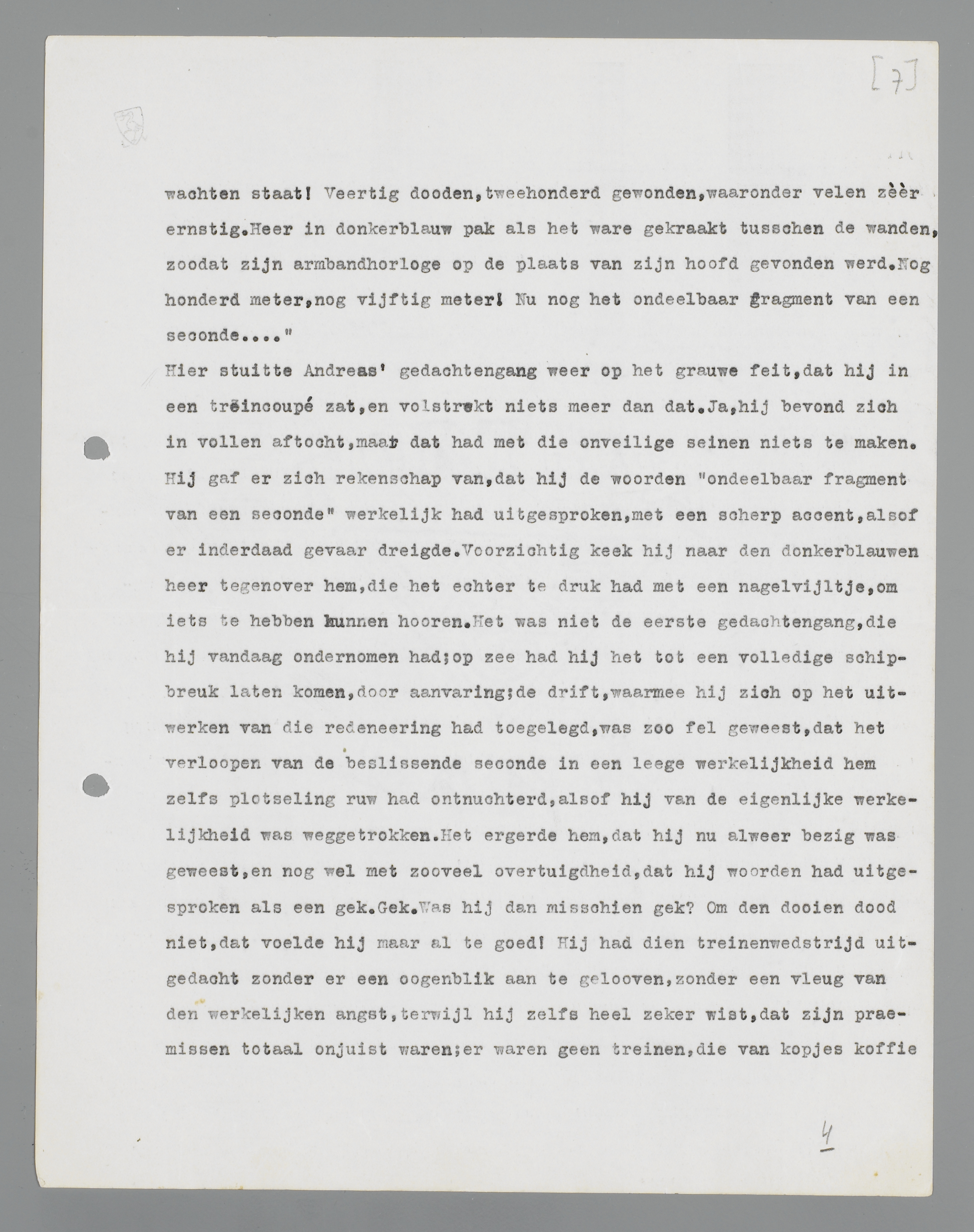 Hier stuitte Andreas' gedachtengang weer op het grauwe feit, dat hij in een treincoupé zat, en volstrekt niets meer dan dat. Ja, hij bevond zich in vollen aftocht, maar dat had met die onveilige seinen niets te maken. Hij gaf er zich rekenschap van, dat hij de woorden ‘ondeelbaar fragment van een seconde’ werkelijk had uitgesproken, met een scherp accent, alsof er inderdaad gevaar dreigde. Voorzichtig keek hij naar den donkerblauwen heer tegenover hem, die het echter te druk had met een nagelvijltje, om iets te hebben kunnen hooren. Het was niet de eerste gedachtengang, dien hij vandaag ondernomen had; op zee had hij het tot een volledige schipbreuk laten komen, door aanvaring; de drift, waarmee hij zich op het uitwerken van die redeneering had toegelegd, was zoo fel geweest, dat het verloopen van de beslissende seconde in een leege werkelijkheid hem zelfs plotseling ruw had ontnuchterd, alsof hij van de eigenlijke werkelijkheid was weggetrokken. Het ergerde hem, dat hij nu alweer bezig was geweest, en nog wel met zooveel overtuigdheid, dat hij woorden had uitgesproken als een gek. Gek. Was hij misschien gek? Om den dooien dood niet, dat voelde hij maar al te goed! Hij had dien treinenwedstrijd uitgedacht