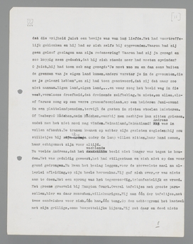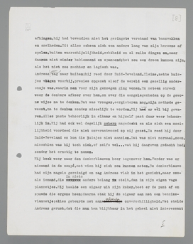 man tegenover hem, die nu volkomen argeloos een krant zat te lezen; toen dook hij weg in de schaduw van een verfomfaaid grijs gordijntje. Maar de gedachtenstroom achter zijn voorhoofd bleef doorwielen naar dien éénen zuigenden kolk, dat vervloekte centrum, dat alle beelden opslorpte in zijn vormlooze leegte. Het scheen Andreas, of de beelden er een boosaardig genoegen in hadden, zich langs tallooze onschuldig uitziende paden voort te spoeden, om dan plotseling, met een scherpe en onverwachte bocht, schaterlachend in dien kolk te plenzen. Hij begon te denken aan punten, die volgens zijn berekening oneindig ver van den kolk af lagen; nauwelijks had hij ze gestalte gegeven, of ze ontsnapten hem, gingen zonder waarschuwing rondtollen en verdwenen in de zuiging. Al voortzwalkend kwam hij steeds dichter bij het beeld, dat geen oogenblik uit zijn hersens weg was geweest. Zonder één onderbreking had het achter al het andere gestaan, niet steeds duidelijk waarneembaar, maar voortdurend aanwezig. Terwijl alles fladderde en danste, stond het grijs en doodstil, bevelend, wachtend, tot Andreas' hersenkronkels vermoeid zouden zijn van de onzinnige spelletjes met schipbreuken, treinbotsingen en donkerblauwe mannen. Het hing als een nevel over de voorbijschietende kleuren, maar soms verscherpte het zich plotseling in een dreigend detail. Andreas wist, dat hij niet weg-