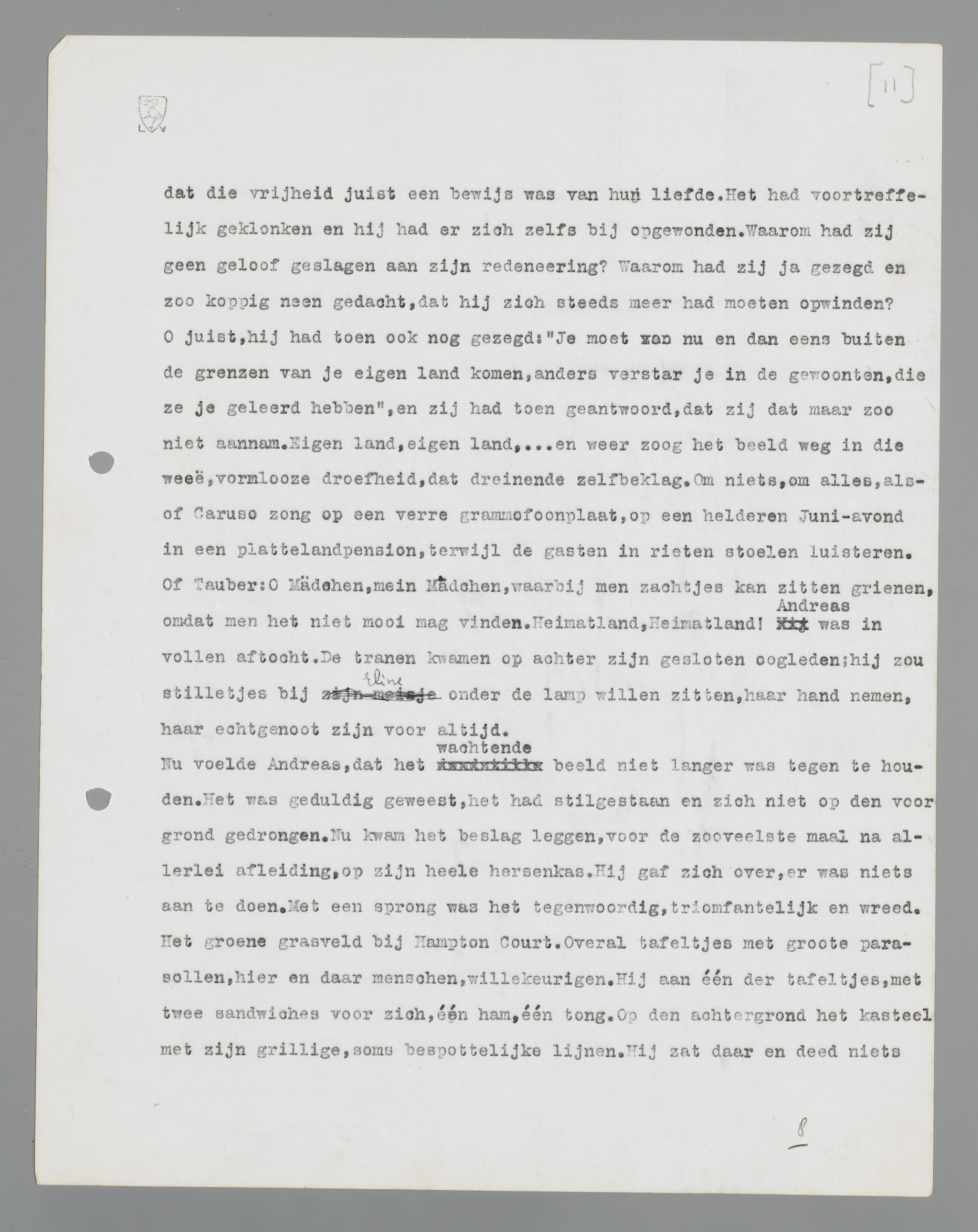 O juist, hij had toen ook nog gezegd: ‘Je moet zoo nu en dan eens buiten de grenzen van je eigen land komen, anders verstar je in de gewoonten, die ze je geleerd hebben’, en zij had toen geantwoord, dat zij dat maar zoo niet aannam. Eigen land, eigen land,... en weer zoog het beeld weg in die weeë, vormlooze droefheid, dat dreinende zelfbeklag. Om niets, om alles, alsof Caruso zong op een verre gramofoonplaat, op een helderen Juni-avond in een plattelandpension, terwijl de gasten in rieten stoelen luisteren. Of Tauber: O Mädchen, mein Mädchen, waarbij men zachtjes kan zitten grienen, omdat men het niet mooi mag vinden. Heimatland, Heimatland! Andreas was in vollen aftocht. De tranen kwamen op achter zijn gesloten oogleden; hij zou stilletjes bij zijn meisje onder de lamp willen zitten, haar hand nemen, haar echtgenoot zijn voor altijd.