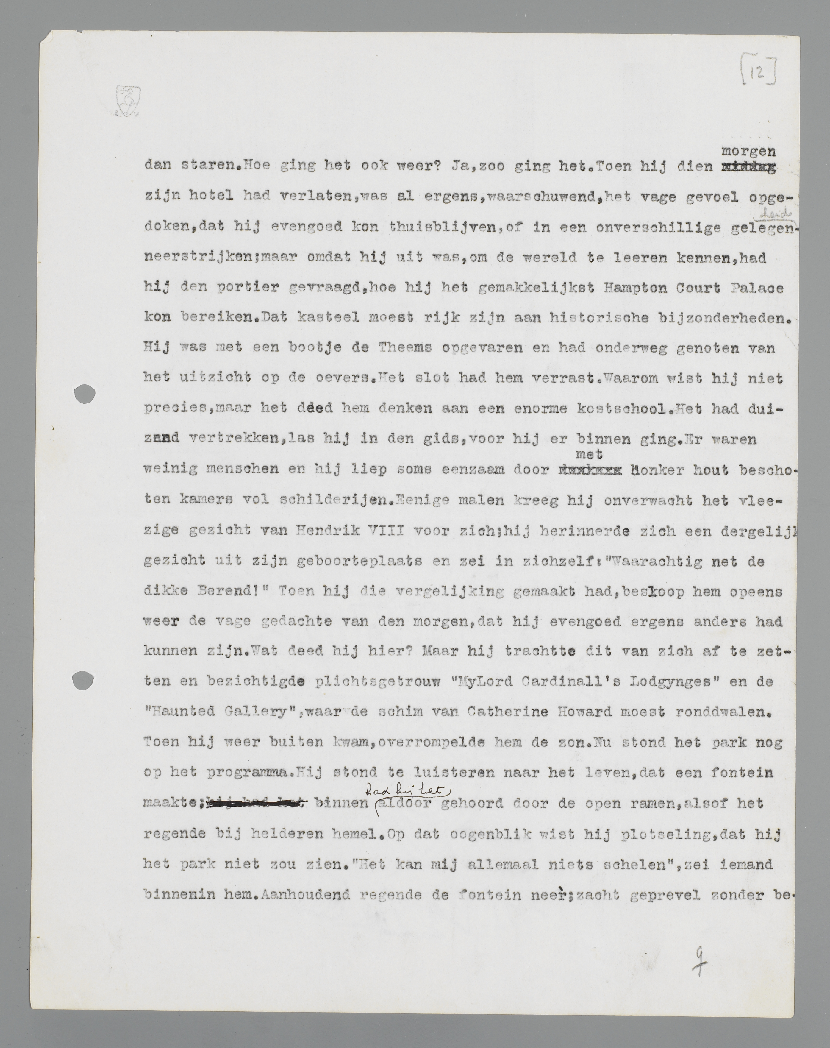 Hij was met een bootje de Theems opgevaren en had onderweg genoten van het uitzicht op de oevers. Het slot had hem verrast. Waarom wist hij niet precies, maar het deed hem denken aan een enorme kostschool. Het had duizend vertrekken, las hij in den gids, voor hij er binnen ging. Er waren weinig menschen en hij liep soms eenzaam door met donker hout beschoten kamers vol schilderijen. Eenige malen kreeg hij onverwacht het vleezige gezicht van Hen-