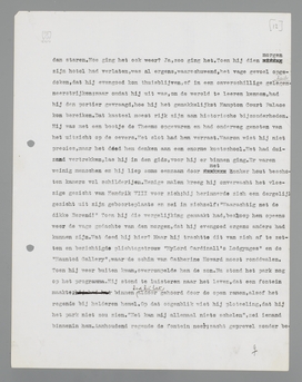 drik VIII voor zich: hij herinnerde zich een dergelijk gezicht uit zijn geboorteplaats en zei in zichzelf: ‘Waarachtig net de dikke Berend!’ Toen hij die vergelijking gemaakt had, besloop hem opeens weer de vage gedachte van den morgen, dat hij evengoed ergens anders had kunnen zijn. Wat deed hij hier? Maar hij trachtte dit van zich af te zetten en bezichtigde plichtgetrouw ‘My Lord Cardinall's Lodgynges’ en de ‘Haunted Gallery’, waar de schim van Catherine Howard moest ronddwalen.