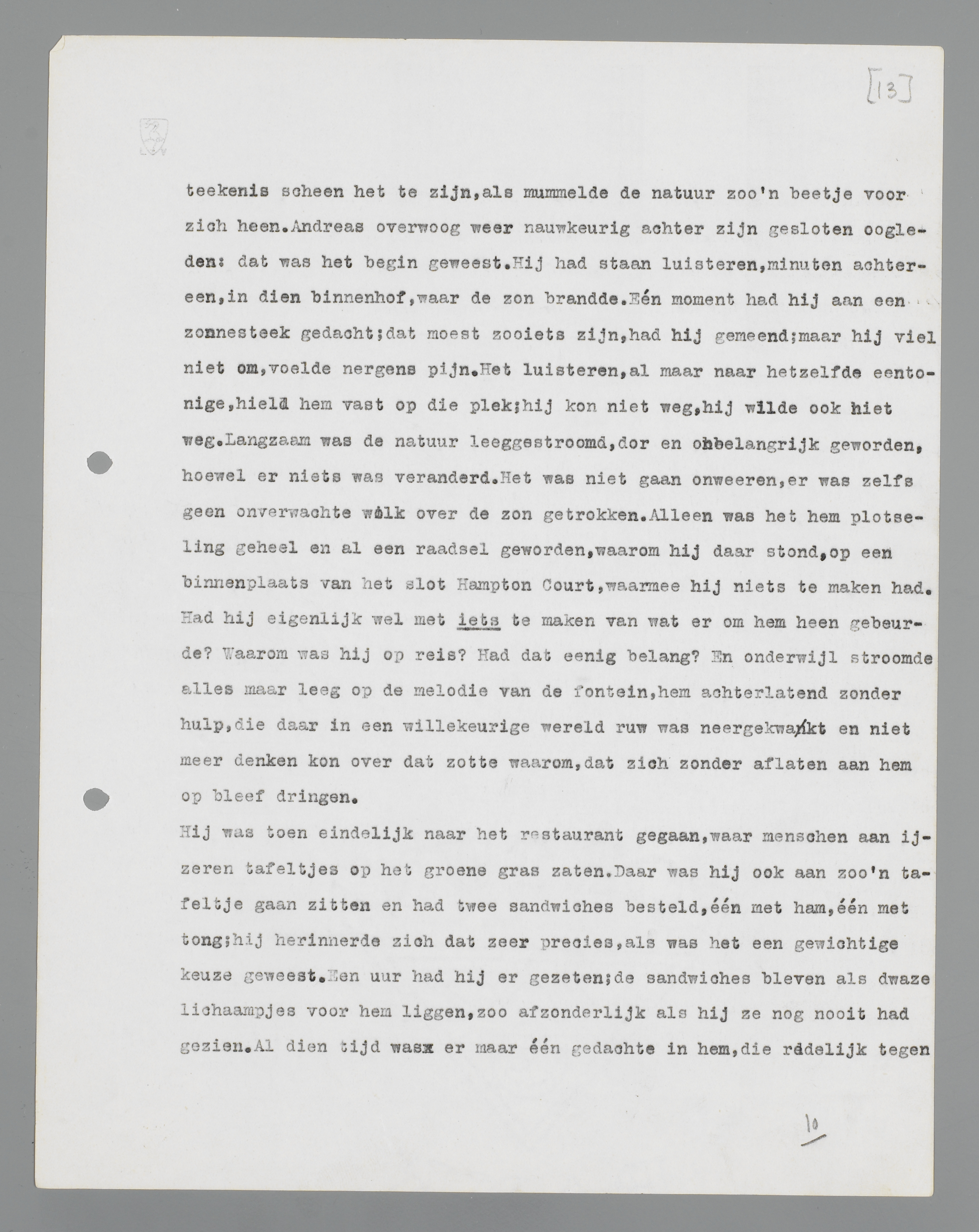 de zooveelste maal na allerlei afleiding, op zijn heele hersenkas. Hij gaf zich over, er was niets aan te doen. Met een sprong was het tegenwoordig, triomfantelijk en wreed. Het groene grasveld bij Hampton Court. Overal tafeltjes met groote parasols, hier en daar menschen, willekeurigen. Hij aan één der tafeltjes, met twee sandwiches voor zich, één ham, één tong. Op den achtergrond het kasteel met zijn grillige, soms bespottelijke lijnen. Hij zat daar en deed niets dan staren. Hoe ging het ook weer? Ja, zoo ging het. Toen hij dien morgen zijn hotel had verlaten, was al ergens, waarschuwend, het vage gevoel opgedoken, dat hij evengoed kon thuisblijven, of in een onverschillige gelegenheid neerstrijken; maar omdat hij uit was, om de wereld te leeren kennen, had hij den portier gevraagd, hoe hij het gemakkelijkst Hampton Court Palace kon bereiken. Dat kasteel moest rijk zijn aan historische bijzonderheden.