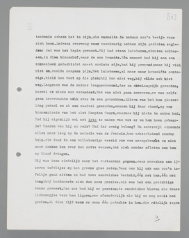 Hij was toen eindelijk naar het restaurant gegaan, waar menschen aan ijzeren tafeltjes op het groene gras zaten. Daar was hij ook aan zoo'n tafeltje gaan zitten en had twee sandwiches besteld, één met ham, één met tong; hij herinnerde zich dat zeer precies, als was het een gewichtige keuze geweest. Een uur had hij er gezeten; de sandwiches bleven als dwaze lichaampjes voor hem liggen, zoo afzonderlijk als hij ze nog nooit had gezien. Al dien tijd was er maar één gedachte in hem, die redelijk tegen de leegte in hem streed: ‘Ik moet weg, weg naar de plaats, waar ik