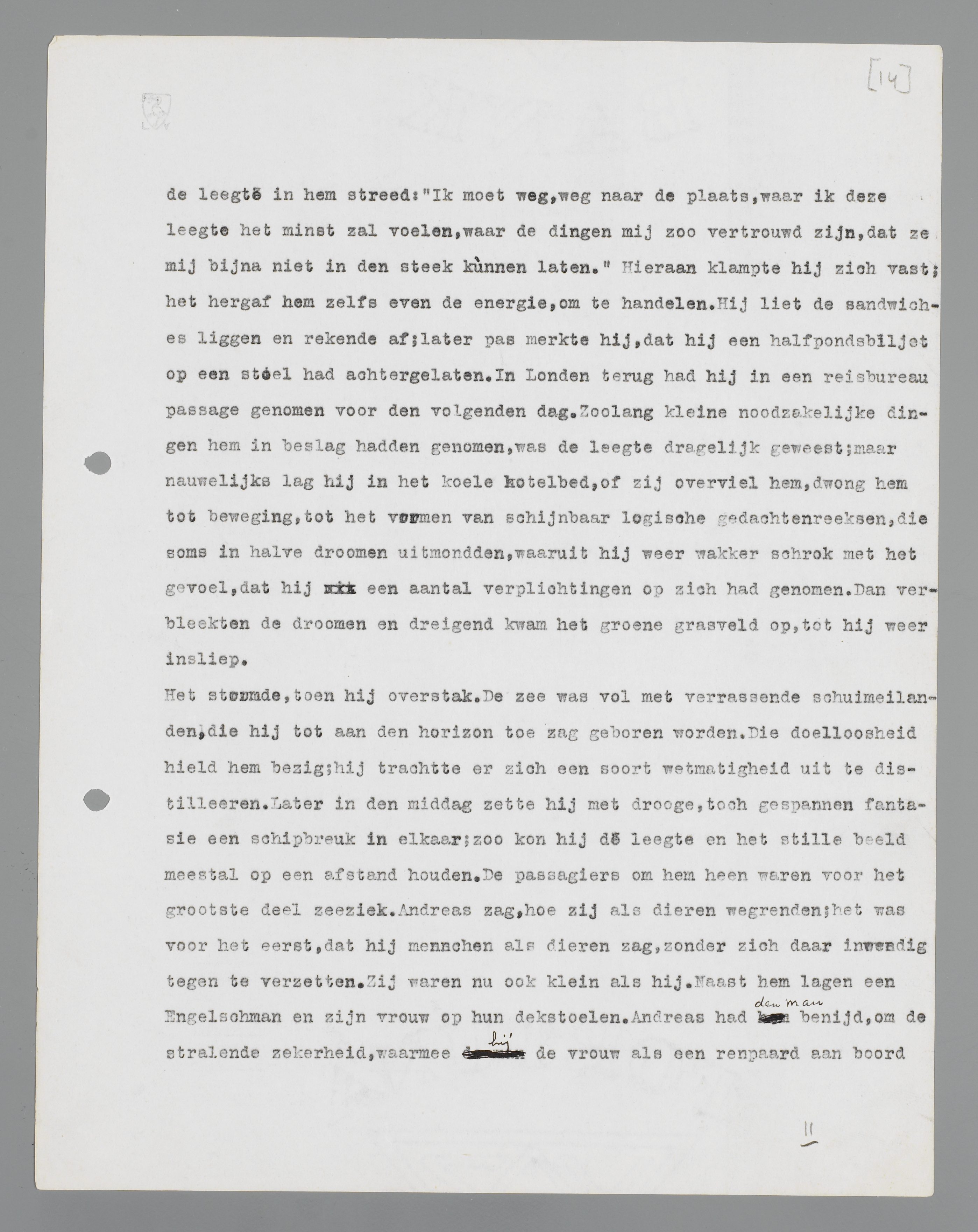 Het stormde, toen hij overstak. De zee was vol met verrassende schuimeilanden, die hij tot aan den horizon toe zag geboren worden. Die doelloosheid hield hem bezig; hij trachtte er zich een soort wetmatigheid uit te distilleeren. Later in den middag zette hij met droge, toch gespannen fantasie een schipbreuk in elkaar; zoo kon hij de leegte en het stille beeld meestal op een afstand houden. De passagiers om hem heen waren voor het grootste deel zeeziek. Andreas zag,