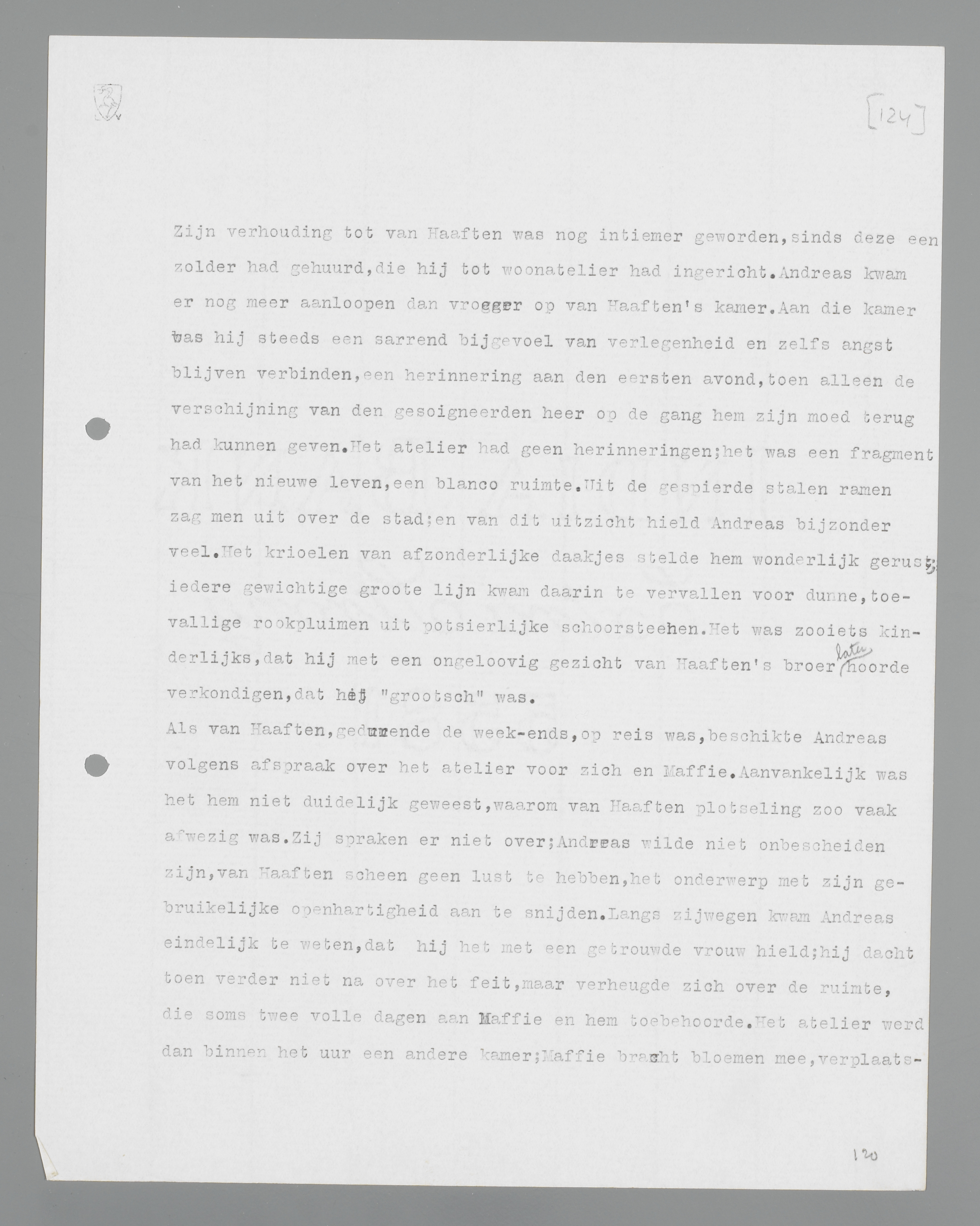 was, beschikte Andreas volgens afspraak over het atelier voor zich en Maffie. Aanvankelijk was het hem niet duidelijk geweest, waarom van Haaften plotseling zoo vaak afwezig was. Zij spraken er niet over; Andreas wilde niet onbescheiden zijn, van Haaften scheen geen lust te hebben, het onderwerp met zijn gebruikelijke openhartigheid aan te snijden. Langs zijwegen kwam Andreas eindelijk te weten, dat hij het met een getrouwde vrouw hield; hij dacht toen verder niet na over het feit, maar verheugde zich over de ruimte, die soms twee volle dagen aan Maffie en hem toebehoorde. Het atelier werd dan binnen het uur een andere kamer; Maffie bracht bloemen mee, verplaatste kleinigheden, deed huisvrouwelijk. Zij zaten elkaar achterna en gooiden altijd dingen om, waarbij Andreas zich telkens weer op een schooljongensachtigen angst voor van Haaften betrapte. Tegen den Zondagavond begon hem dan het ongedurige gevoel te bekruipen, dat deze wereld ging eindigen. Hij zorgde er altijd voor, verdwenen te zijn, zoodra van Haaften terugverwacht kon worden. Kregel zetten zij dan de verplaatste dingen weer in de gewone orde; de bloemen bleven natuurlijk staan. Als misdadigers slopen zij daarna de trap af; het was altijd een vlucht, die meestal naar de bioscoop leidde.