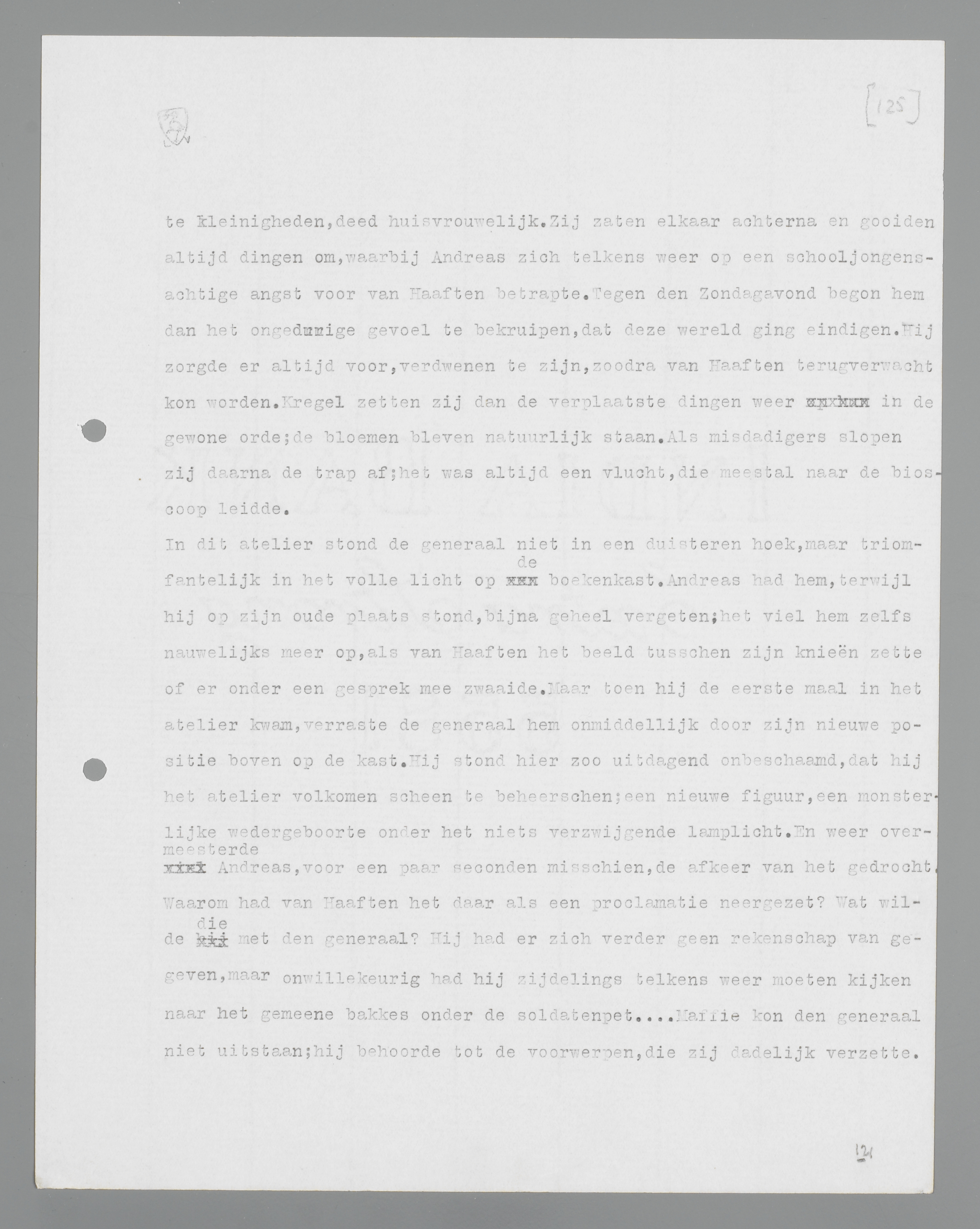 boekenkast. Andreas had hem, terwijl hij op zijn oude plaats stond, bijna geheel vergeten; het viel hem zelfs nauwelijks meer op, als van Haaften het beeld tusschen zijn knieën zette of er onder een gesprek mee zwaaide. Maar toen hij de eerste maal in het atelier kwam, verraste de generaal hem onmiddellijk door zijn nieuwe positie boven op de kast. Hij stond hier zoo uitdagend onbeschaamd, dat hij het atelier volkomen scheen te beheerschen; een nieuwe figuur, een monsterlijke wedergeboorte onder het niets verzwijgende lamplicht. En weer overmeesterde Andreas, voor een paar seconden misschien, de afkeer van het gedrocht. Waarom had van Haaften het daar als een proclamatie neergezet? Wat wilde hij met den generaal? Hij had er zich verder geen rekenschap van gegeven, maar onwillekeurig had hij zijdelings telkens weer moeten kijken naar het gemeene bakkes onder de soldatenpet.... Maffie kon den generaal niet uitstaan; hij behoorde tot de voorwerpen, die zij dadelijk verzette. Zij zou hem zeker op één of andere manier beschadigd hebben, als hij het eigendom van Andreas was geweest: nu bepaalde zij er zich toe, hem met zijn gezicht naar den muur te draaien, met een luidruchtige en oprechte grappigheid, die bij haar gewone optreden slecht paste.
