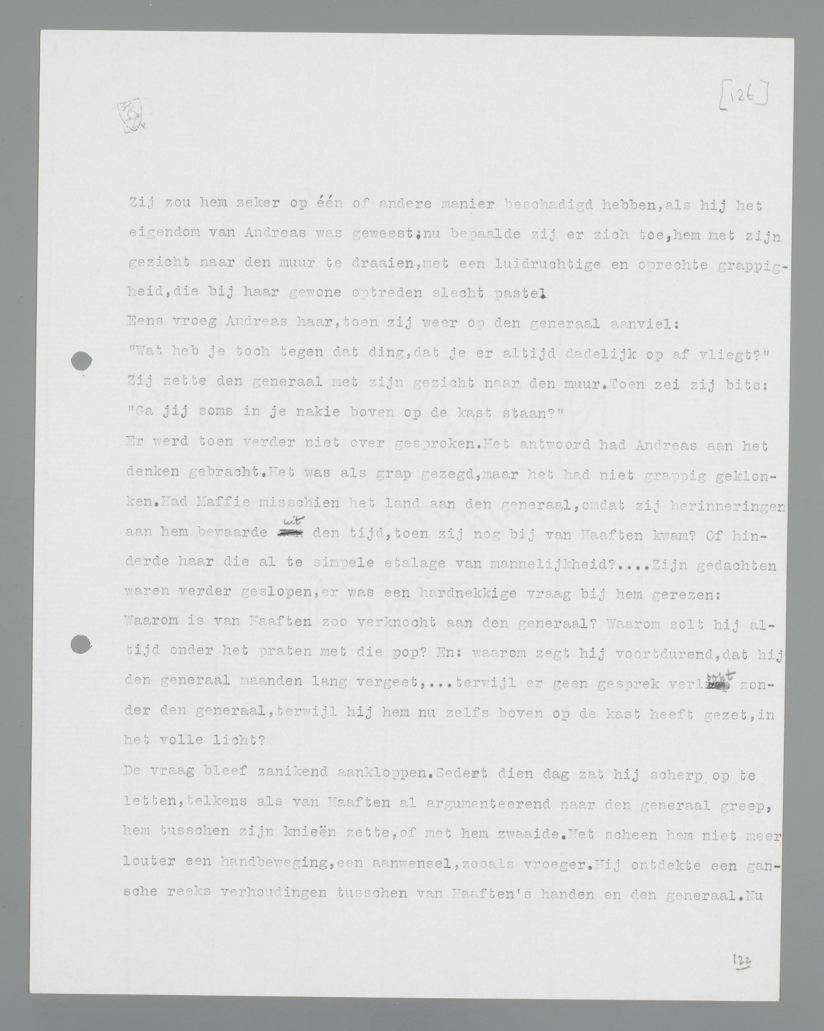 Er werd toen verder niet over gesproken. Het antwoord had Andreas aan het denken gebracht. Het was als grap gezegd, maar het had niet grappig geklonken. Had Maffie misschien het land aan den generaal, omdat zij herinneringen aan hem bewaarde uit den tijd, toen zij nog bij van Haaften kwam? Of hinderde haar die al te simpele etalage van mannelijkheid?.... Zijn gedachten waren verder geslopen, er was een hardnekkige vraag bij hem gerezen: