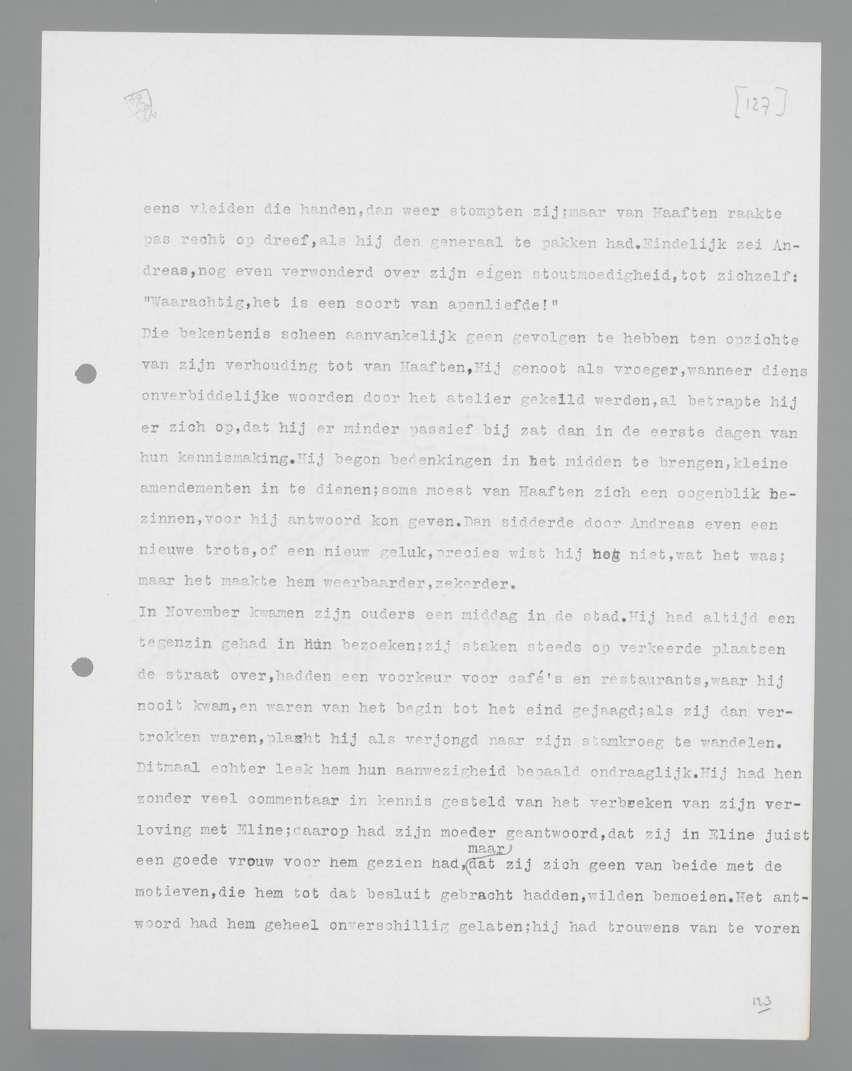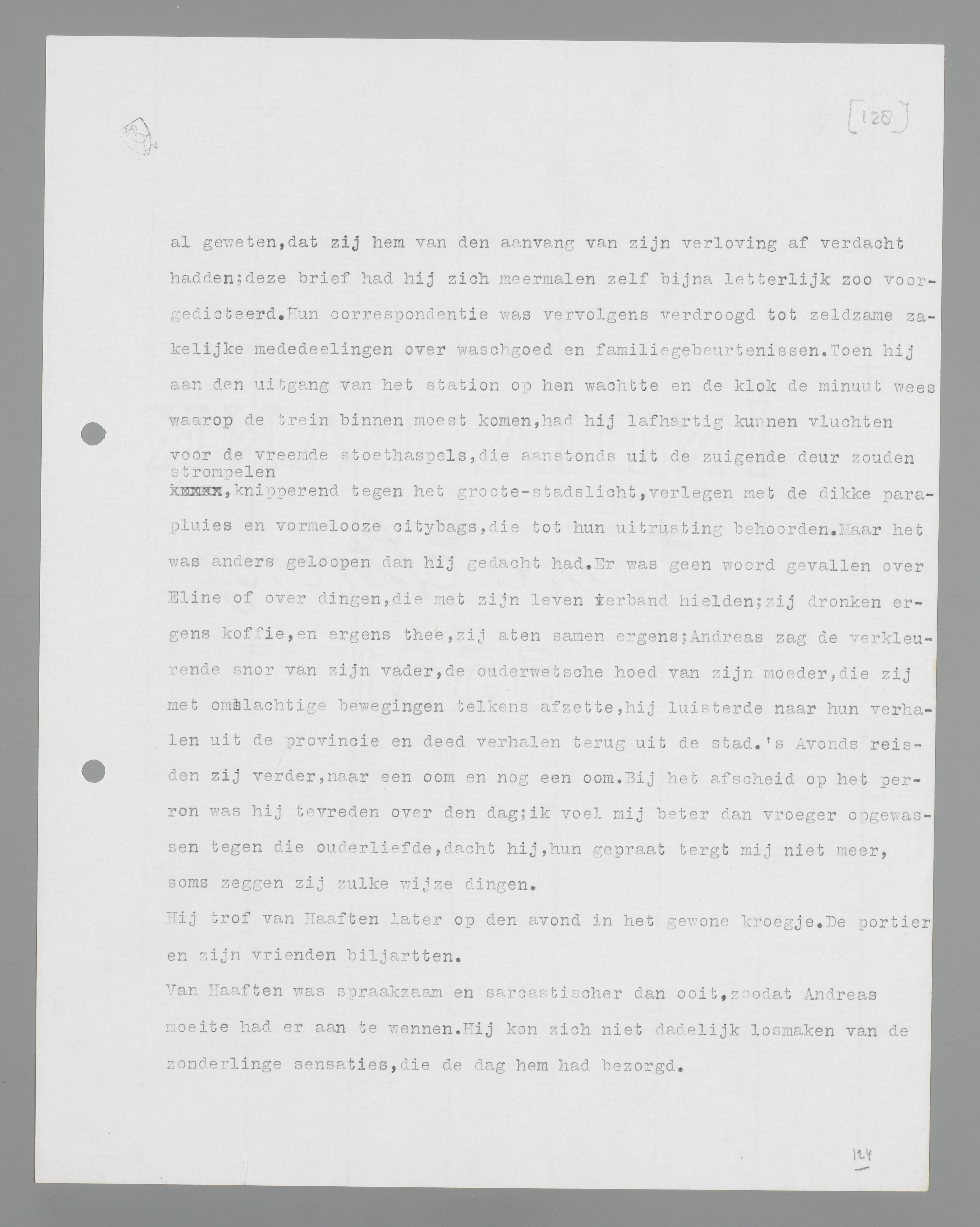 Ditmaal echter leek hem hun aanwezigheid bepaald ondraaglijk. Hij had hen zonder veel commentaar in kennis gesteld van het verbreken van zijn verloving met Eline; daarop had zijn moeder geantwoord, dat zij in Eline juist een goede vrouw voor hem gezien had, maar dat zij zich geen van beiden met de motieven, die hem tot dat besluit gebracht hadden, wilden bemoeien. Het antwoord had hem geheel onverschillig gelaten; hij had trouwens van te voren al geweten, dat zij hem van den aanvang van zijn verloving af verdacht hadden; deze brief had hij zich meermalen zelf bijna letterlijk zoo voorgedicteerd. Hun correspondentie was vervolgens verdroogd tot zeldzame zakelijke mededeelingen over waschgoed en familiegebeurtenissen. Toen hij aan den uitgang van het station op hen wachtte en de klok de minuut wees waarop de trein binnen moest komen, had hij lafhartig kunnen vluchten voor de vreemde stoethaspels, die aanstonds uit de zuigende deur zouden strompelen, knipperend tegen het groote-stadslicht, verlegen met de dikke parapluies en vormelooze citybags, die tot hun uitrusting behoorden. Maar het was anders geloopen dan hij gedacht had. Er was geen woord gevallen over Eline of over dingen, die met zijn leven verband hielden; zij dronken ergens koffie, en ergens thee, zij aten samen ergens; Andreas zag de verkleurende snor van zijn vader, den ouderwetschen hoed van