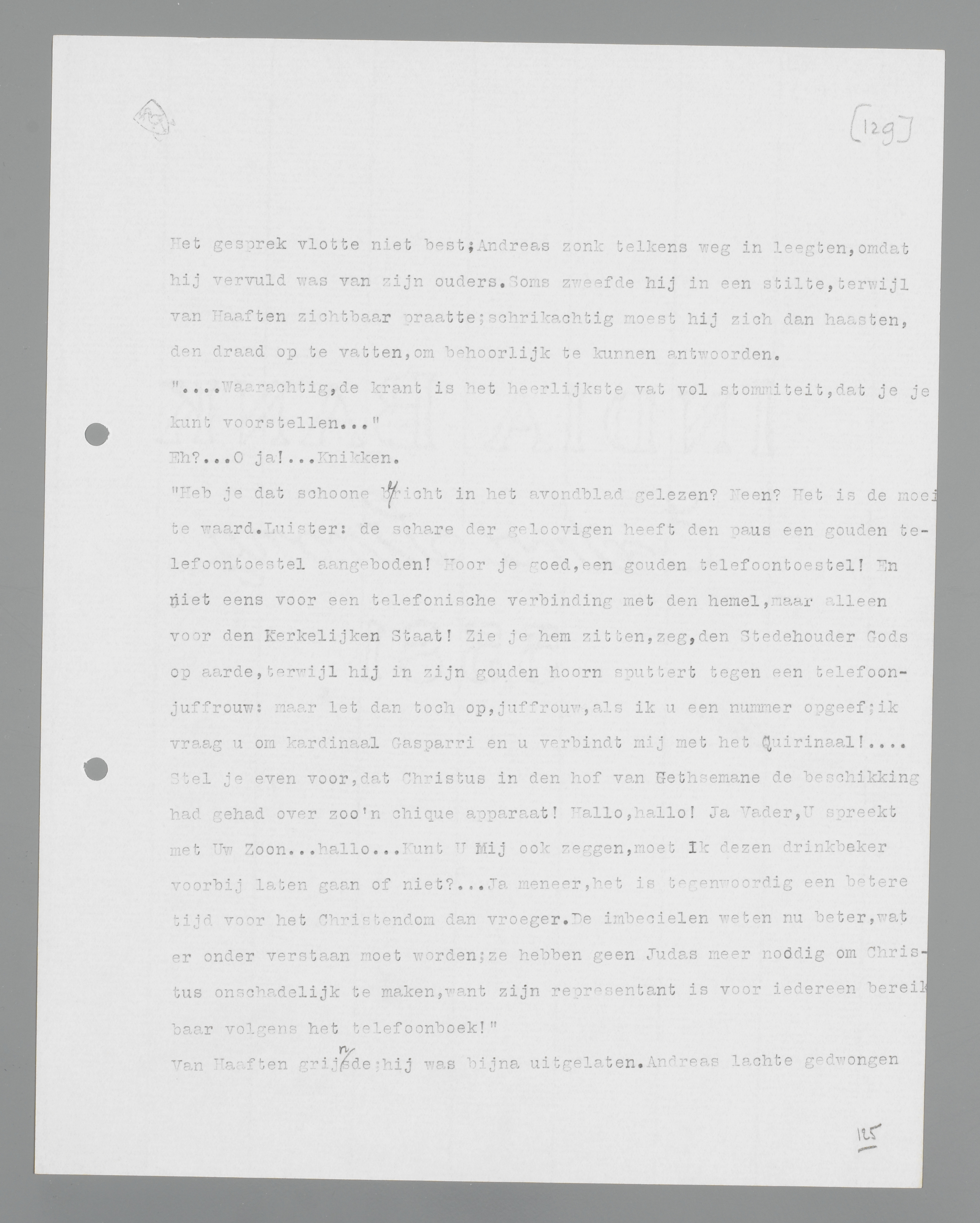 ‘Heb je dat schoone bericht in het avondblad gelezen? Neen? Het is de moeite waard. Luister: de schare der geloovigen heeft den paus een gouden telefoontoestel aangeboden! Hoor je goed, een gouden te-