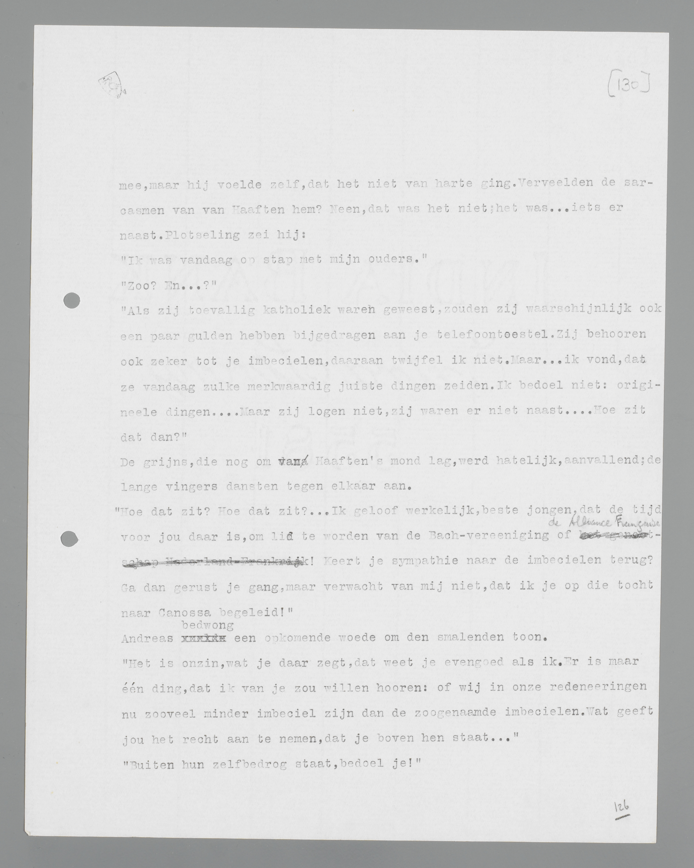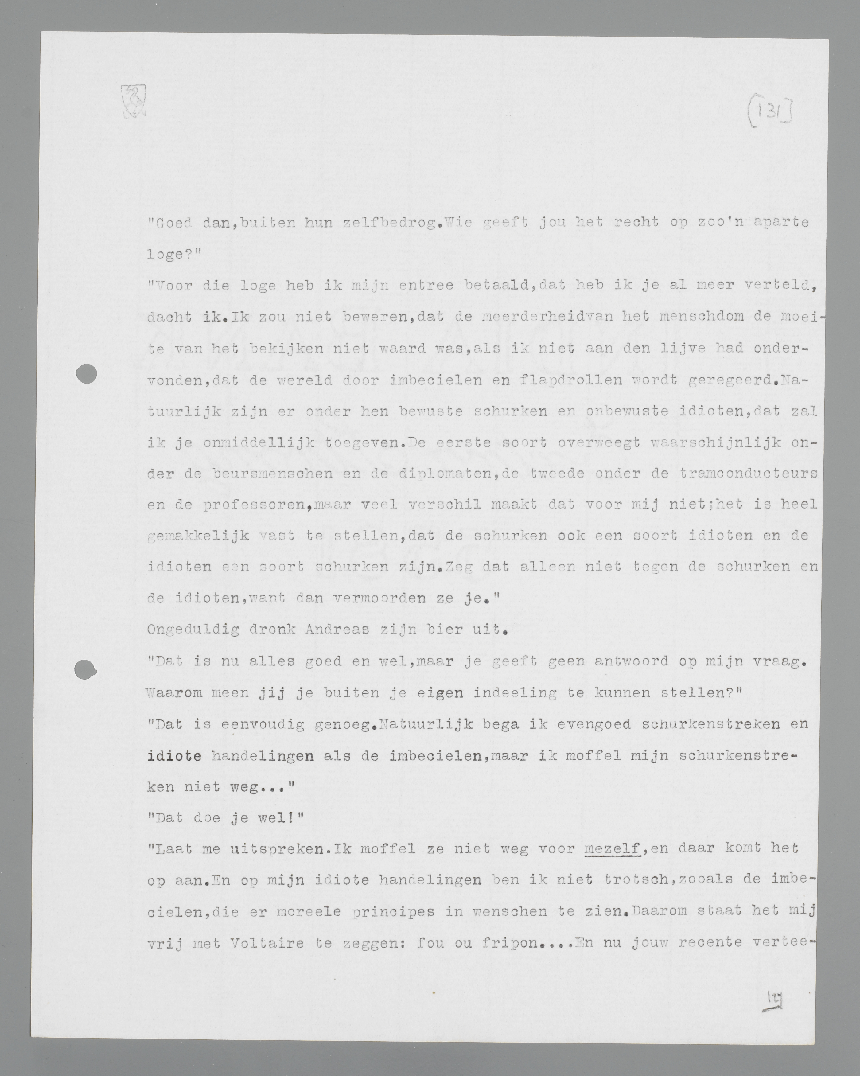 ‘Het is onzin, wat je daar zegt, dat weet je evengoed als ik. Er is maar één ding, dat ik van je zou willen hooren: of wij in onze redeneeringen nu zooveel minder imbeciel zijn dan de zoogenaamde imbecielen. Wat geeft jou het recht aan te nemen, dat je boven hen staat....’