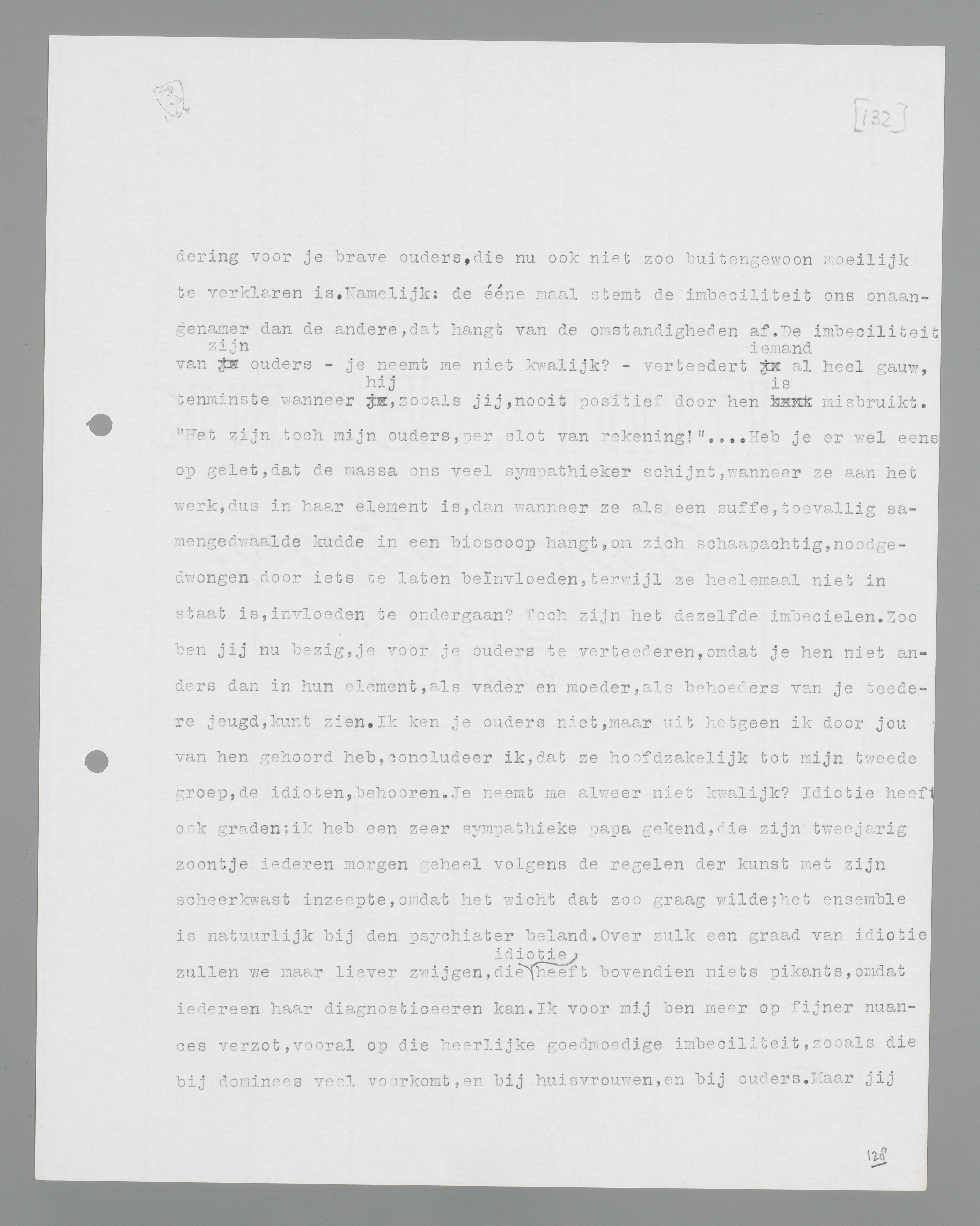 die er moreele principes in wenschen te zien. Daarom staat het mij vrij met Voltaire te zeggen: fou ou fripon.... En nu jouw recente verteedering voor je brave ouders, die nu ook niet zoo buitengewoon moeilijk te verklaren is. Namelijk: de ééne maal stemt de imbecilliteit ons aangenamer dan de andere, dat hangt van de omstandigheden af. De imbecilliteit van zijn ouders - je neemt me niet kwalijk? - verteedert iemand al heel gauw, ten minste wanneer hij, zooals jij, nooit positief door hen is misbruikt. “Het zijn toch mijn ouders, per slot van rekening!”.... Heb je er wel eens op gelet, dat de massa ons veel sympathieker schijnt, wanneer ze aan het werk, dus in haar element is, dan wanneer ze als een suffe, toevallig samengedwaalde kudde in een bioscoop hangt, om zich schaapachtig, noodgedwongen door iets te laten beïnvloeden, terwijl ze heelemaal niet in staat is, invloeden te ondergaan? Toch zijn het dezelfde imbecielen. Zoo ben jij nu bezig, je voor je ouders te verteederen, omdat je hen niet anders dan in hun element, als vader en moeder, als behoeders van je teedere jeugd, kunt zien. Ik ken je ouders niet, maar uit hetgeen ik door jou van hen gehoord heb, concludeer ik, dat ze hoofdzakelijk tot mijn tweede groep, de idioten, behooren. Je neemt me alweer niet kwalijk? Idiotie heeft ook graden; ik heb een zeer sympathieke papa gekend, die zijn tweejarig zoontje