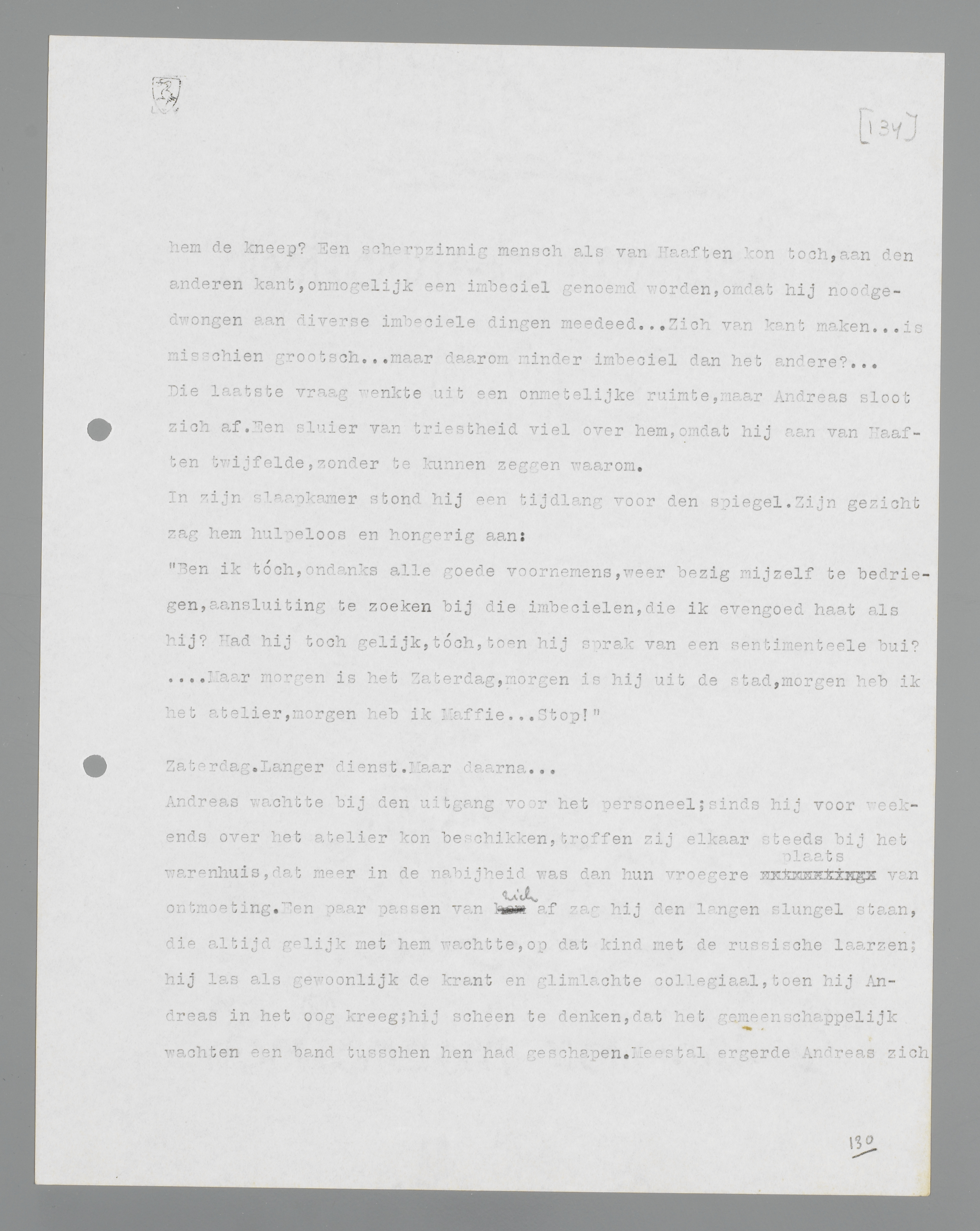 Andreas wachtte bij den uitgang voor het personeel; sinds hij voor week-ends over het atelier kon beschikken, troffen zij elkaar steeds bij het warenhuis, dat meer in de nabijheid was dan hun vroegere plaats van ontmoeting. Een paar passen van hem af zag hij den langen slungel staan, die altijd gelijk met hem wachtte, op dat kind met de russische laarzen; hij las als gewoonlijk de krant en glimlachte collegiaal, toen hij Andreas in het oog kreeg; hij scheen te denken, dat het gemeenschappelijk wachten een band tusschen hen had geschapen. Meestal ergerde Andreas zich aan dien glimlach, waardoor hij zich bespottelijk voelde, zooals hij daar stond te antichambreeren; verbeeldde die vent zich soms, dat hij zich met hem kon meten, alleen, omdat zij daar toevallig telkens samen in de kou geposteerd waren... Maar vandaag drong de aanwezigheid van den man nauwelijks tot Andreas door. Hij was niet gestemd om bijzaken op te