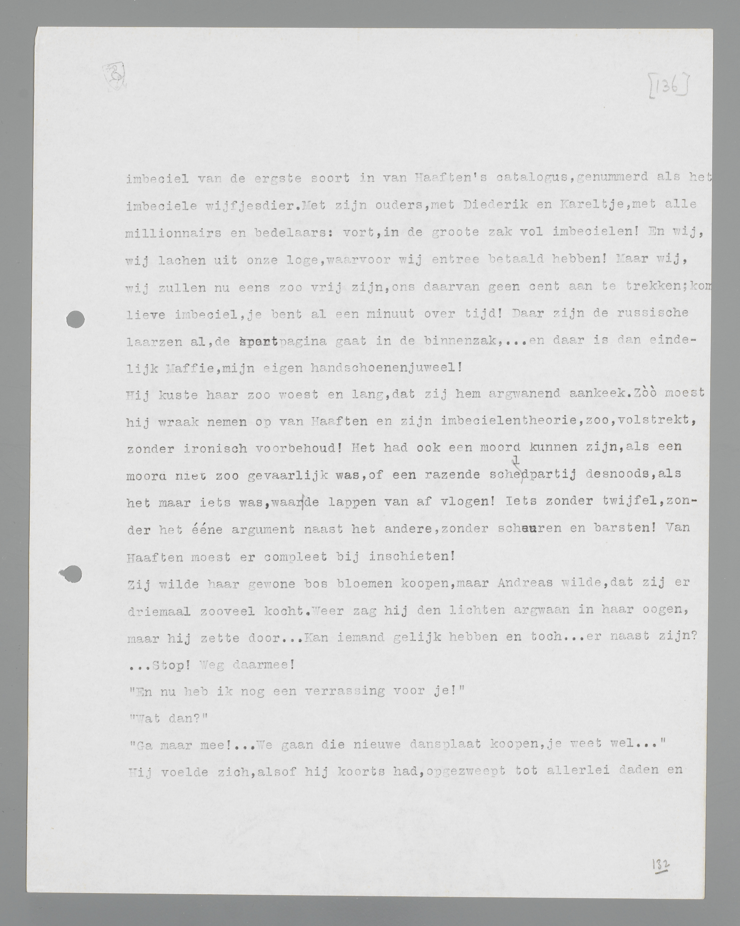 Andreas zag, hoe zijn collega de krant ijverig spelde; ah juist, de sportpagina! Imbeciel!.... Hm, hier stonden twee imbecielen te wachten op twee andere imbecielen.... Wat kon het hem verdommen! Natuurlijk was Maffie een imbeciel van de ergste soort in van Haaften's catalogus, genummerd als het im-