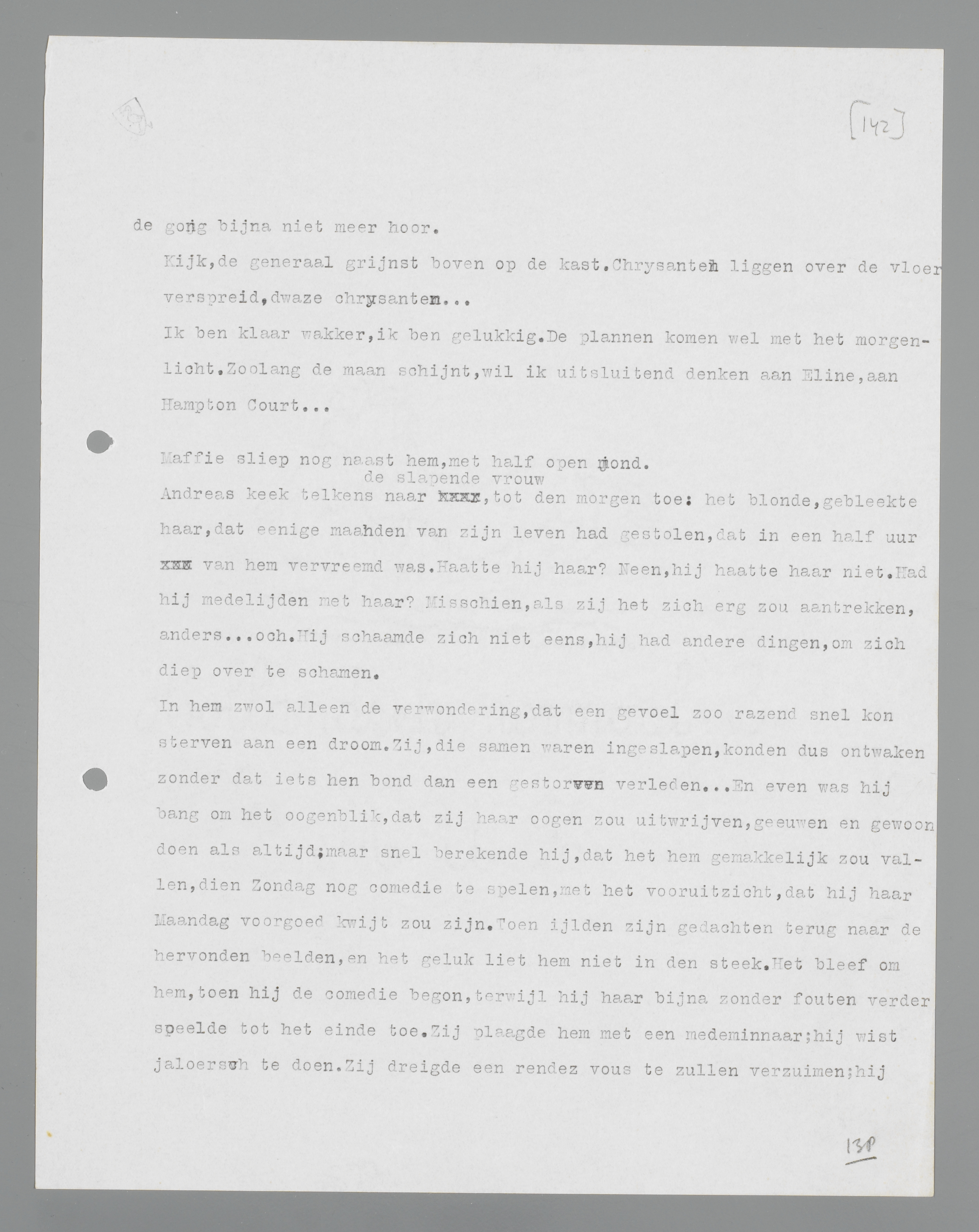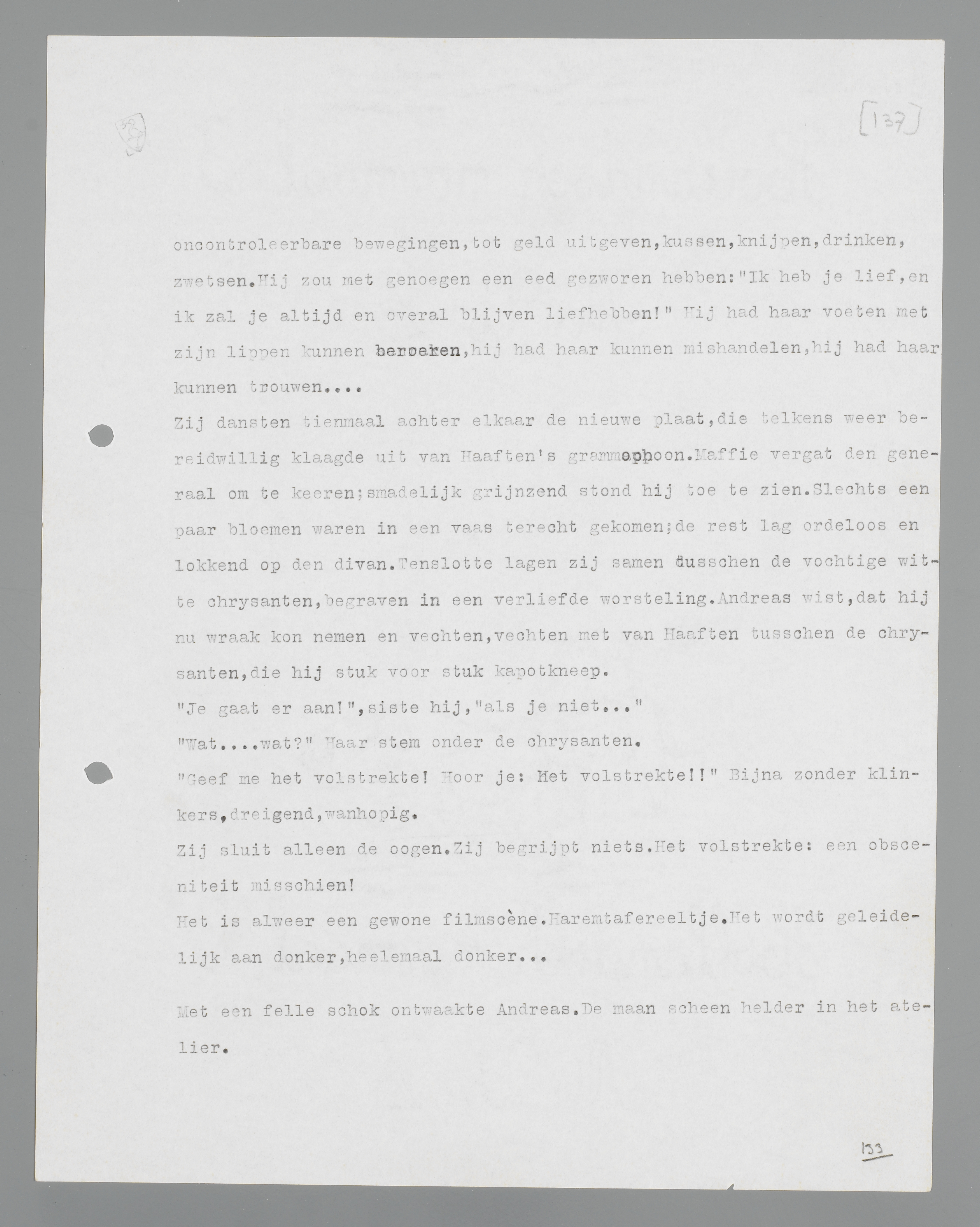 Andreas keek telkens naar de slapende vrouw, tot den morgen toe: het blonde, gebleekte haar, dat eenige maanden van zijn leven had gestolen, dat in een half uur van hem vervreemd was. Haatte hij haar? Neen, hij haatte haar niet. Had hij medelijden met haar? Misschien, als zij het zich erg zou aantrekken, anders.... och. Hij schaamde zich niet eens, hij had andere dingen, om zich diep over te schamen.