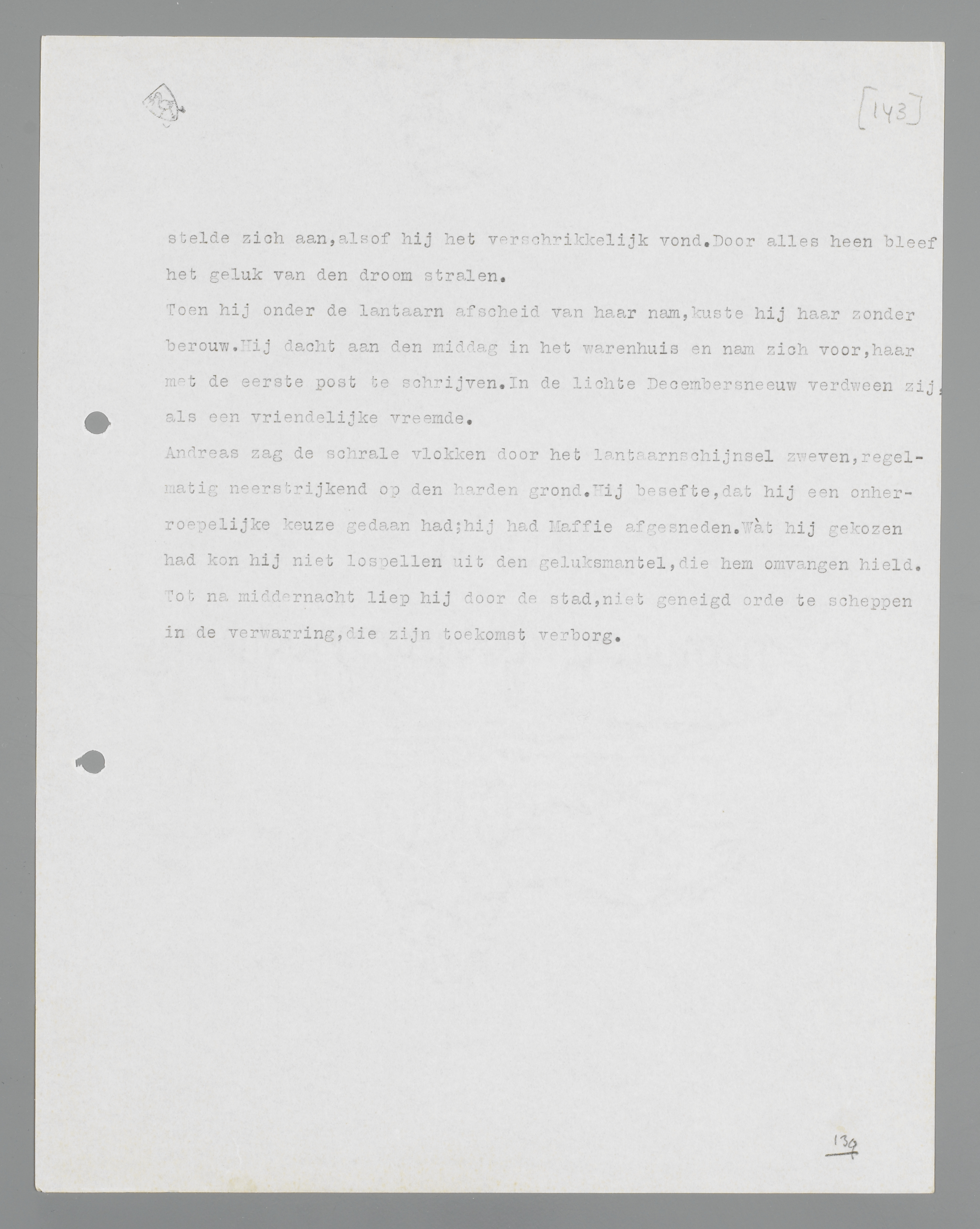 Toen hij onder de lantaarn afscheid van haar nam, kuste hij haar zonder berouw. Hij dacht aan den middag in het warenhuis en nam zich voor, haar met de eerste post te schrijven. In de lichte Decembersneeuw verdween zij als een vriendelijke vreemde.