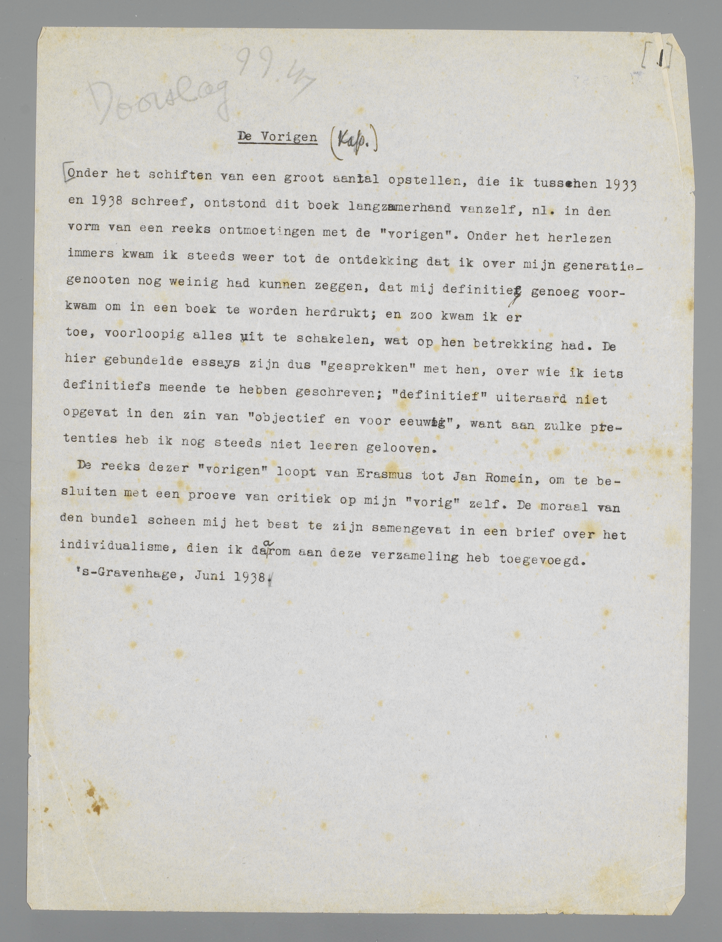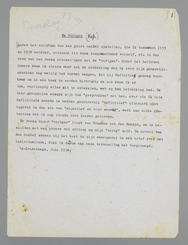 De reeks dezer ‘vorigen’ loopt van Erasmus tot Jan Romein, om te besluiten met een proeve van critiek op mijn ‘vorig’ zelf. De moraal van den bundel scheen mij het best te zijn samengevat in een brief over het individualisme, dien ik daarom aan deze verzameling heb toegevoegd.