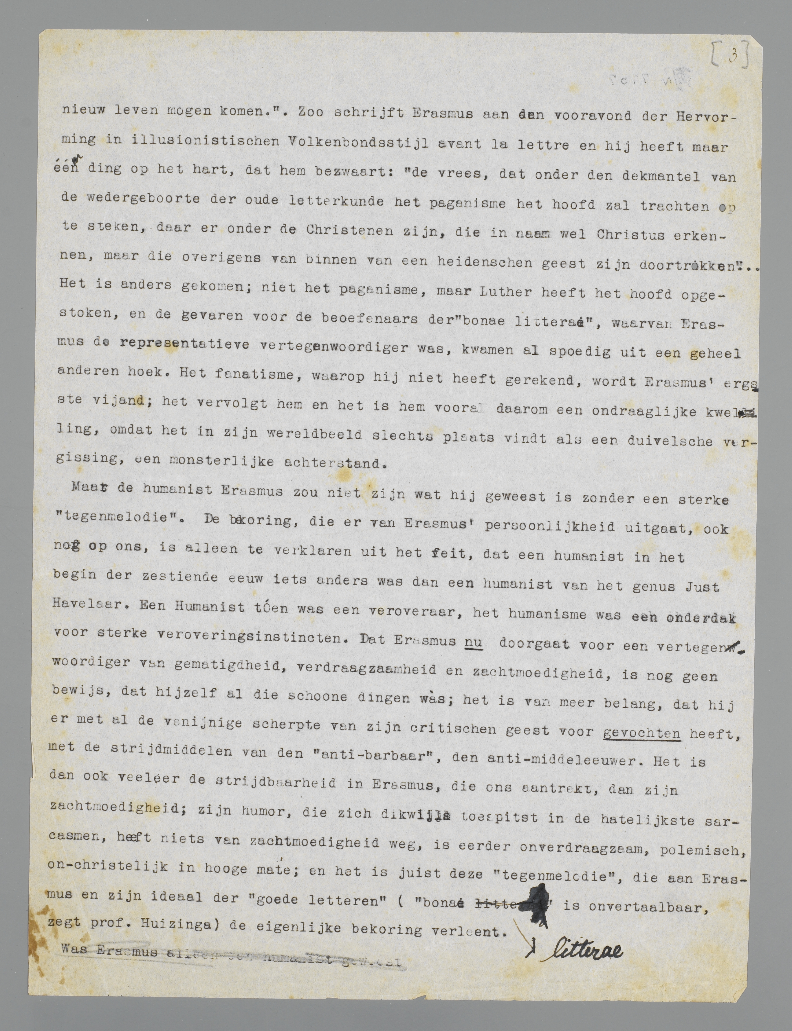 humor, die zich dikwijls toespitst in de hatelijkste sarcasmen, heeft niets van zachtmoedigheid weg, is eerder onverdraagzaam, polemisch, on-christelijk in hooge mate; en het is juist deze ‘tegenmelodie’, die aan Erasmus en zijn ideaal der ‘goede letteren’ (‘bonae litterae’ is onvertaalbaar, zegt prof. Huizinga) de eigenlijke bekoring verleent.