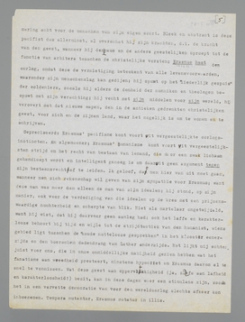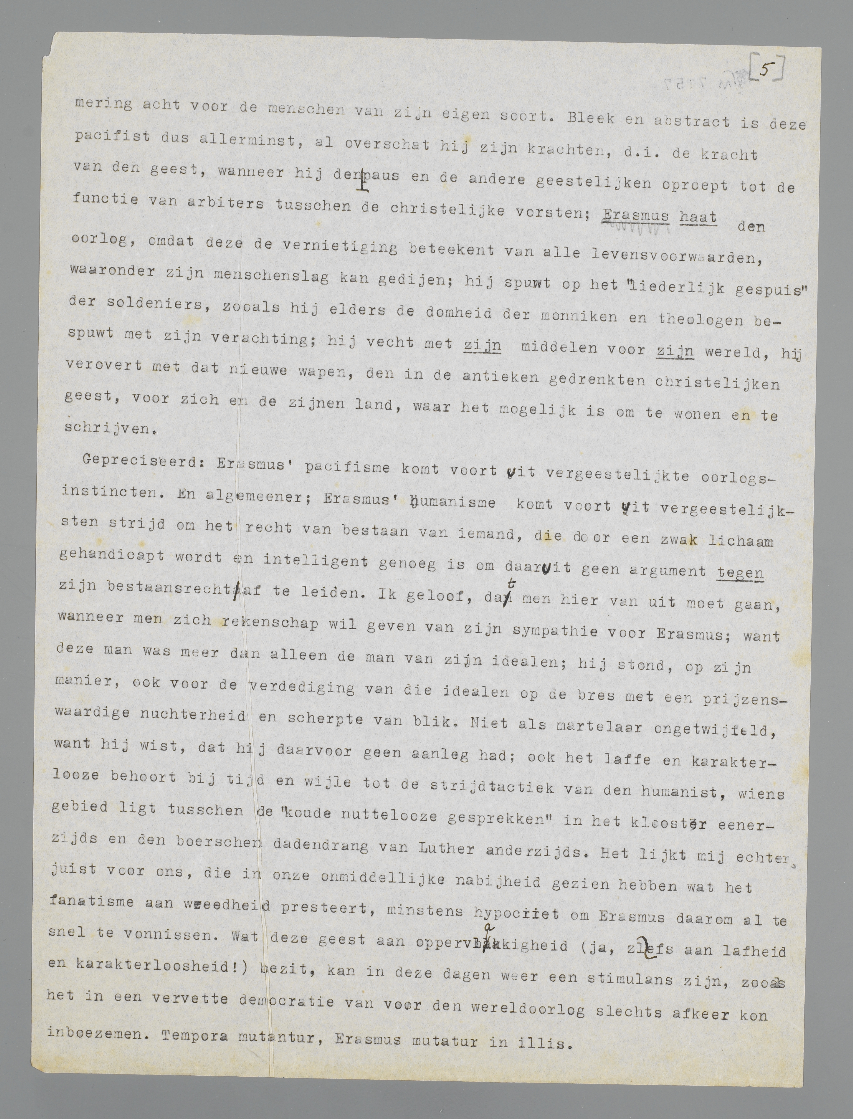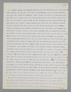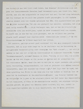 Gepreciseerd: Erasmus' pacifisme komt voort uit vergeestelijkte oorlogsinstincten. En algemeener: Erasmus' humanisme komt voort uit vergeestelijksten strijd om het recht van bestaan van iemand, die door een zwak lichaam gehandicapt wordt en intelligent genoeg is om daaruit geen argument tegen zijn bestaansrecht af te leiden. Ik geloof, dat men hier van uit moet gaan, wanneer men zich rekenschap wil geven van zijn sympathie voor Erasmus; want deze man was meer dan alleen de man van zijn idealen; hij stond, op zijn manier, ook voor de verdediging van die idealen op de bres met een prijzenswaardige nuchterheid en scherpte