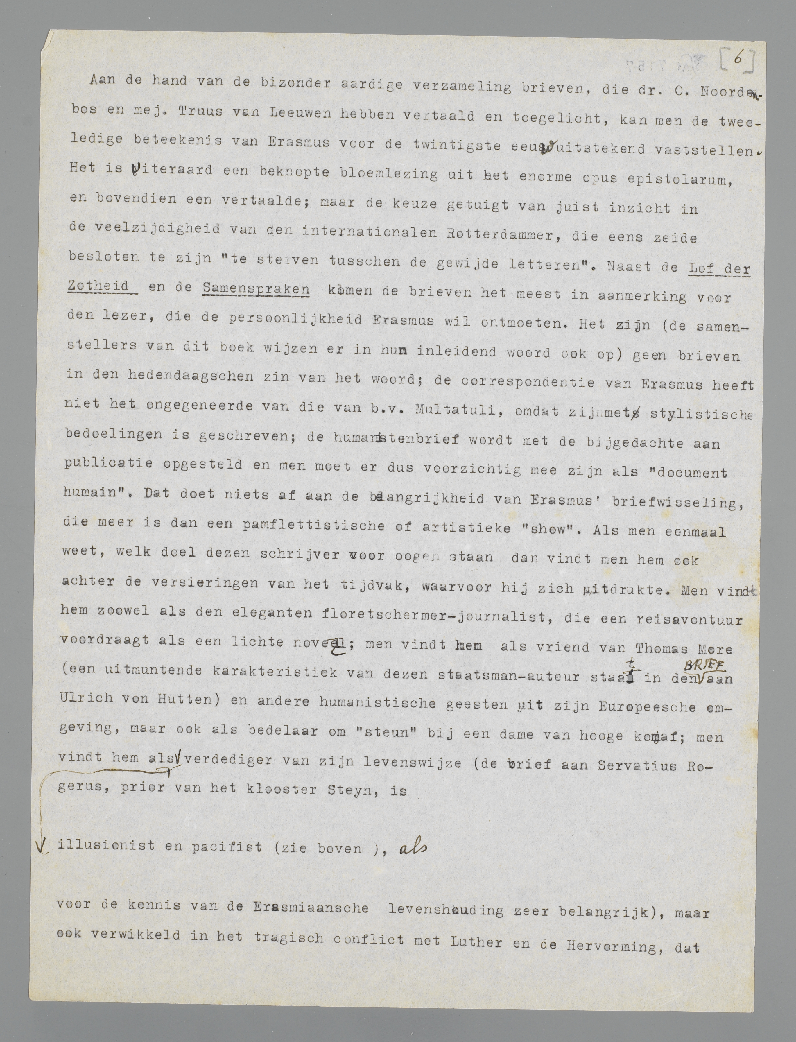 Samenspraken komen de brieven het meest in aanmerking voor den lezer, die de persoonlijkheid Erasmus wil ontmoeten. Het zijn (de samenstellers van dit boek wijzen er in hun inleidend woord ook op) geen brieven in den hedendaagschen zin van het woord; de correspondentie van Erasmus heeft niet het ongegeneerde van die van b.v. Multatuli, omdat zij met stylistische bedoelingen is geschreven; de humanistenbrief wordt met de bijgedachte aan publicatie opgesteld en men moet er dus voorzichtig mee zijn als ‘document humain’. Dat doet niets af aan de belangrijkheid van Erasmus' briefwisseling, die meer is dan een pamflettistische of artistieke ‘show’. Als men eenmaal weet, welk doel dezen schrijver voor oogen staat, dan vindt men hem ook achter de versieringen van het tijdvak, waarvoor hij zich uitdrukte. Men vindt hem zoowel als den eleganten floretschermer-journalist, die een reisavontuur voordraagt als een lichte novelle; men vindt hem als vriend van Thomas More (een uitmuntende karakteristiek van dezen staatsman-auteur staat in den brief aan Ulrich von Hutten) en andere humanistische geesten uit zijn Europeesche omgeving, maar ook als bedelaar om ‘steun’ bij een dame van hooge komaf; men vindt hem als illusionist en pacifist (zie boven), als verdediger van zijn levenswijze (de brief aan Servatius Rogerus, prior van het klooster Steyn, is
