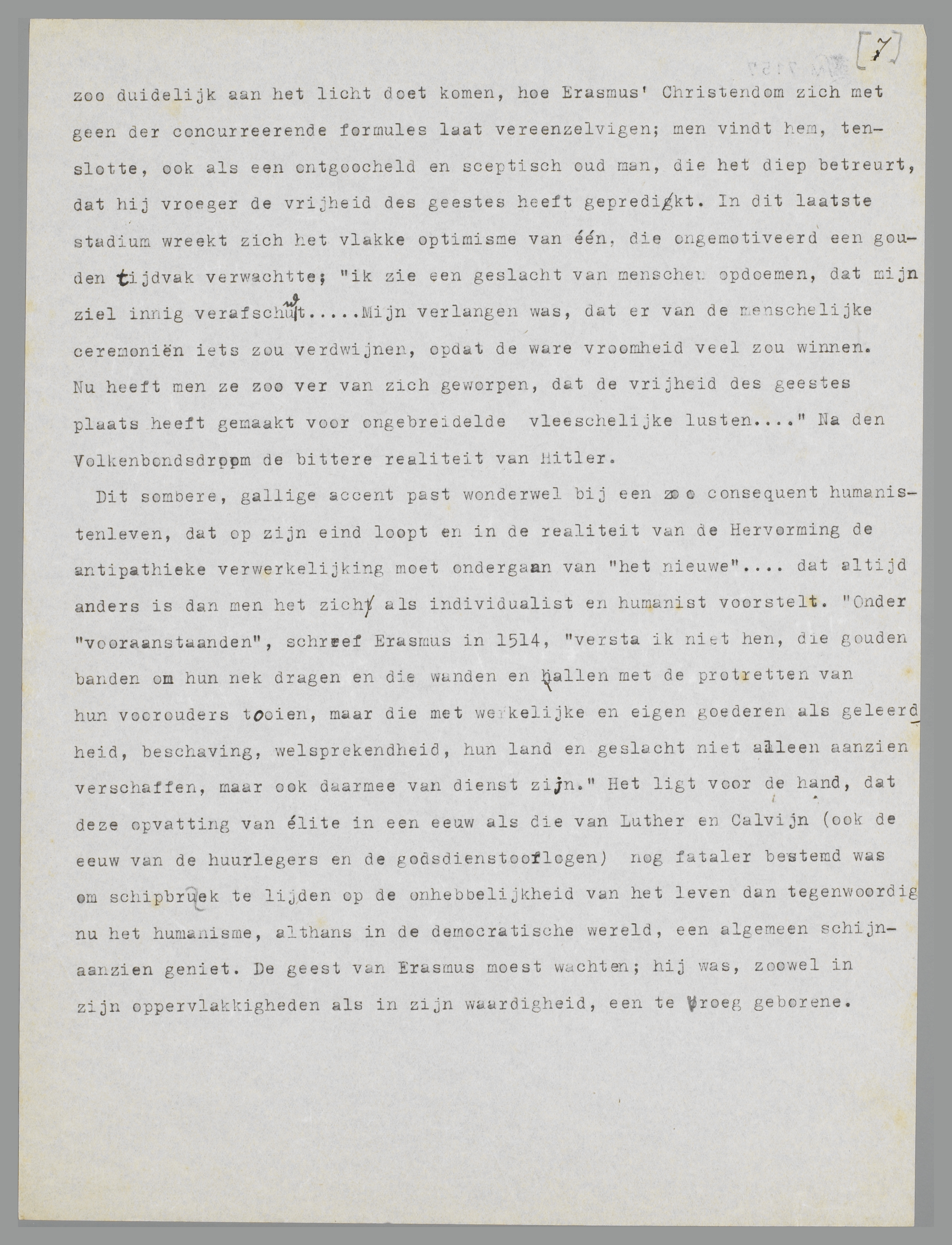 voor de kennis van de Erasmiaansche levenshouding zeer belangrijk), maar ook verwikkeld in het tragisch conflict met Luther en de Hervorming, dat zoo duidelijk aan het licht doet komen, hoe Erasmus' Christendom zich met geen der concurreerende formules laat vereenzelvigen; men vindt hem, tenslotte, ook als een ontgoocheld en sceptisch oud man, die het diep betreurt, dat hij vroeger de vrijheid des geestes heeft gepredikt. In dit laatste stadium wreekt zich het vlakke optimisme van één, die ongemotiveerd een gouden tijdvak verwachtte; ‘ik zie een geslacht van menschen opdoemen, dat mijn ziel innig verafschuwt... Mijn verlangen was, dat er van de menschelijke ceremoniën iets zou verdwijnen, opdat de ware vroomheid veel zou winnen. Nu heeft men ze zoo ver van zich geworpen, dat de vrijheid des geestes plaats heeft gemaakt voor ongebreidelde vleeschelijke lusten...’ Na den Volkenbondsdroom de bittere realiteit van Hitler.
