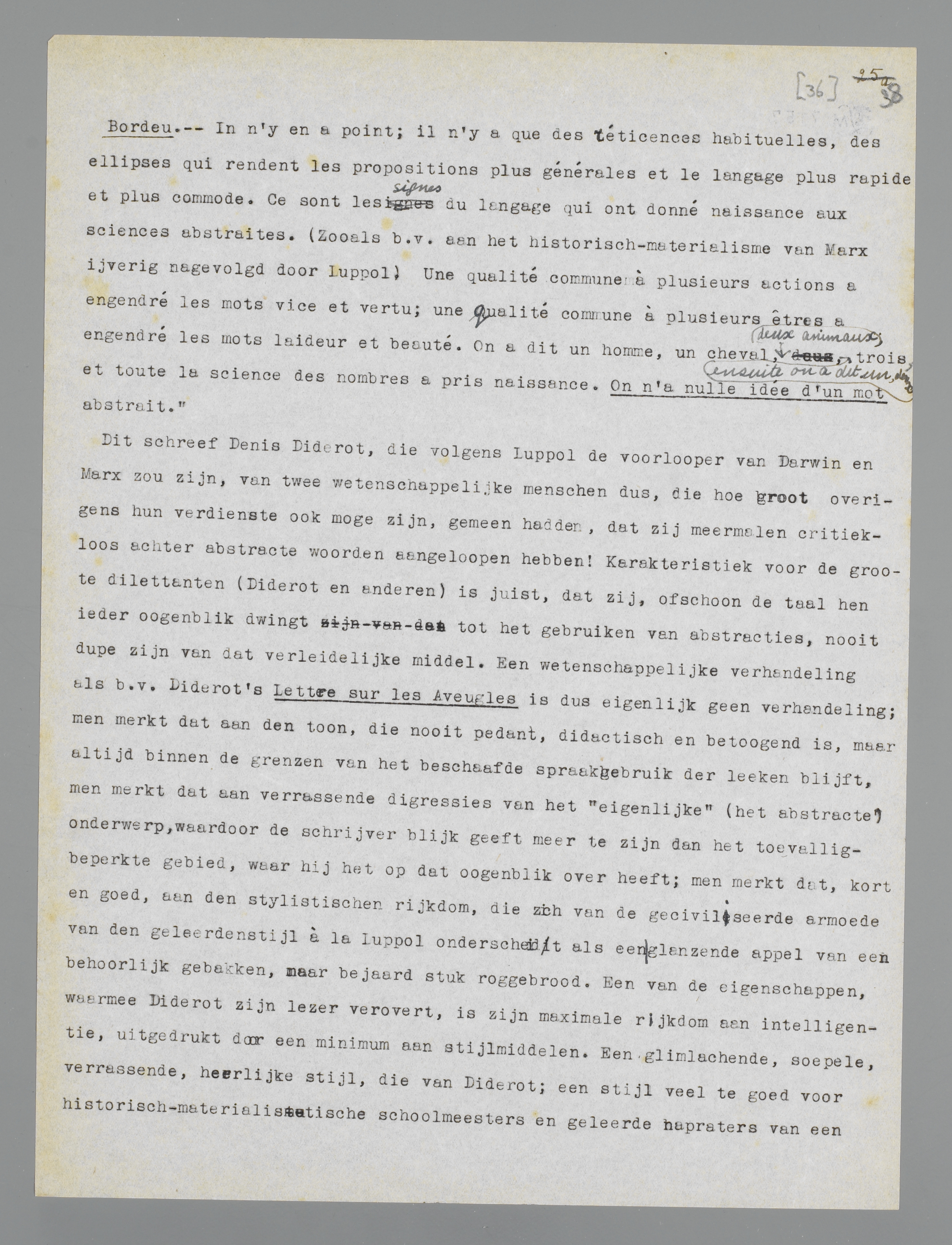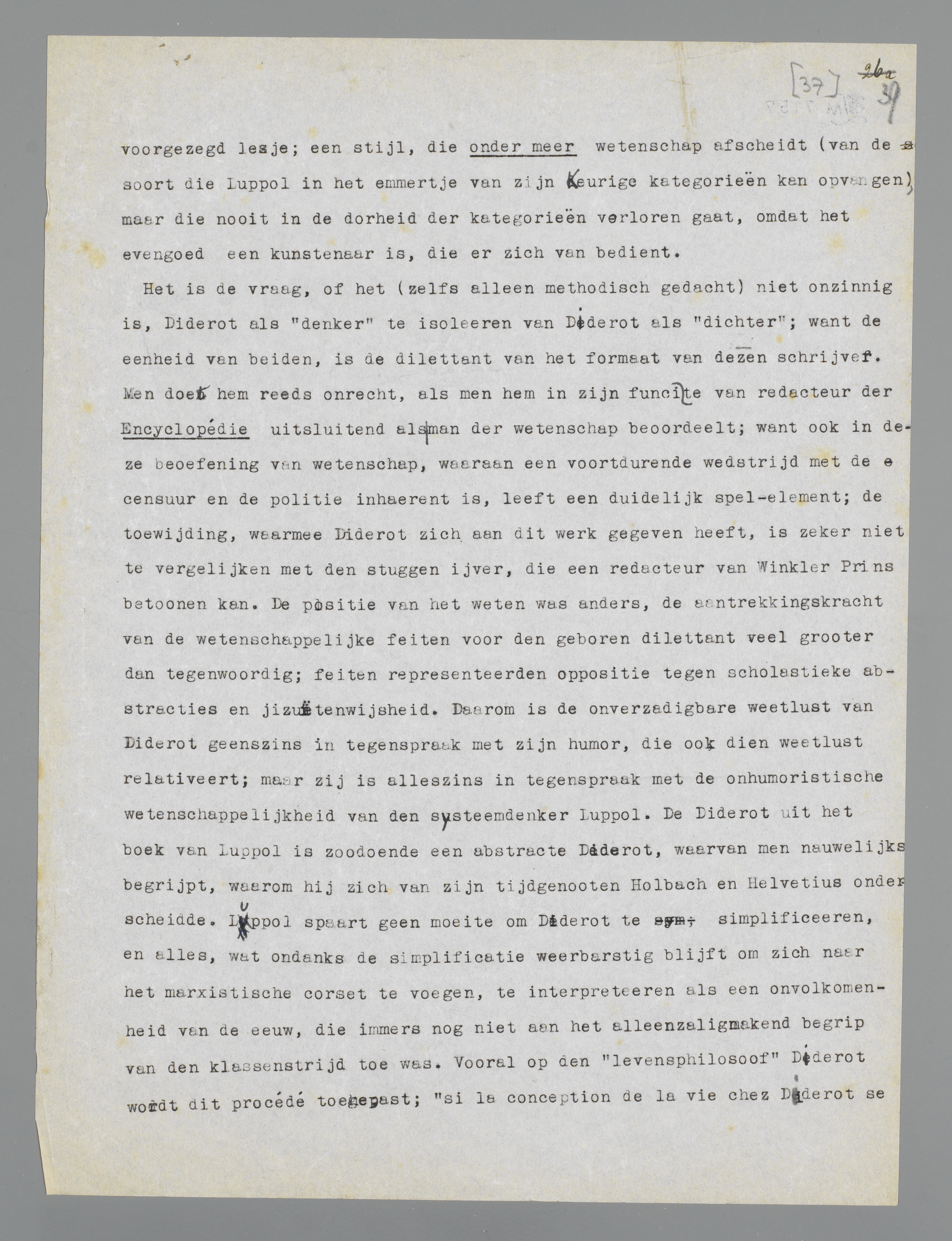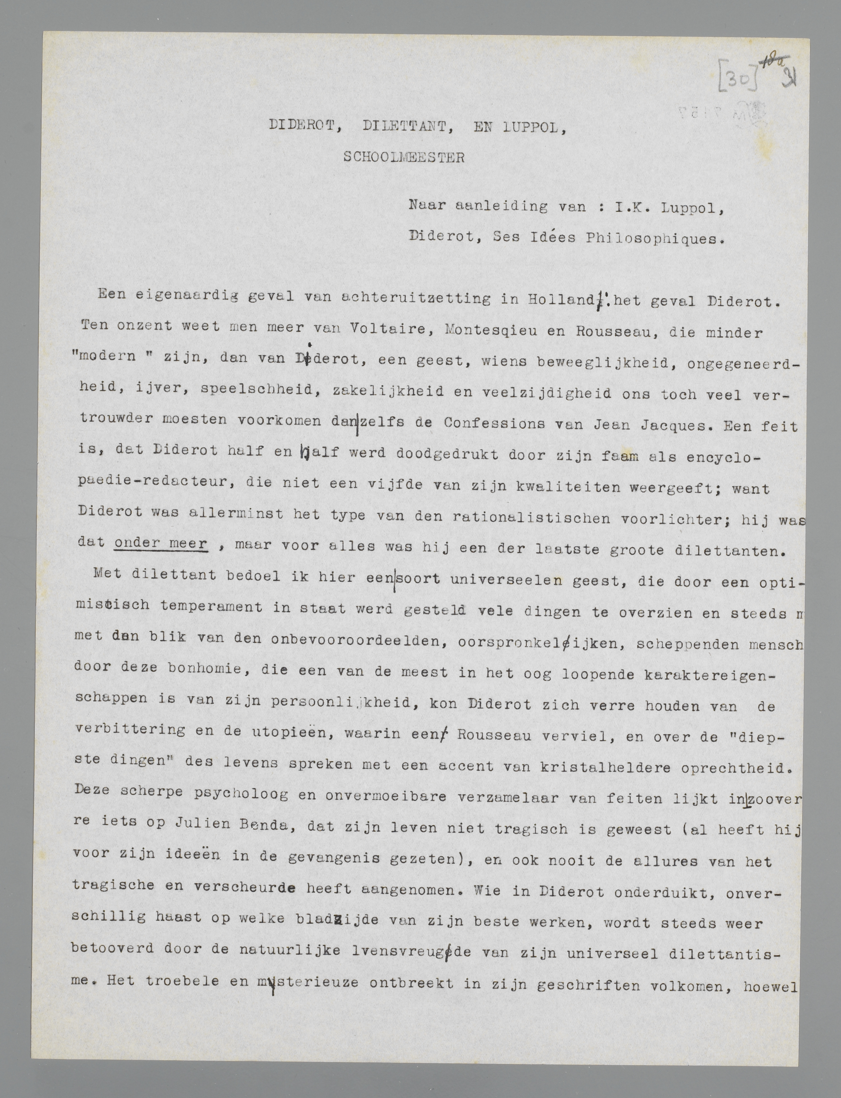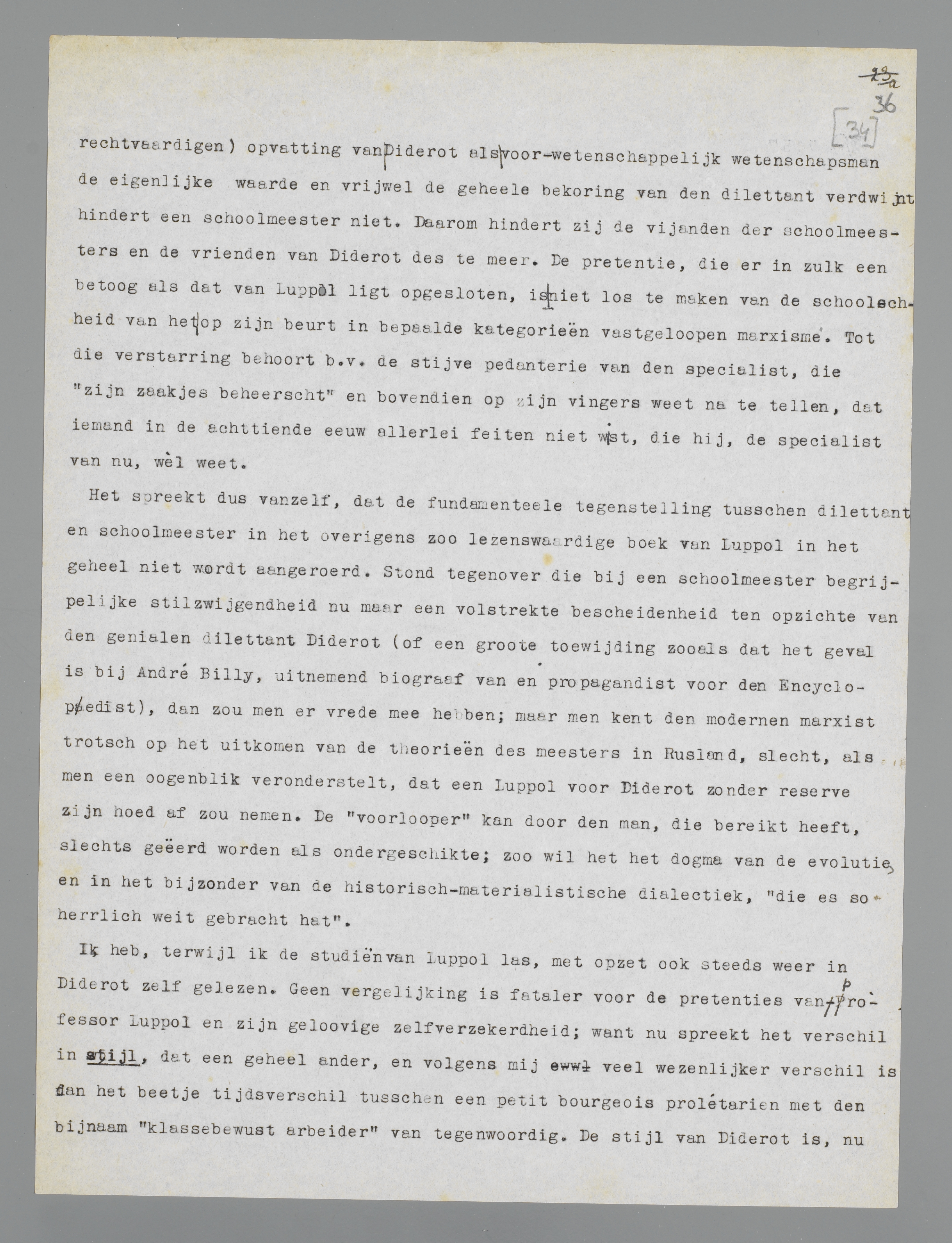 Dat vooropgesteld, ben ik er na lezing van het interessante boek van Luppol meer dan ooit van overtuigd, dat Diderot alle superieure schoolmeesters van het soort Luppol, marxist of niet marxist, over de geheele linie slaat, ook tegenwoordig, door zijn zeldzaam elastische intelligentie, zijn gebrek aan eerbied voor welke autoriteit ook, zijn enorme menschenkennis, kortom door datgene wat ik zijn dilettantisme noemde.