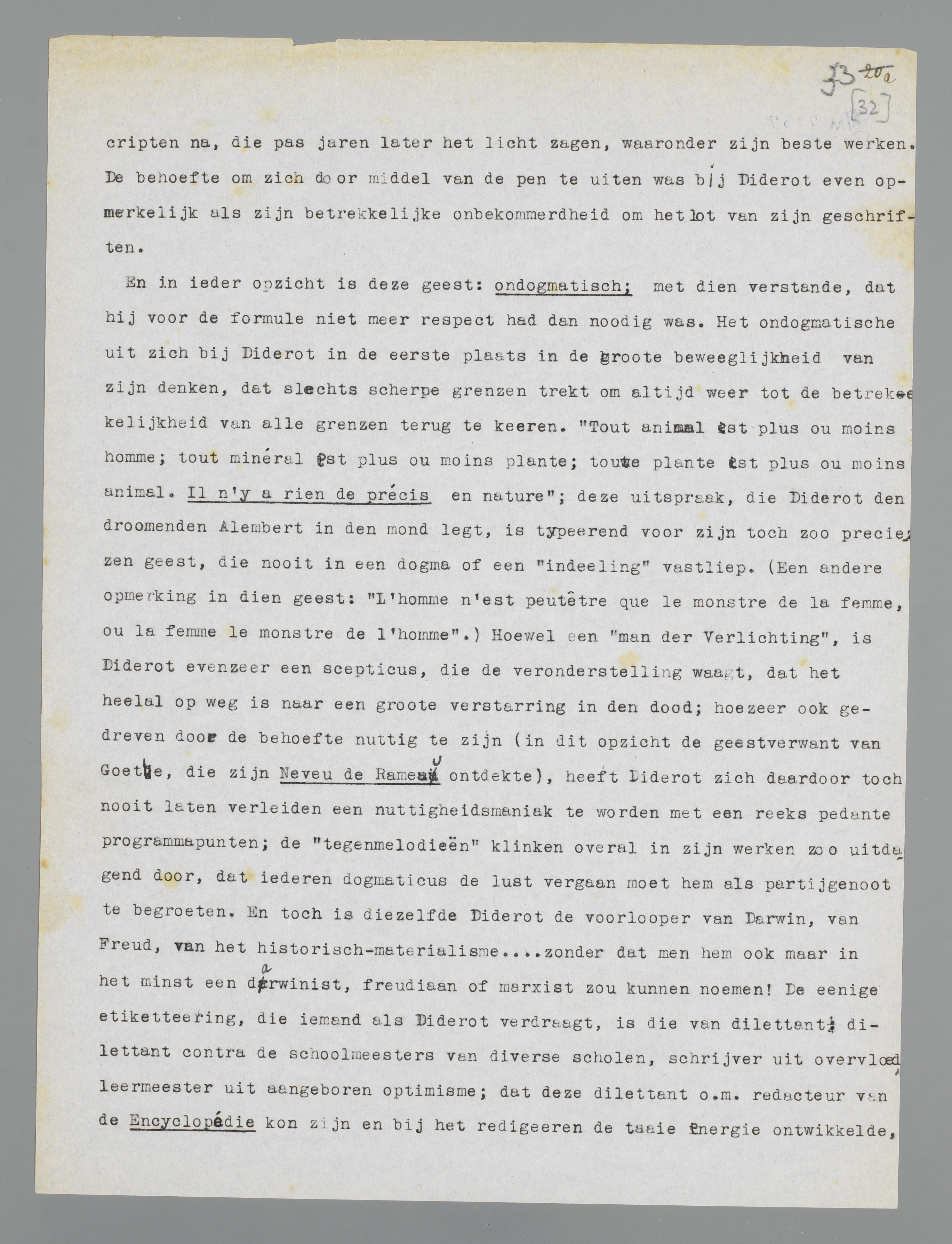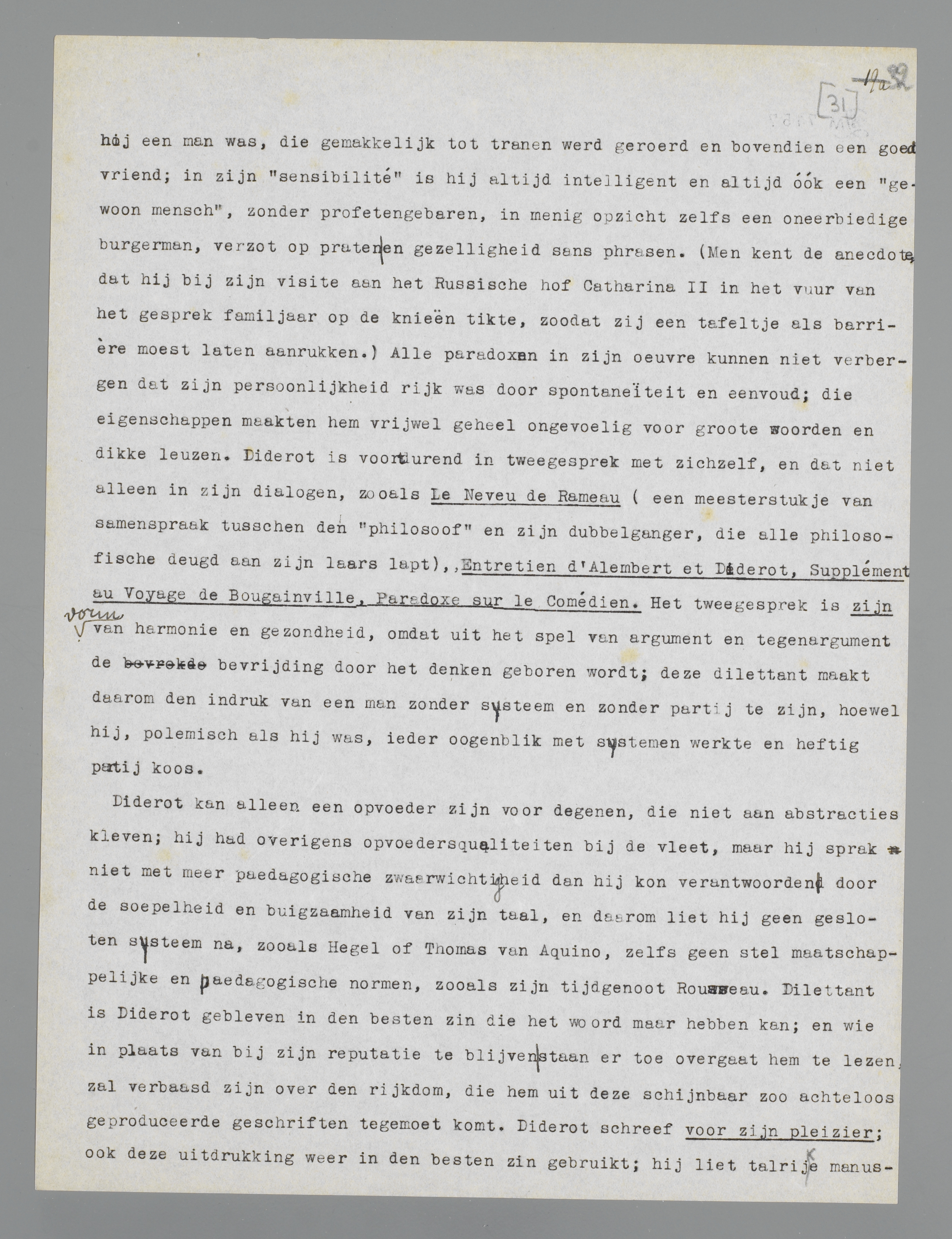 Een eigenaardig geval van achteruitzetting in Holland: het geval Diderot. Ten onzent weet men meer van Voltaire, Montesquieu en Rousseau, die minder ‘modern’ zijn, dan van Diderot, een geest, wiens beweeglijkheid, ongegeneerdheid, ijver, speelschheid, zakelijkheid en veelzijdigheid ons toch veel vertrouwder moesten voorkomen dan zelfs de Confessions van Jean Jacques. Een feit is, dat Diderot half en half werd doodgedrukt door zijn faam als encyclopaedie-redacteur, die niet een vijfde van zijn kwaliteiten weergeeft; want Diderot was allerminst het type van den rationalistischen voorlichter; hij was dat onder meer, maar voor alles was hij een der laatste groote dilettanten.