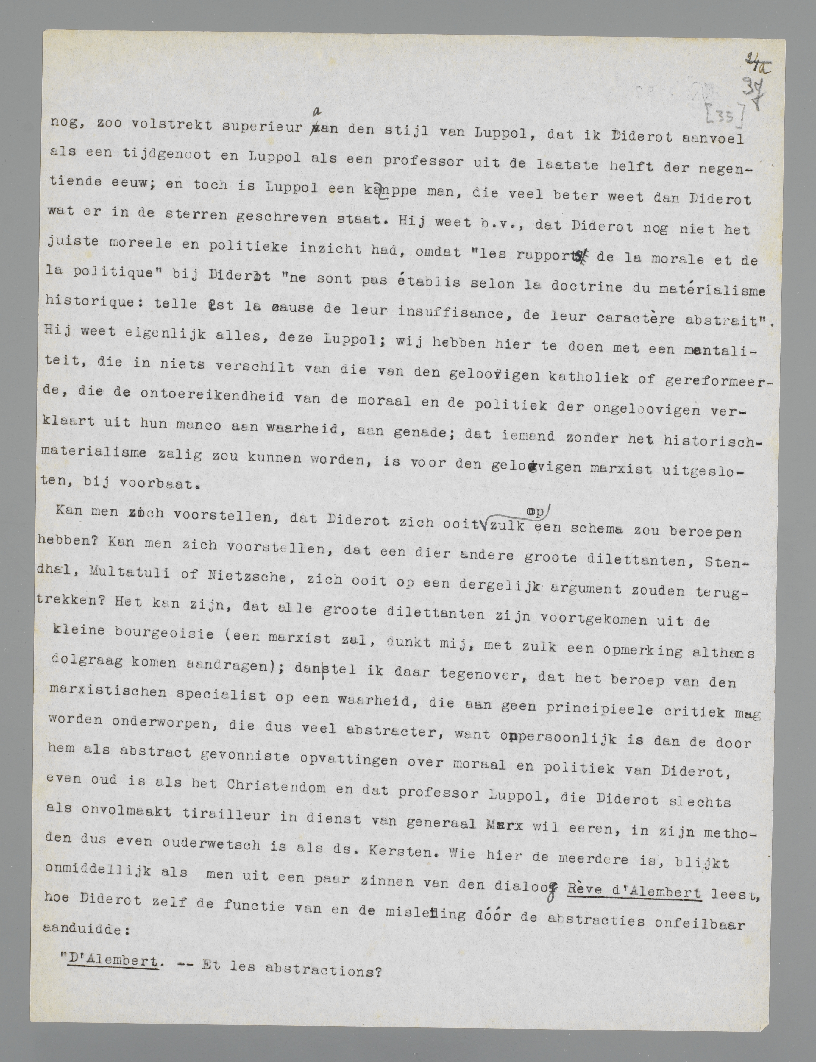ooit op zulk een schema zou beroepen hebben? Kan men zich voorstellen, dat een dier andere groote dilettanten, Stendhal, Multatuli of Nietzsche, zich ooit op een dergelijk argument zouden terugtrekken? Het kan zijn, dat alle groote dilettanten zijn voortgekomen uit de kleine bourgeoisie (een marxist zal, dunkt mij, met zulk een opmerking althans dolgraag komen aandragen); dan stel ik daar tegenover, dat het beroep van den marxistischen specialist op een waarheid, die aan geen principieele critiek mag worden onderworpen, die dus veel abstracter, want onpersoonlijker is dan de door hem als abstract gevonniste opvattingen over moraal en politiek van Diderot, even oud is als het Christendom en dat professor Luppol, die Diderot slechts als onvolmaakt tirailleur in dienst van generaal Marx wil eeren, in zijn methoden dus even ouderwetsch is als ds. Kersten. Wie hier de meerdere is, blijkt onmiddellijk, als men uit een paar zinnen van den dialoog Rêve d'Alembert leest, hoe Diderot zelf de functie van en de misleiding dóór de abstracties onfeilbaar aanduidde: