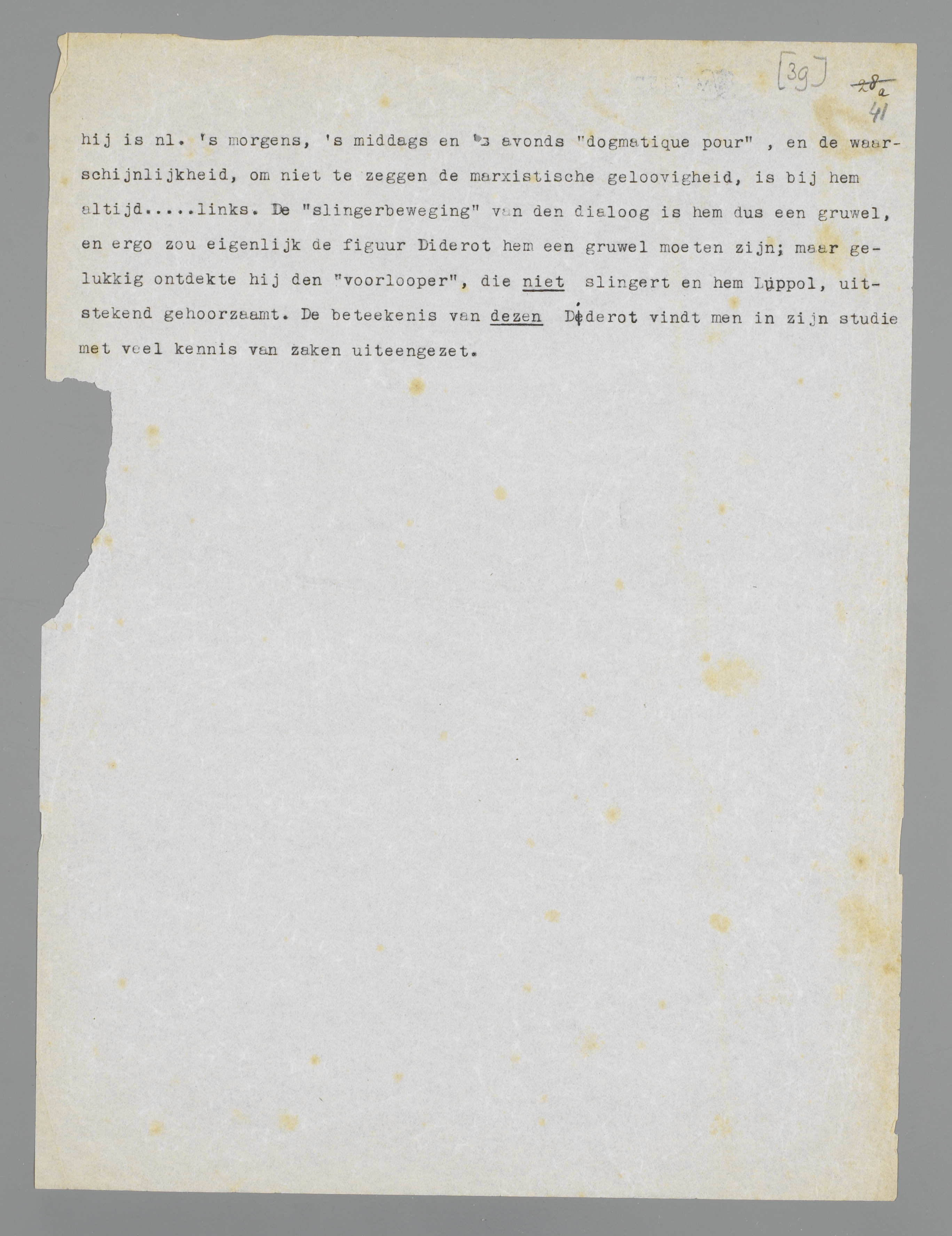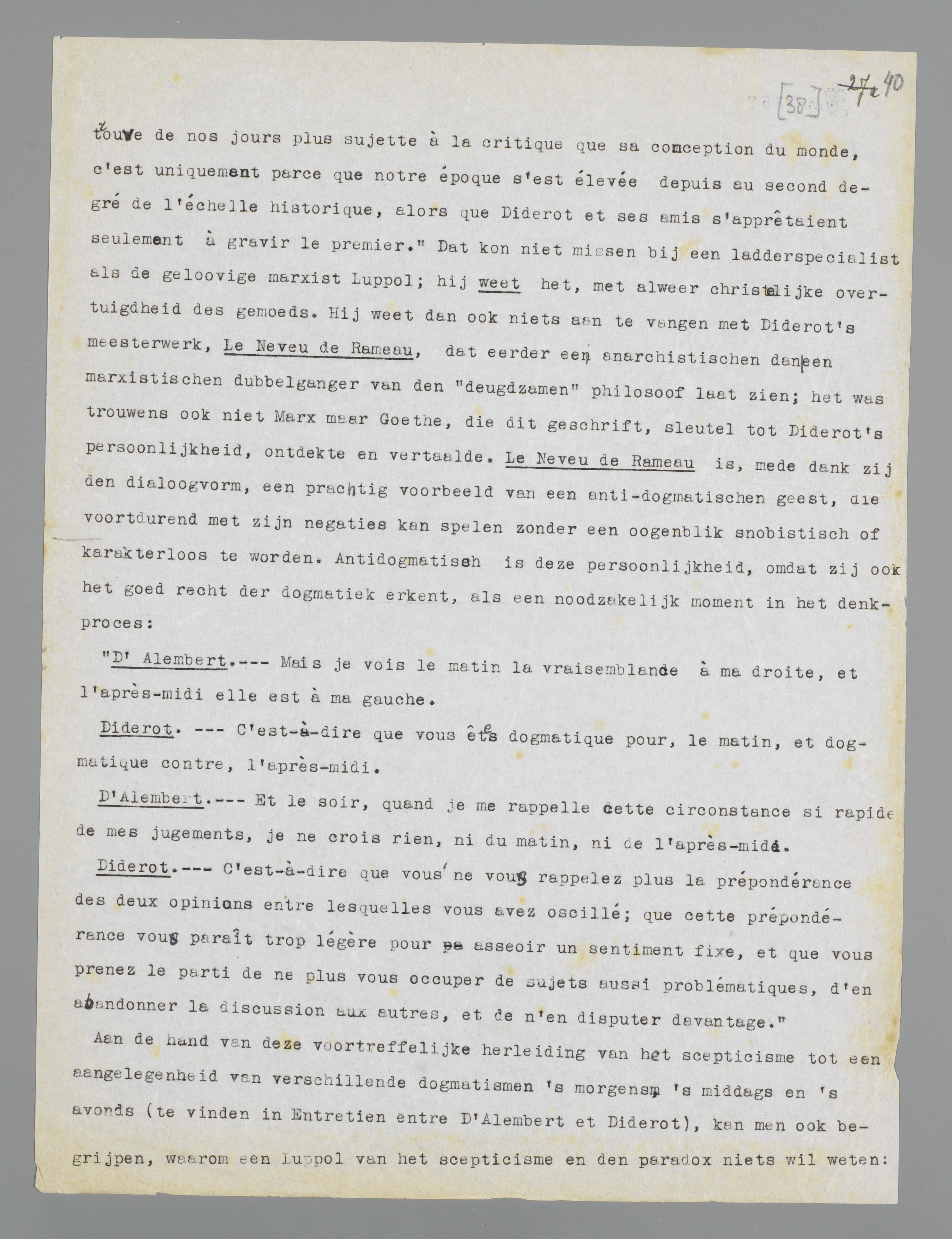 Aan de hand van deze voortreffelijke herleiding van het scepticisme tot een aangelegenheid van verschillende dogmatismen 's morgens, 's middags en 's avonds (te vinden in Entretien entre D'Alembert et Diderot), kan men ook begrijpen, waarom een Luppol van het scepticisme en den paradox niets wil weten: hij is nl. 's morgens, 's middags en 's avonds ‘dogmatique pour’, en de waarschijnlijkheid, om niet te zeggen de marxistische geloovigheid, is bij hem altijd... links. De ‘slingerbeweging’ van den dialoog is hem dus een gruwel, en ergo zou eigenlijk de figuur Diderot hem een gruwel moeten zijn; maar gelukkig ontdekte hij den ‘voorlooper’, die niet slingert en hem, Luppol, uitstekend gehoorzaamt. De beteekenis van dezen Diderot vindt men in zijn studie met veel kennis van zaken uiteengezet.