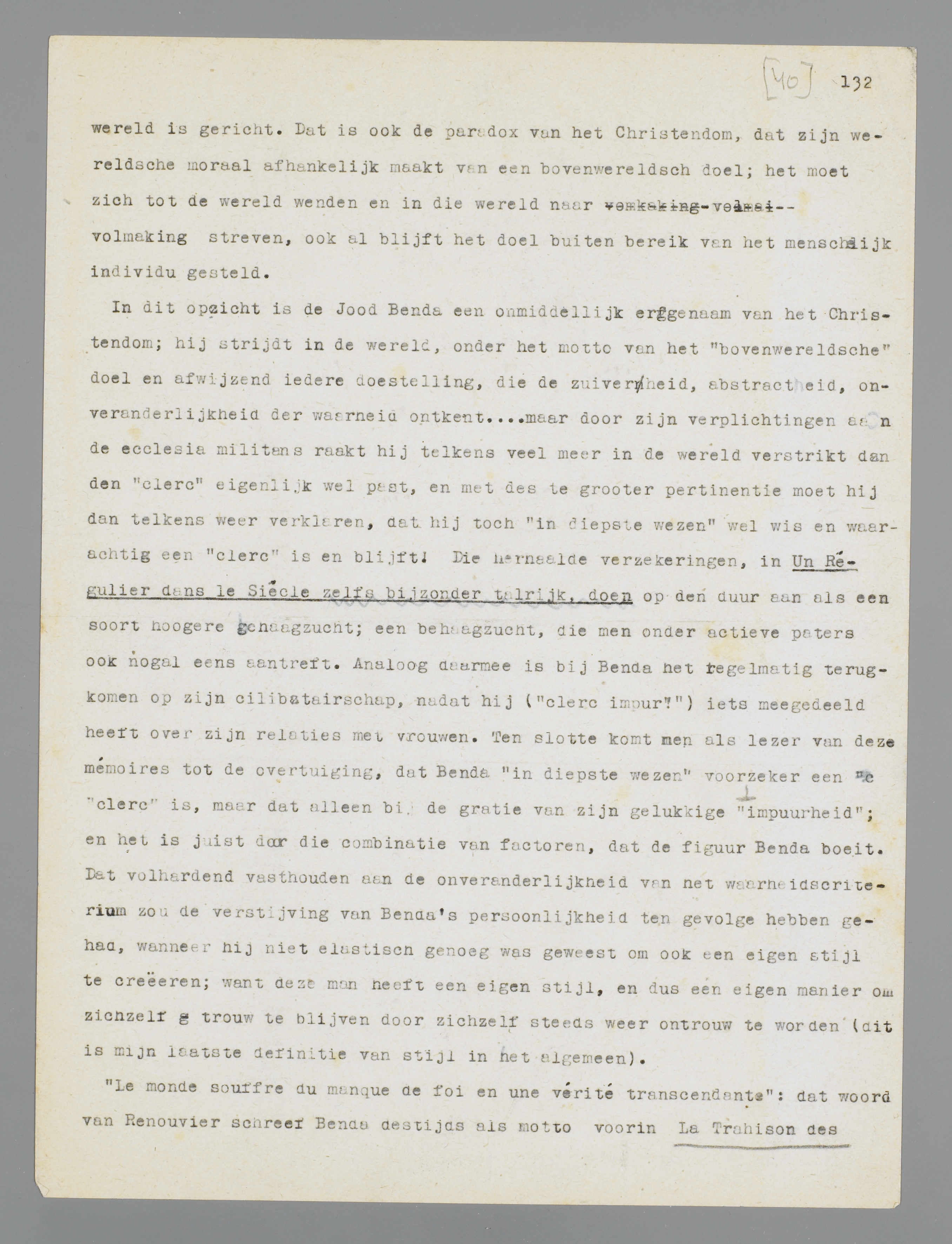 In dit opzicht is de Jood Benda een onmiddellijk erfgenaam van het Christendom; hij strijdt in de wereld, onder het motto van het ‘bovenwereldsche’ doel en afwijzend iedere doelstelling, die de zuiverheid, abstractheid, onveranderlijkheid der waarheid ontkent... maar door zijn verplichtingen aan de ecclesia militans raakt hij telkens veel meer in de wereld verstrikt dan den ‘clerc’ eigenlijk wel past, en met des te grooter pertinentie moet hij dan telkens weer verklaren, dat hij toch ‘in diepste wezen’ wel wis en waarachtig een ‘clerc’ is en blijft! Die herhaalde verzekeringen, in Un Régulier dans le Siècle zelfs bijzonder talrijk, doen op den duur aan als een soort hoogere behaagzucht; een behaagzucht, die men onder actieve paters ook nogal eens aantreft. Analoog daarmee is bij Benda het regelmatig terugkomen op zijn celibatairschap, nadat hij (‘clerc impur!’) iets meegedeeld heeft over zijn relaties met vrouwen. Ten slotte komt men als lezer van deze mémoires tot de overtuiging, dat Benda ‘in diepste wezen’ voorzeker een ‘clerc’ is, maar dat alleen bij de gratie van zijn gelukkige ‘impuurheid’; en het is juist door die combinatie van factoren, dat de figuur Benda boeit. Dat volhardend vasthouden aan de onveranderlijkheid van het waarheidscriterium zou de verstijving van Benda's persoonlijkheid ten gevolge hebben gehad, wanneer hij niet