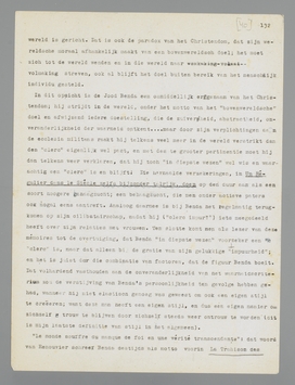 ‘William James distingue quelque part ceux qui sont nés une fois pour toutes et ceux qui un jour ont refait leur être, les once born et les twice born. Je suis, quant à la conception de l'instrument de vérité, le modèle des once born’, zegt Benda op de laatste pagina van zijn boek. Men zou grooten lust gevoelen om zich onder de ‘once born’ te scharen, ook al heeft men tot dusverre gemeend tot de ‘twice born’ te behooren; zoozeer weet de autobiographie van Benda te overreden tot verzet tegen alle individualistische pretenties, die wij plegen uit te spelen tegen de tradities, waaruit wij voortkomen. Een traditie, die zoo zuiver individueel wordt verantwoord, als dat bij Benda het geval is, behoeft men niet af te schudden...